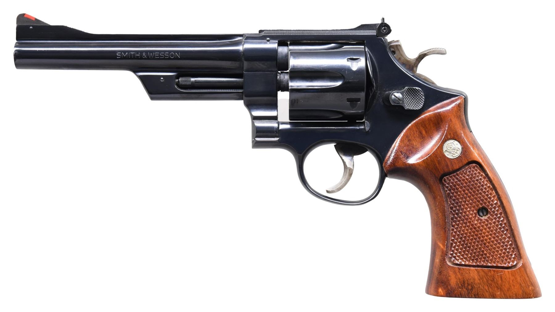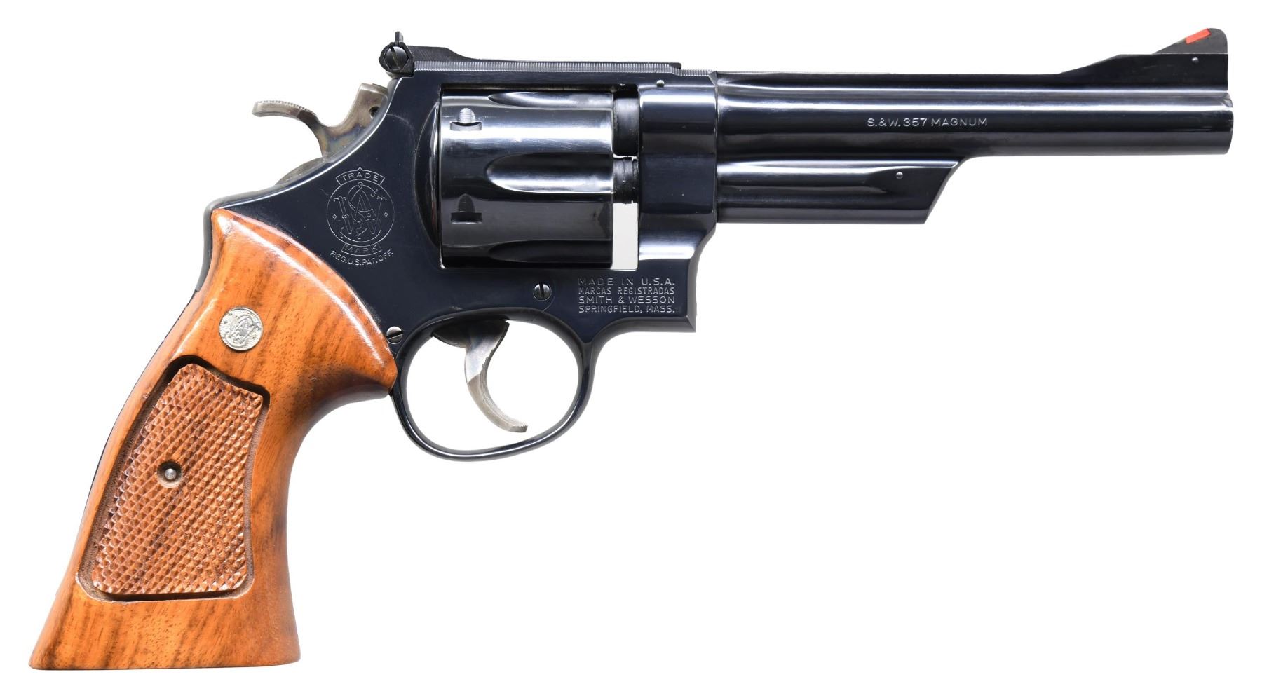 Cal. 357 Mag. S# N406609. Bbl. 6" pinned. Ramped serrated blade front sight with orange insert. Adjustable square notch rear sight with white outline. 1977-1978 made 27-2 revolver. Blued finish with case colored target hammer & trigger. Checkered hardwood target grips with silver S&W medallions. Right grip panel has a lighter appearance than left. UNATTACHED ACCESSORIES: right handed black nylon holster. CONDITION: grips show some handling wear & light flaking varnish. Trigger & hammer retain most of their case colors with some scattered operational wear. Balance of metal retains 97% factory quality restored blue with some a couple small spots of light oxidation, scattered light edge wear. Action functions properly when hand cycled. Bright near excellent bore. (25-3184/MJC). MODERN. $500-750.