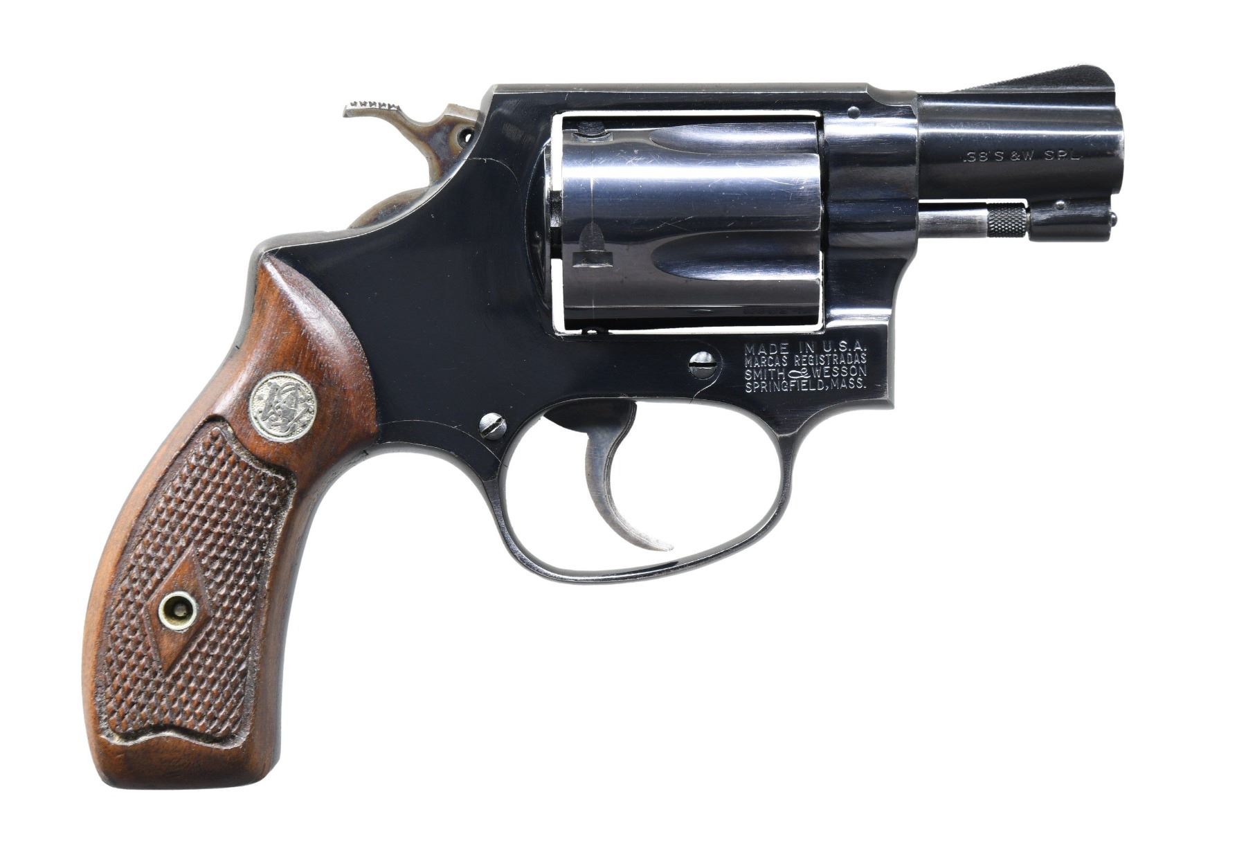 Cal. 38 Spcl. S# 418657. Bbl. 2". Ramped serrated blade front sight. Fixed rear sight. 5-shot cyl. 1960's made no-dash 36 revolver. Blued finish with case colored hammer & trigger. Checkered walnut diamond center grips with matching numbered right panel & silver S&W medallions. CONDITION: grips show a chip at back of left panel & some handling marks. Hammer & trigger retain most of their case colors with some operational wear & light oxidation. Balance of metal retains 92% original blue with scattered light oxidation, some edge war & fading. Action functions properly when hand cycled. Bright near excellent bore. (25-4091/MJC). CURIO. $400-600.
