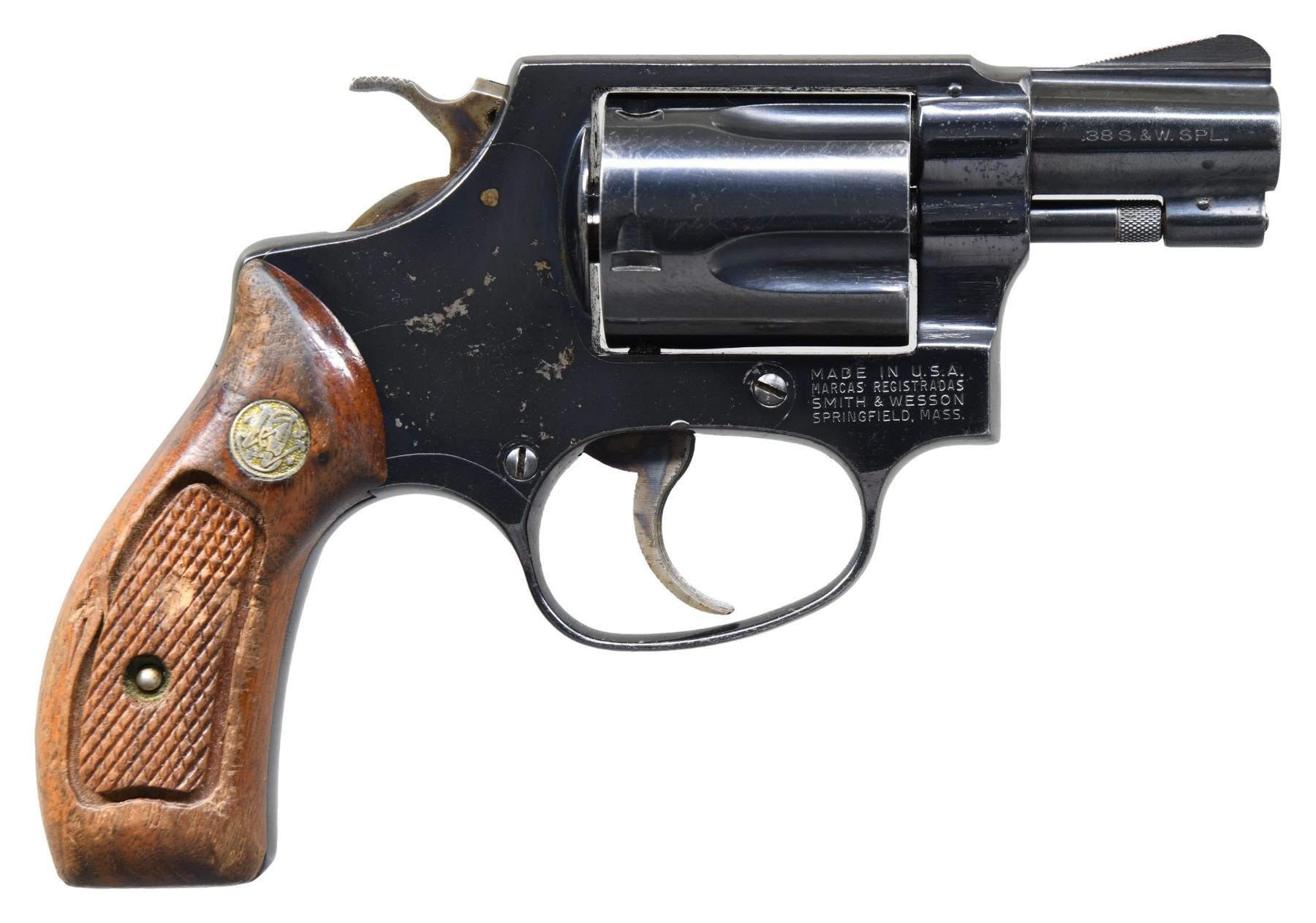 Cal. 38 Spl. S# J313579. Bbl. 2" pinned. Ramped serrated blade front sight with added red paint. Fixed rear sight. 1975-1976 made Model 36 revolver. 5-shot cyl. Inside of frame marked "G14". Blued finish with case colored hammer & trigger. Checkered walnut grips with silver S&W medallions & matching numbered right panel. Left panel has a much lighter appearance than right & what appears to be an ink Social Security Number. CONDITION: right grip panel show several notable dents with flaking finish, dings & handling marks. Left panel shows scattered flaking & handling marks. Trigger & hammer retain most of their case colors with some scattered oxidation. Balance of metal retains 85% factory quality reblue with a couple small dings, scattered light oxidation, edge wear and fading. Action functions properly when hand cycled. Very good bore with strong rifling. (25-3186/MJC). MODERN. $300-500.