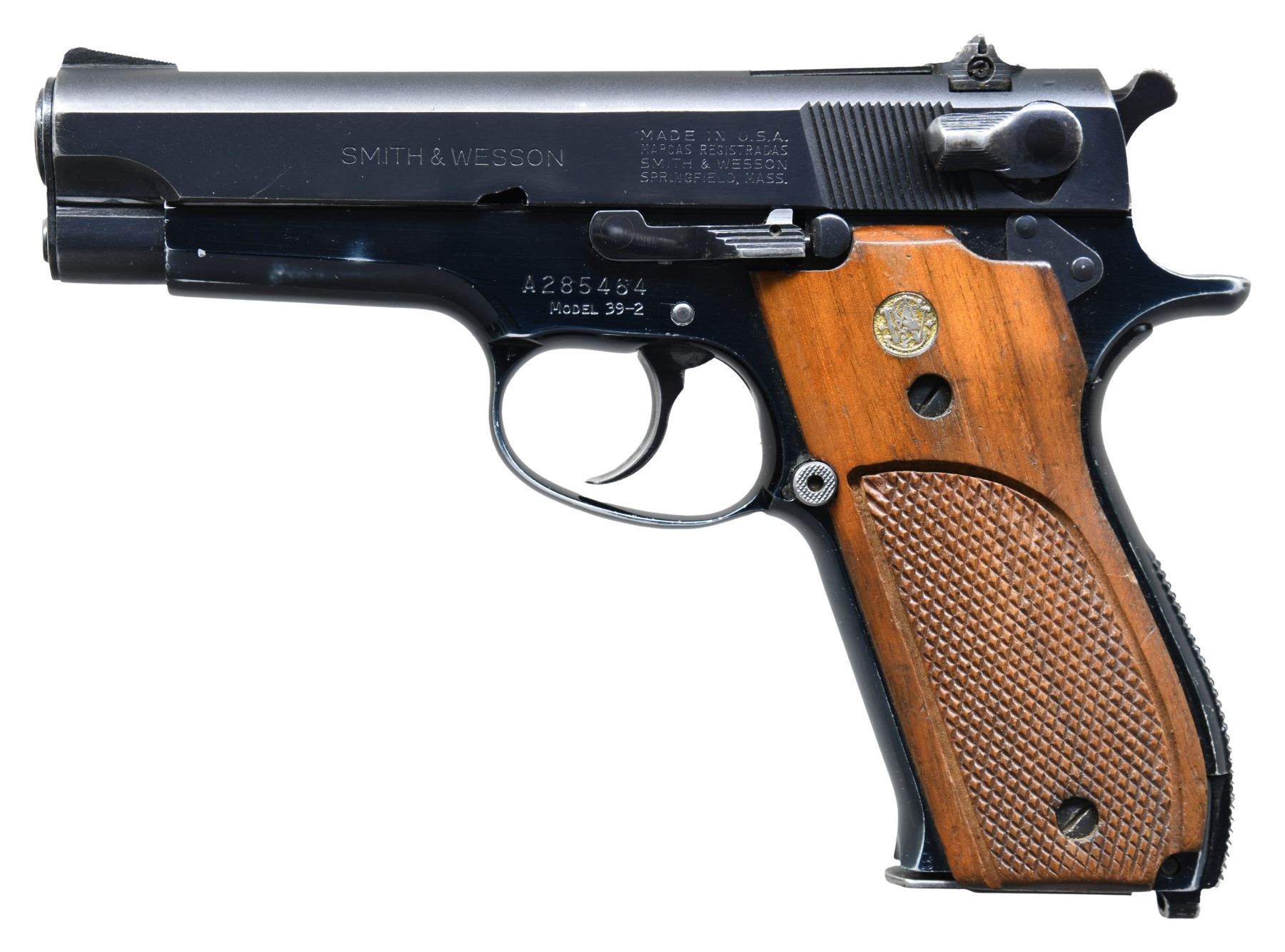 Cal. 9mm Luger. S# A285464. Bbl. 4". Ramped serrated blade front sight. Adjustable square notch rear sight. 1975-1976 made S&W 39-2 pistol. Manual safety that also acts as a decocker. Black anodized frame. Checkered walnut grips with silver S&W medallions. MAGS: 3-8 rd. all marked "S&W" on floorplate. CONDITION: grips show scattered handling marks. Metal retains 93% original anodized & blue finishes with scattered flaking, edge & handling wear. Action functions properly when hand cycled. Bright near excellent bore. (25-4090/MJC). MODERN. $500-700.
