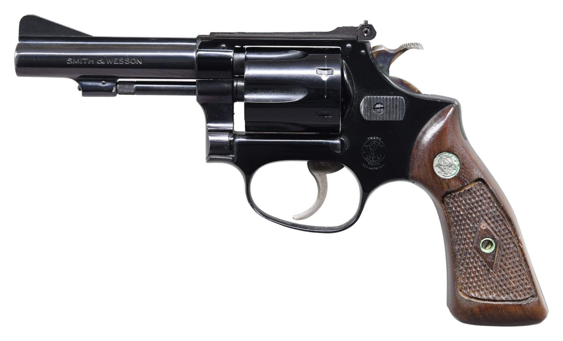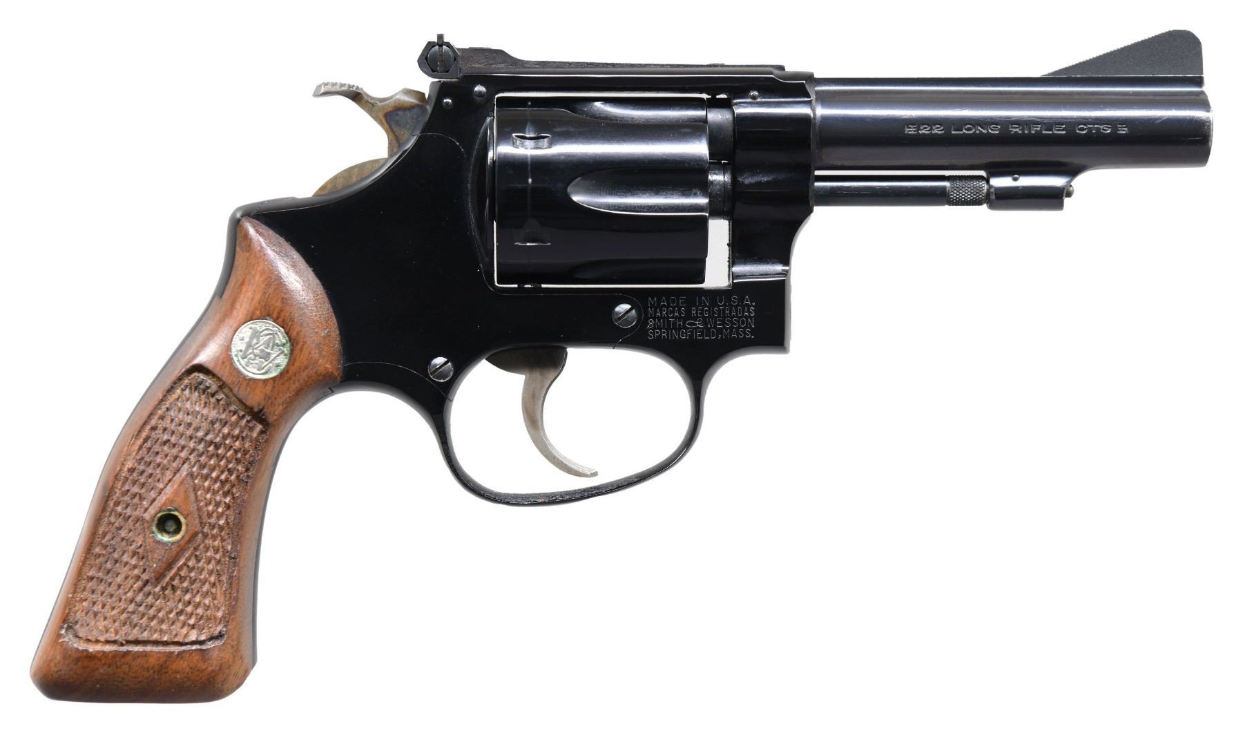 Cal. 22 LR. S# 50207. Bbl. 3 1/2" pinned. Ramped serrated blade front sight. Adjustable square notch rear sight. 1950's made Model 43 kit gun. Blued & anodized finishes. Checkered walnut diamond center grips with matching numbered right panel & silver S&W medallions. UNATTACHED ACCESSORIES: 1955 dated S&W invoice listing 5 kit guns amongst several other revolvers to Kruse  Hardware of Cincinnati, Ohio.  CONDITION: grips show some light dings & handling marks. Hammer & trigger retain most of their case colors with some fading to gray, operational wear & light oxidation. Balance of metal retains 97% blue & anodized finishes with some light edge wear & minor handling marks. Action functions properly when hand cycled. Very good bore with strong rifling. PROVENANCE: From the Estate of Jon Thomas, Gunsport, LTD. (25-1095/MJC). CURIO. $500-800.