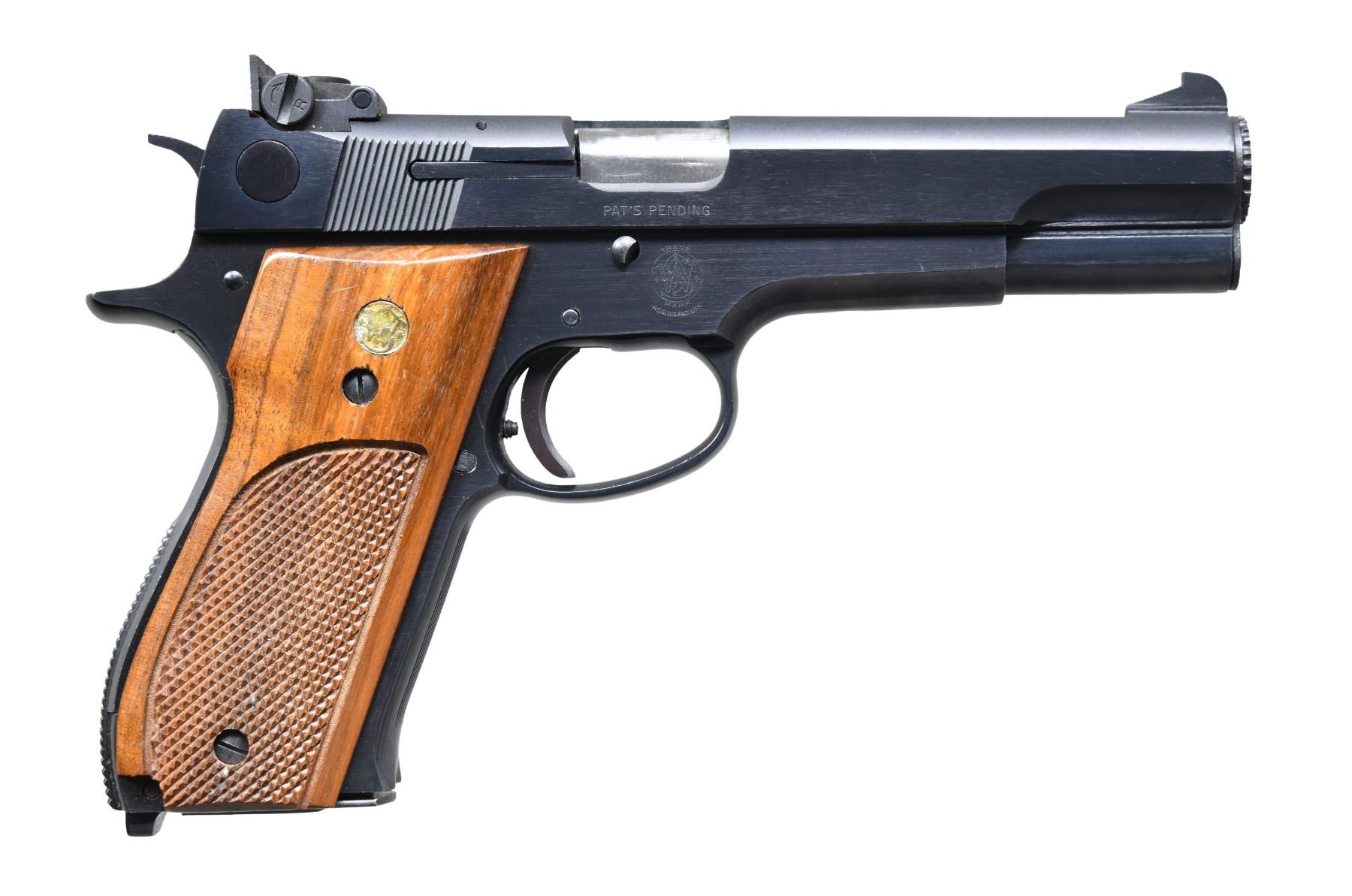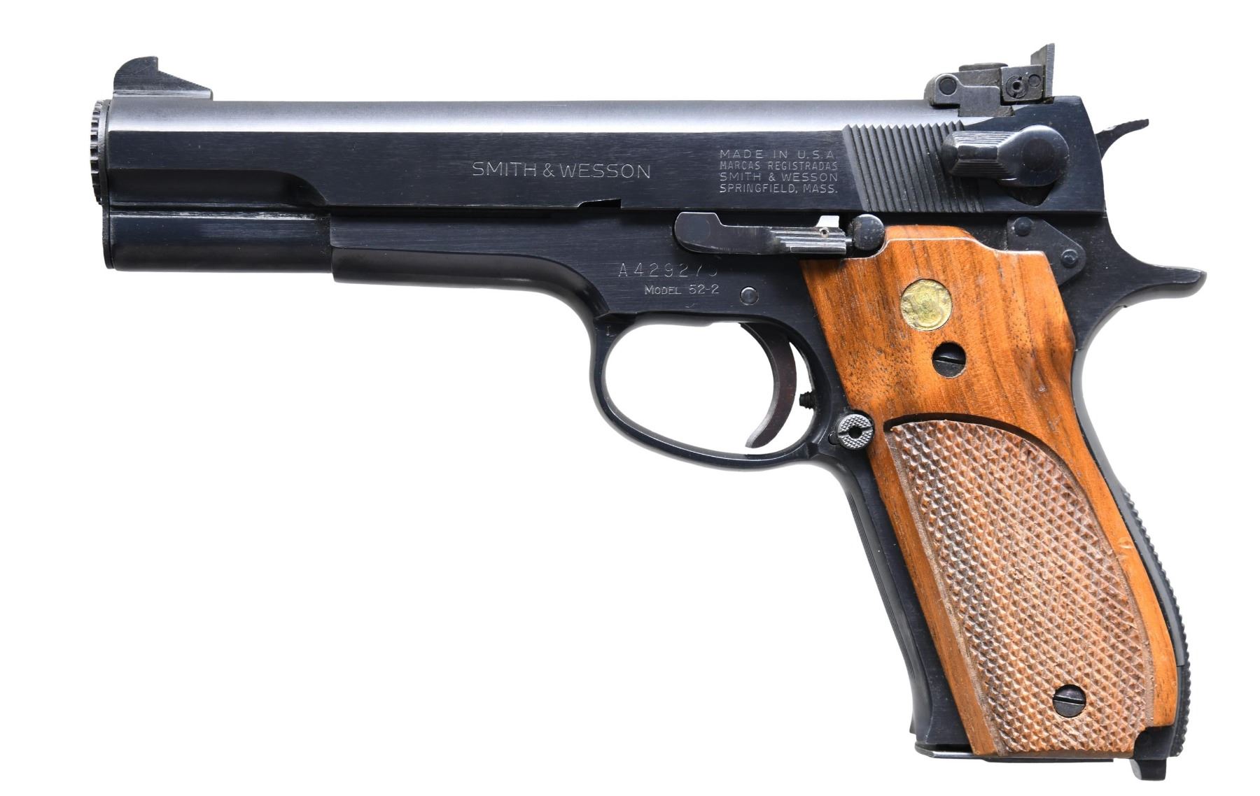 Cal. 38 Spl. Midrange. S# A429279. Bbl. 5". Patridge front sight. Adjustable square notch rear sight. Target semi-auto pistol chambered in 38 Special wadcutter made in 1977-1978. Blued finish. Hardwood checkered grips with silver S&W medallions. MAGS: 1-5 rd. CONDITION: grips show some light checkering wear & a few handling marks. Metal retains 98% original blue with some flaking on lanyard, a couple spots of light oxidation & some light edge wear. Mag does not appear to hold slide back but action is otherwise functional when hand cycled. Bright near excellent bore. (25-3278/MJC). MODERN. $400-600.