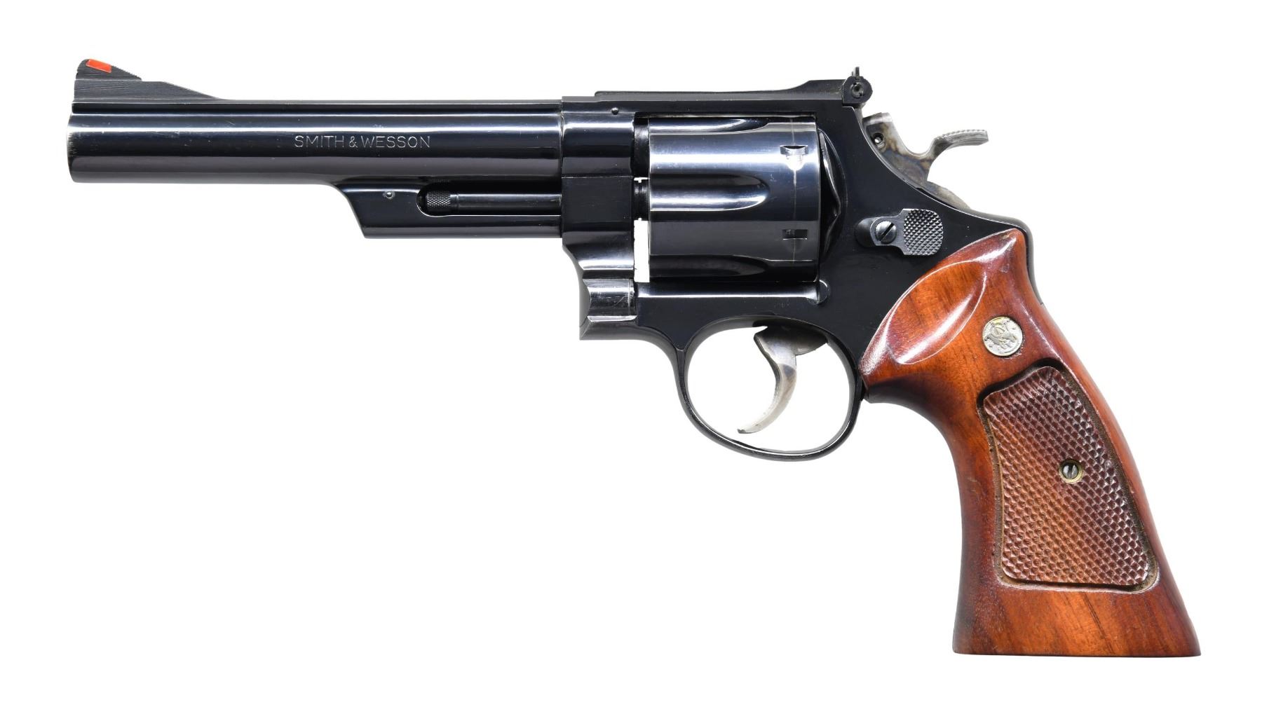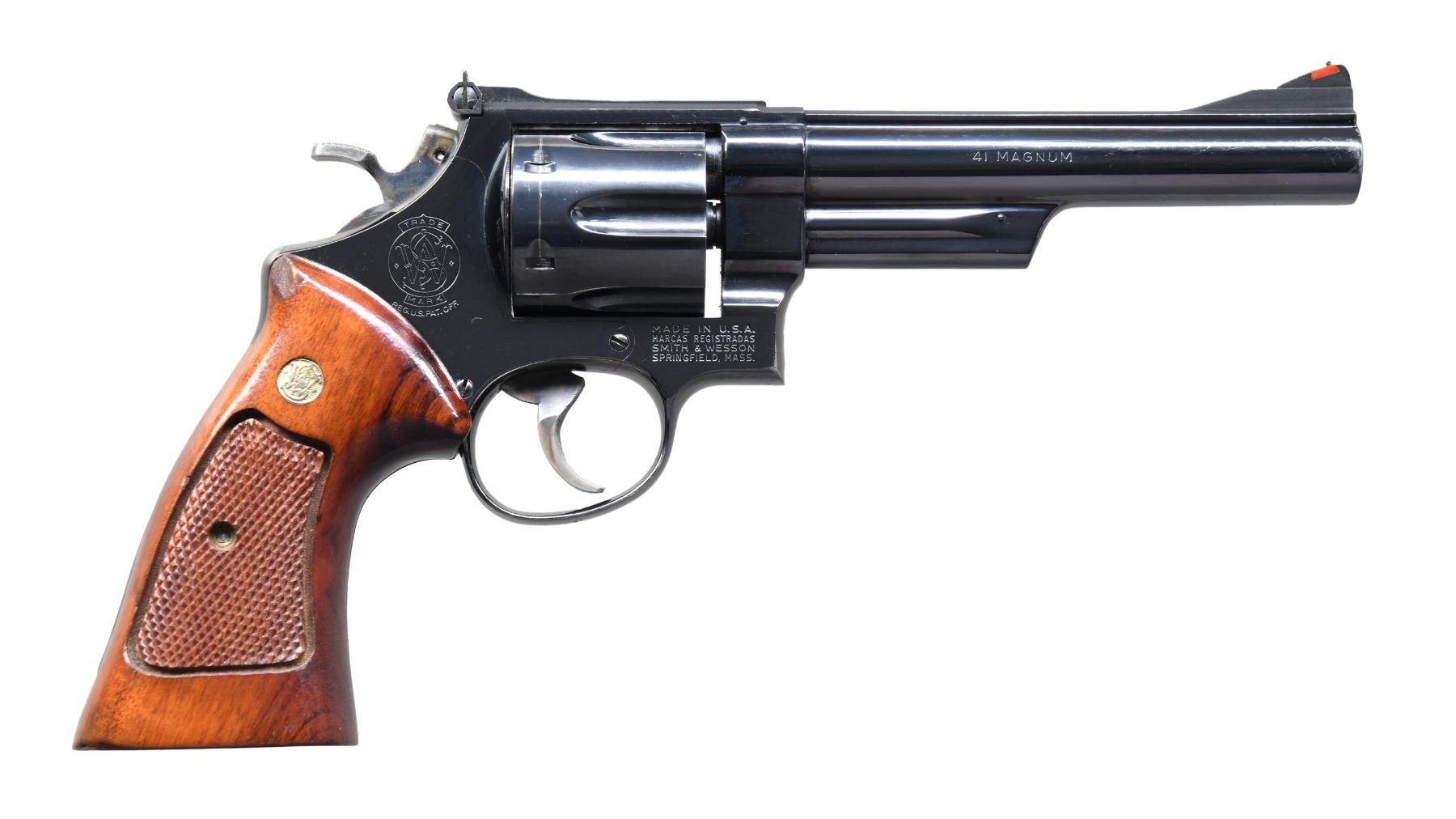 Cal. 41 Mag. S# N806197. Bbl. 6" pinned. Ramped serrated blade front sight with orange insert. Adjustable square notch rear sight with white outline. No-dash Model 57 made 1980-1983. Blued finish with case colored target hammer & trigger. Checkered target grips with silver S&W medallions. CONDITION: grips show a notable ding at top rear of right panel, some flaking finish & scattered handling marks. Hammer & trigger retain strong amounts of their case colors with some fading to gray & operational wear. Balance of metal retains 95% original blue with some edge wear, handling marks & light oxidation on trigger guard. Action functions properly when hand cycled. Very good plus bright bore. (25-3262/MJC). MODERN. $600-900.