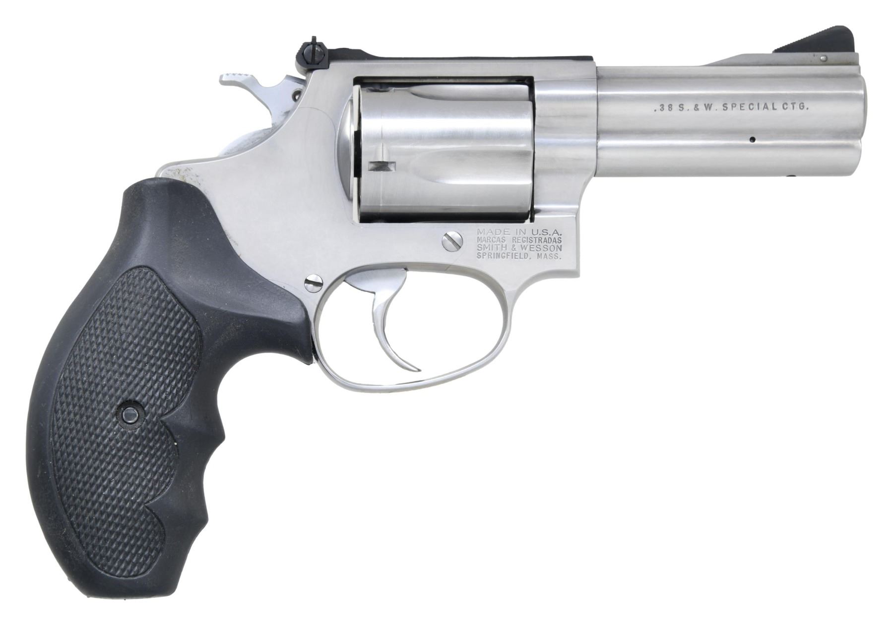 Cal. 38 Spl. S# BPY6451. Bbl. 3". Ramped serrated blade front sight. Adjustable square notch rear sight. 5-shot cyl. Stainless finish with hard chrome hammer & trigger. Unmarked black rubber finger groove grips. CONDITION: grips show some white staining & scattered handling wear. Metal shows some handling marks & operational wear. Action functions properly when hand cycled. Very good bright bore. (25-2425/MJC). MODERN. $300-400.