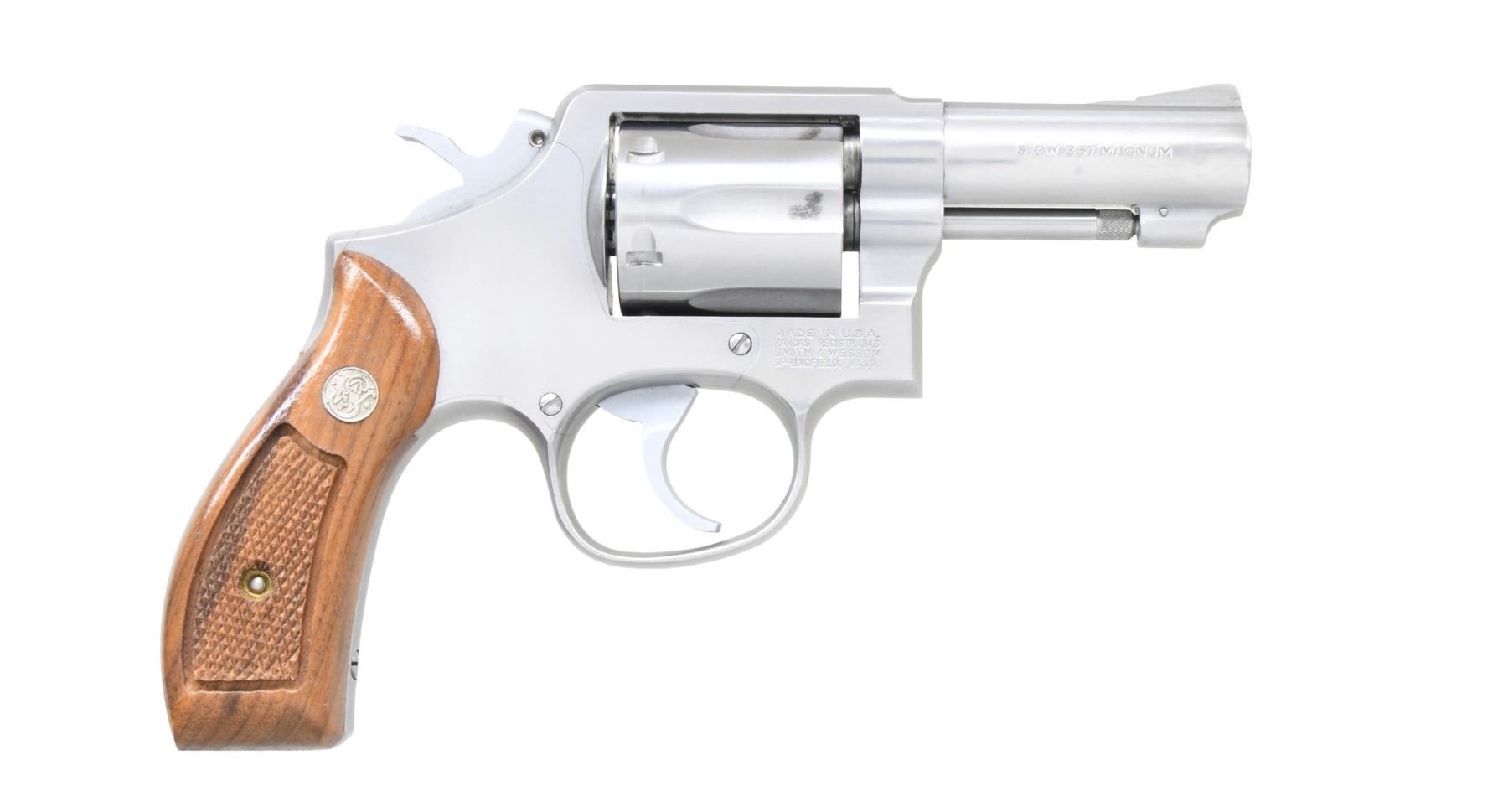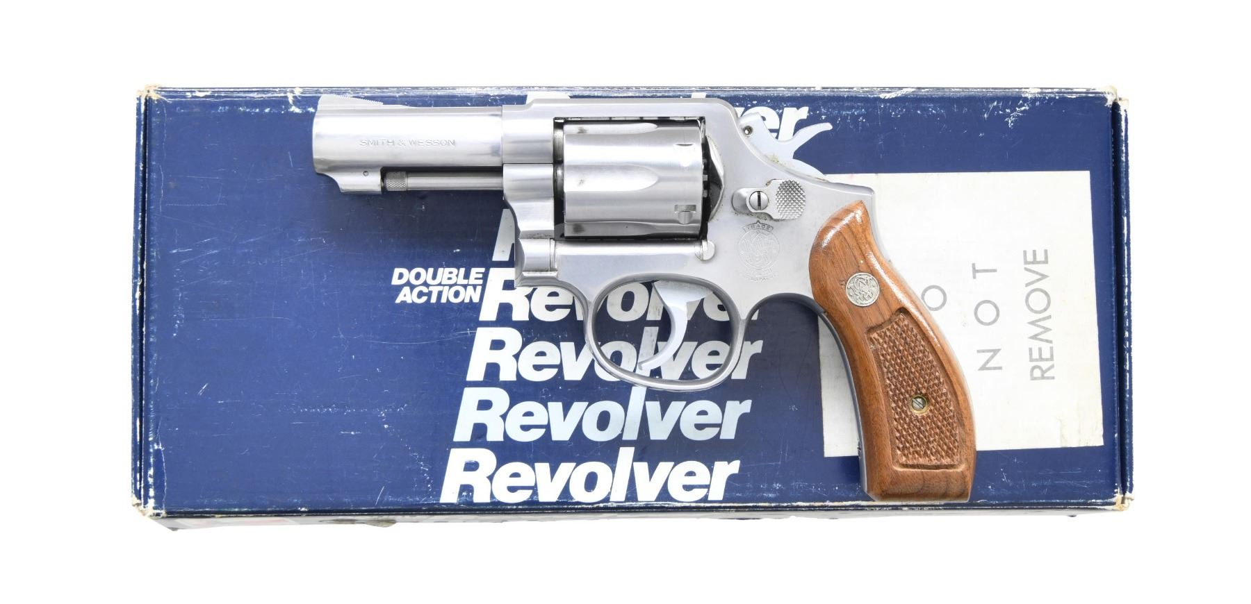 Cal. 357 Mag. S# AYT2664. Bbl. 3". Ramped serrated blade front sight. Fixed rear sight. 6-shot cyl. Stainless finish with hard chrome hammer & trigger. Checkered walnut grips with silver S&W medallions. UNATTACHED ACCESSORIES: matching numbered factory box, manual, cleaning rod & bore brush. CONDITION: grips show minor handling wear. Metal shows some operational and handling wear with carbon buildup on cyl. face. Action functions properly when hand cycled. Near excellent bright bore. (25-3244/MJC). MODERN. $500-700.