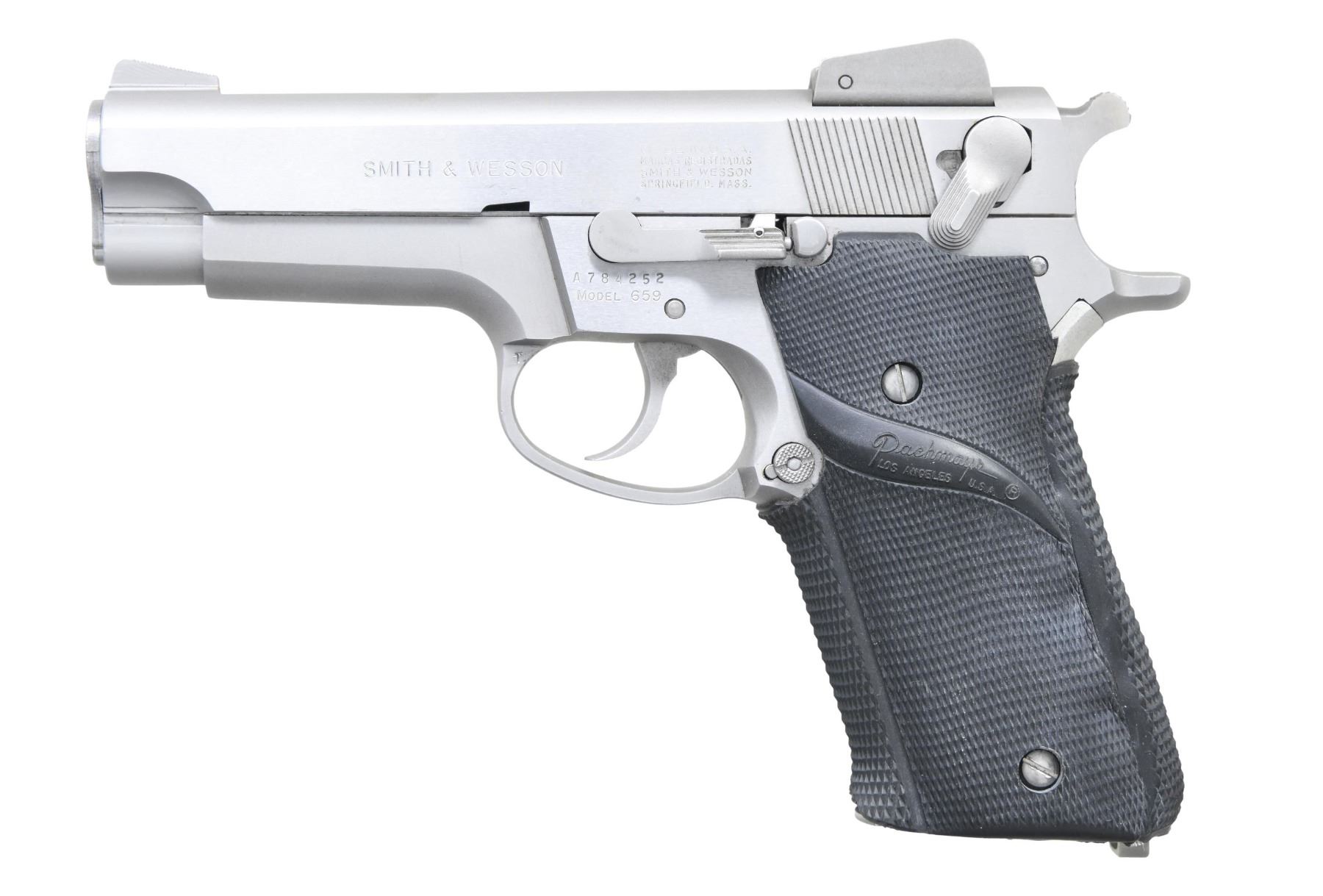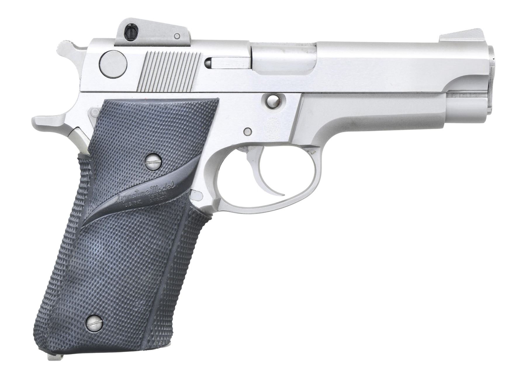 Cal. 9mm Para. S# A784252. Bbl. 4" ramped serrated blade front sight. Adjustable square notch rear sight. Right handed safety that also acts as a decocker. Stainless finish. Pachmayr Signature Model grips. MAGS: 2-14 rd. CONDITION: grips show some handling wear, white staining & a warped area on left side. Metal shows some light scratches & handling marks. Action functions properly when hand cycled. Near excellent bright bore. (25-3233/MJC). MODERN. $400-600.