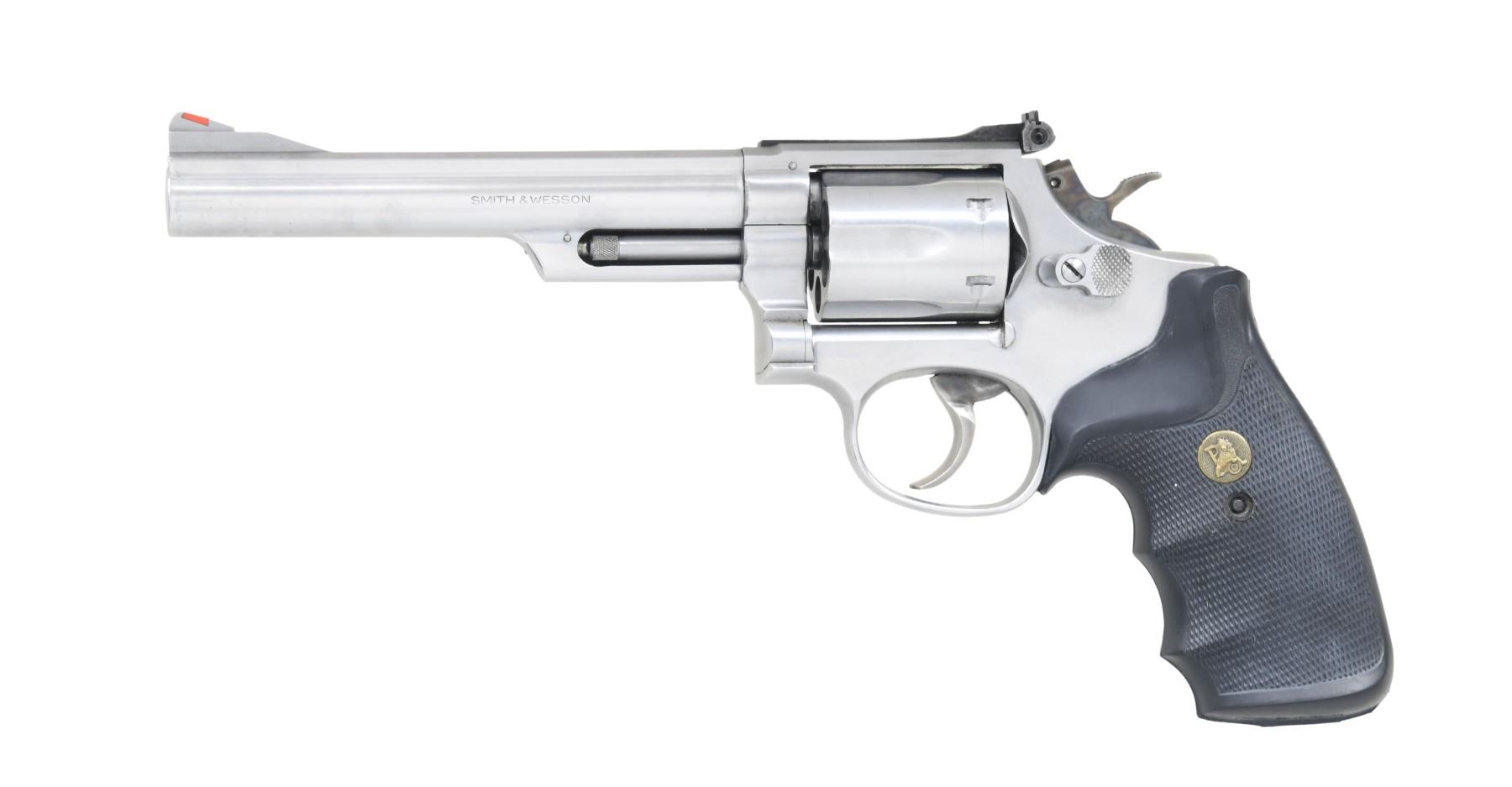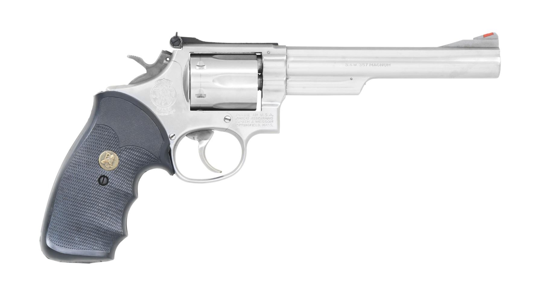 Cal. 357 Mag. S# 65K0670. Bbl. 6" pinned. Ramped serrated blade front sight with orange insert. Adjustable square notch rear sight. 6-shot cyl. Stainless finish with case colored hammer & smooth wide face combat trigger. Checkered black rubber Pachmayr grips. CONDITION: grip model name is worn & illegible. Grips otherwise show some handling marks & checkering wear. Hammer & trigger retain most of their case colors with operational wear & thinning. Balance of metal appears mostly bright with carbon buildup on cyl. face, some oxidation staining on high edges, light scratches, handling marks, edge & operational wear. Action functions properly when hand cycled. Bright near excellent bore. (25-3261/MJC). MODERN. $400-600.