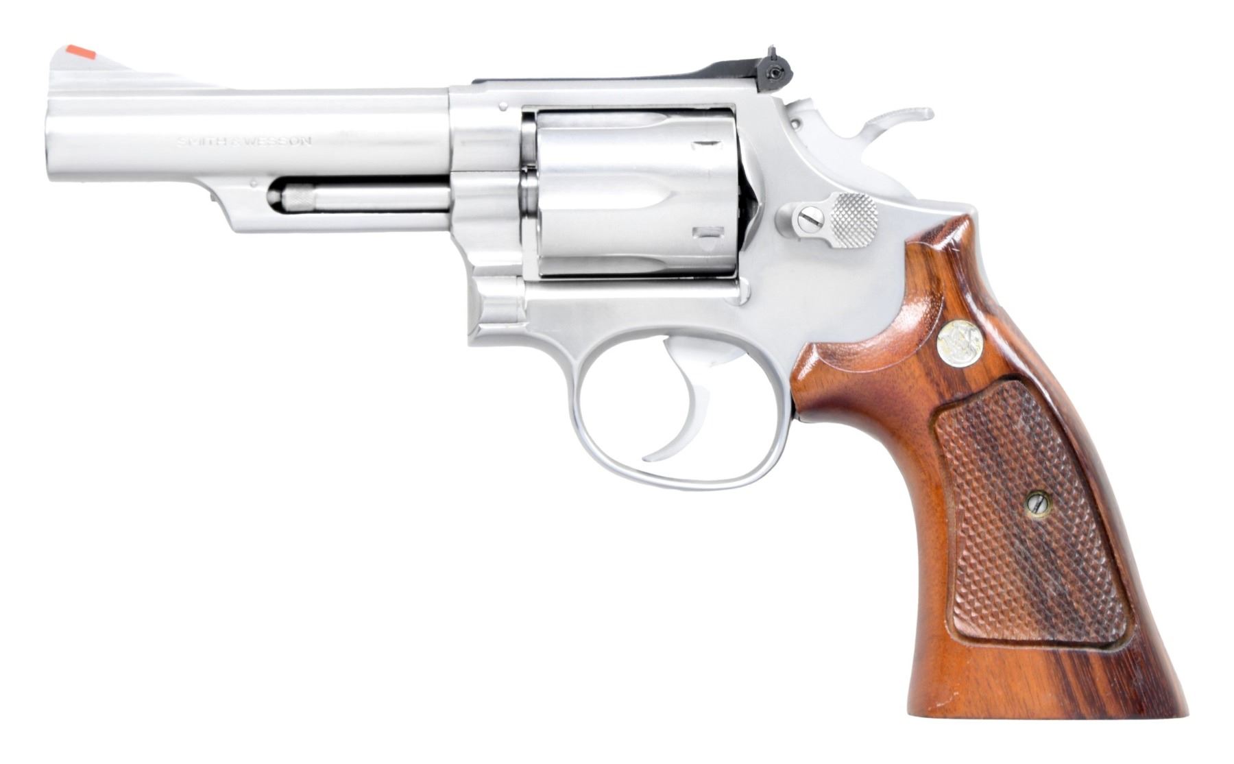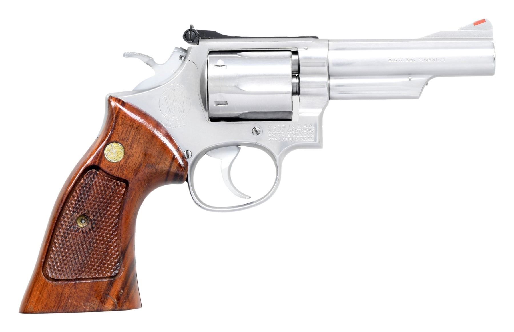 Cal. 357 Mag. S# 47K5577. Bbl. 4" pinned. Ramped serrated blade front sight with orange insert. Adjustable square notch rear sight with white outline. 66-1 revolver made 1978-1979. 6-shot recessed cyl. Stainless finish with hard chrome smooth face target trigger & hammer. Checkered hardwood target grips with silver S&W medallions. CONDITION: grips show a tiny shallow chip at bottom of left panel & some scattered handling marks. Hammer & trigger show some light operational wear. Balance of metal shows some scattered light scratches, operational, edge & handling wear. Action functions properly when hand cycled. Bright near excellent bore. (25-3625/MJC). MODERN. $400-600.