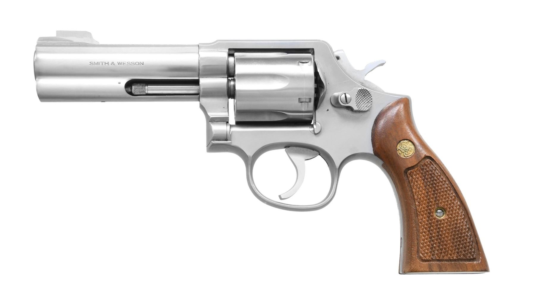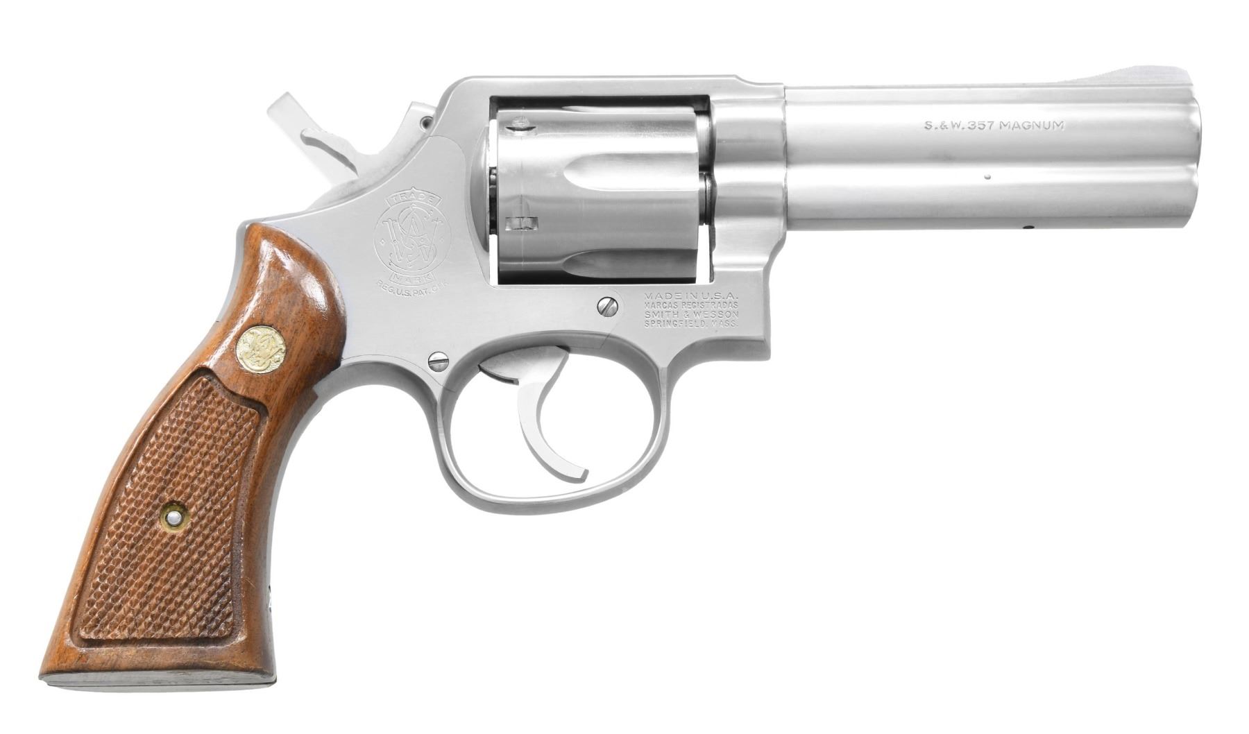 Cal. 357 Mag. S# AAE4085. Bbl. 4" with full underlug. Ramped serrated blade front sight. Fixed rear sight. 6-shot cyl. Stainless finish with hard chrome trigger & hammer. Checkered walnut grips with silver S&W medallions. CONDITION: grips show some flaking on bottom & a few light handling marks. Metal shows some minor oxidation specks under grips, light handling & operational wear. Action functions properly when hand cycled. Bright near excellent bore. (25-3245/MJC). MODERN. $500-700.