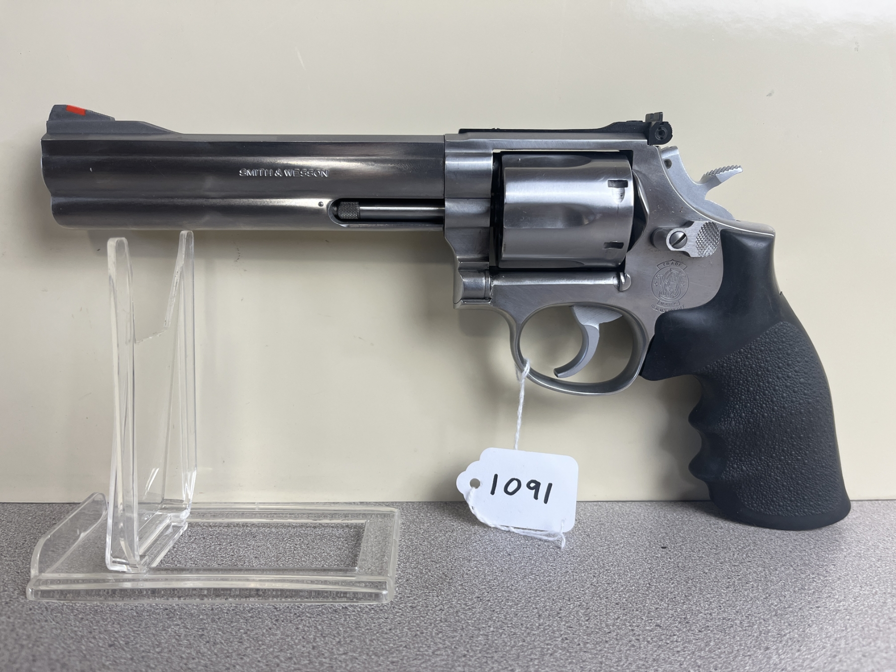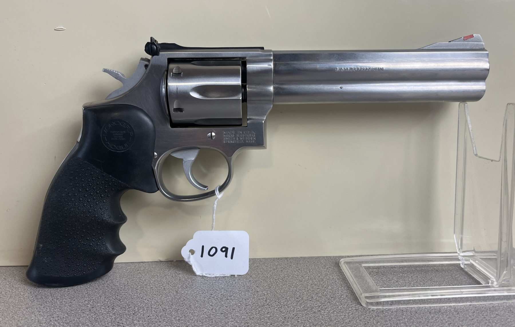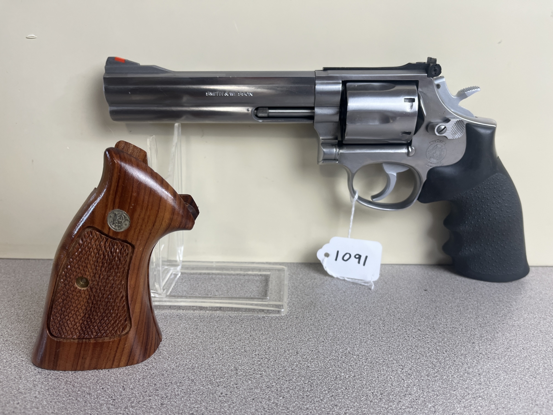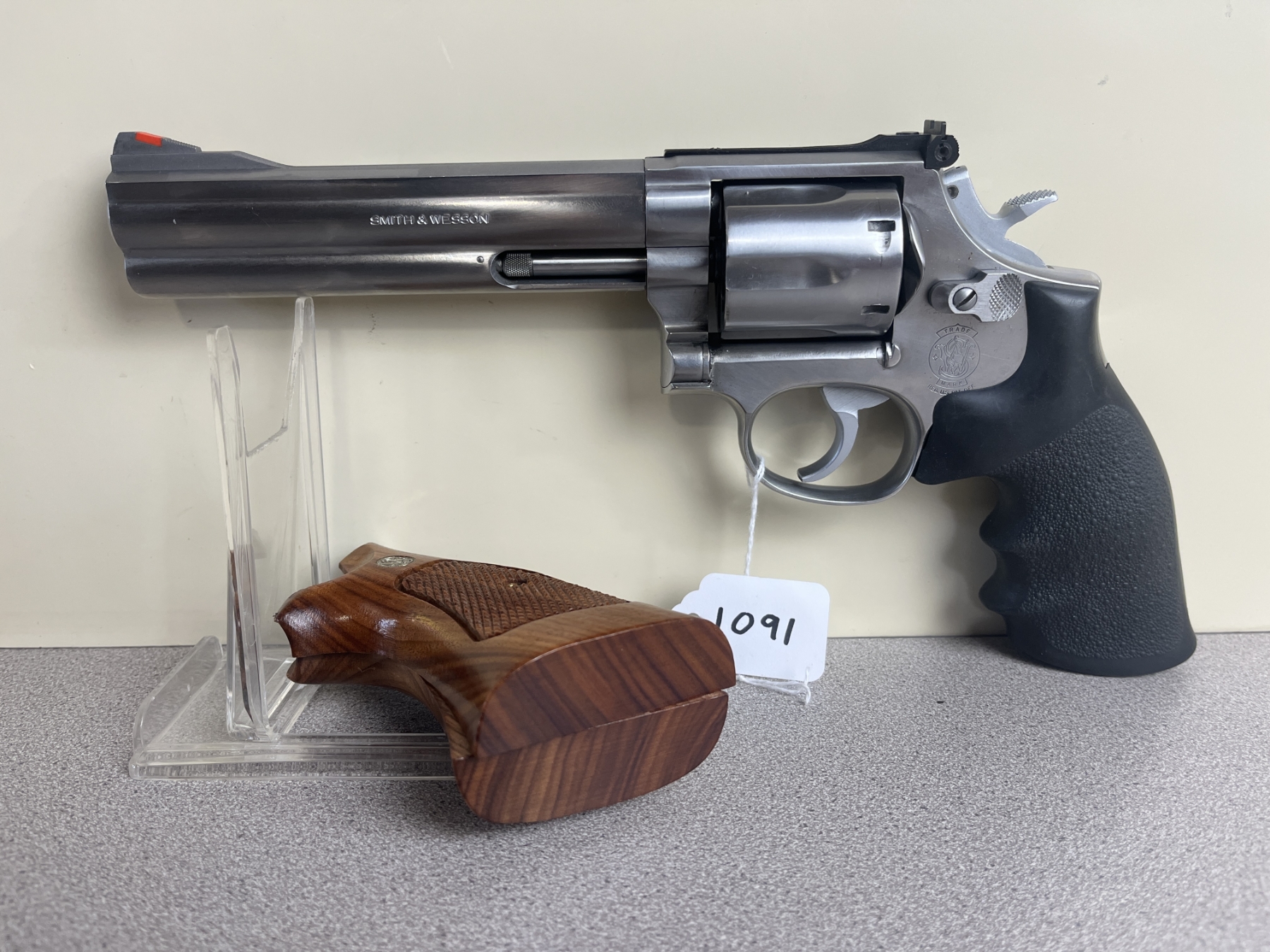 CONDITION: VG OVERALL INCL BORE. SPECS: 152MM BBL. 6 SHOT REVOLVER. NICKEL FINISH. EXTRAS: SPARE WOOD GRIPS. S/N: BPH8992