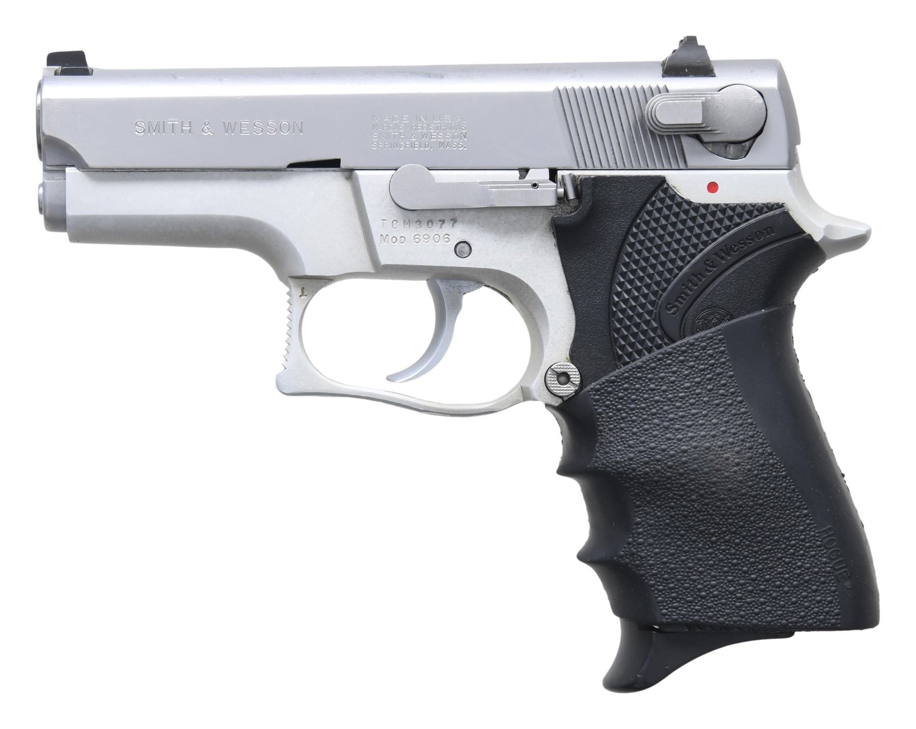 Cal. 9x19. S# TCM3077. Bbl. 3 1/2". Three dot sights. Ambi decocker that also acts as a safety. Stainless finish. Black checkered S&W grips with finger groove grip sleeve. MAGS: 4-12 rd. Mags have black marker on spines identifying what they are. CONDITION: grips show some light handling marks. Metal shows scattered light scratches, handling marks & edge wear. Action functions properly when hand cycled. Bright near excellent bore. (25-3365/MJC). MODERN. $350-550.