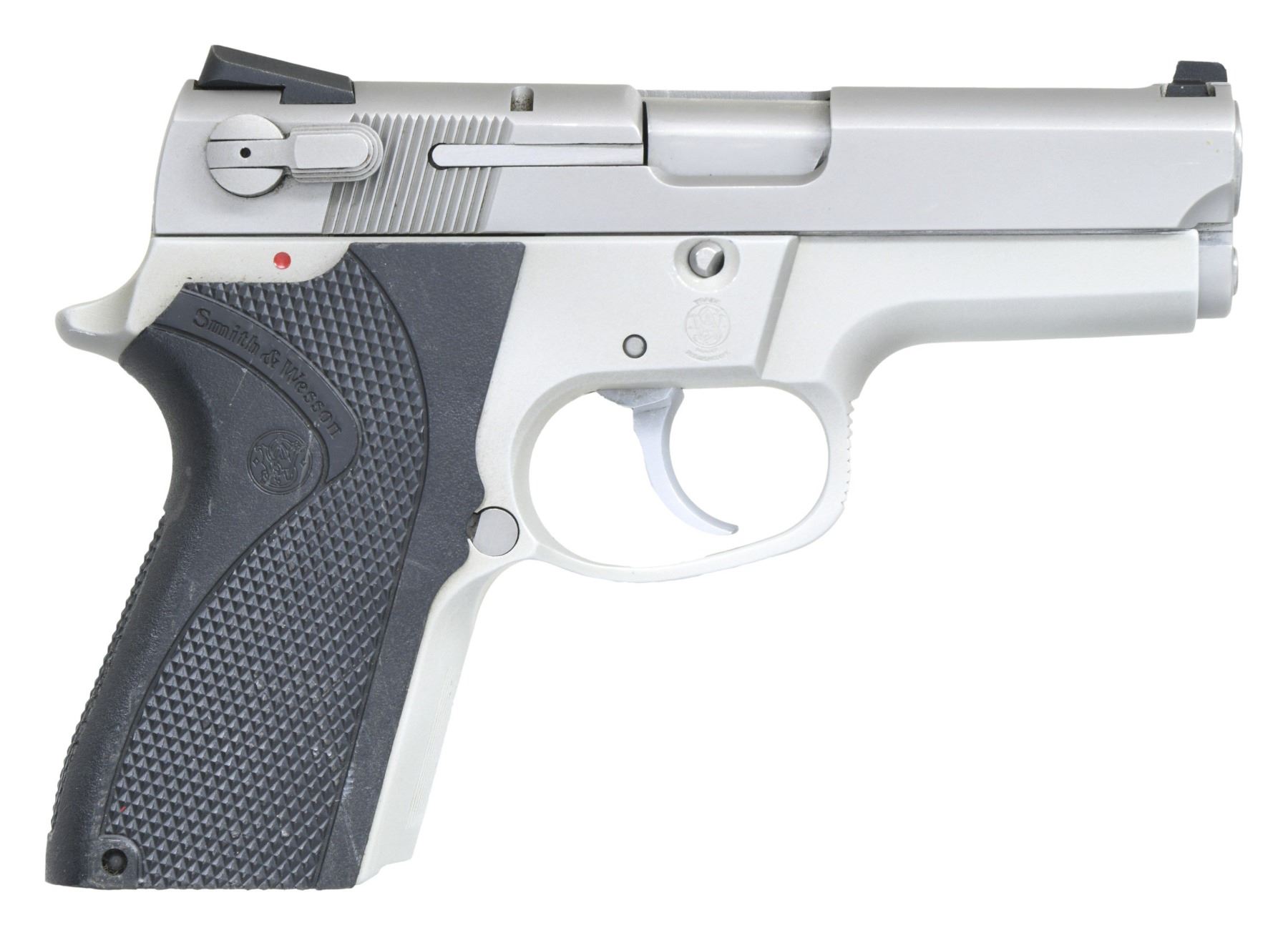 Cal. 9mm Para. S# TVB8122. Bbl. 3 1/2". Three dot sights. Bobbed hammer. Ambi manual safety that also acts as a decocker. Stainless finish. Checked black S&W grips. MAGS: none present. CONDITION: grips show scattered handling marks & some checkering wear. Metal shows scattered edge wear & handling marks. Action appears to function properly. Very good plus bright bore. (25-3645/MJC). MODERN. $350-550.
