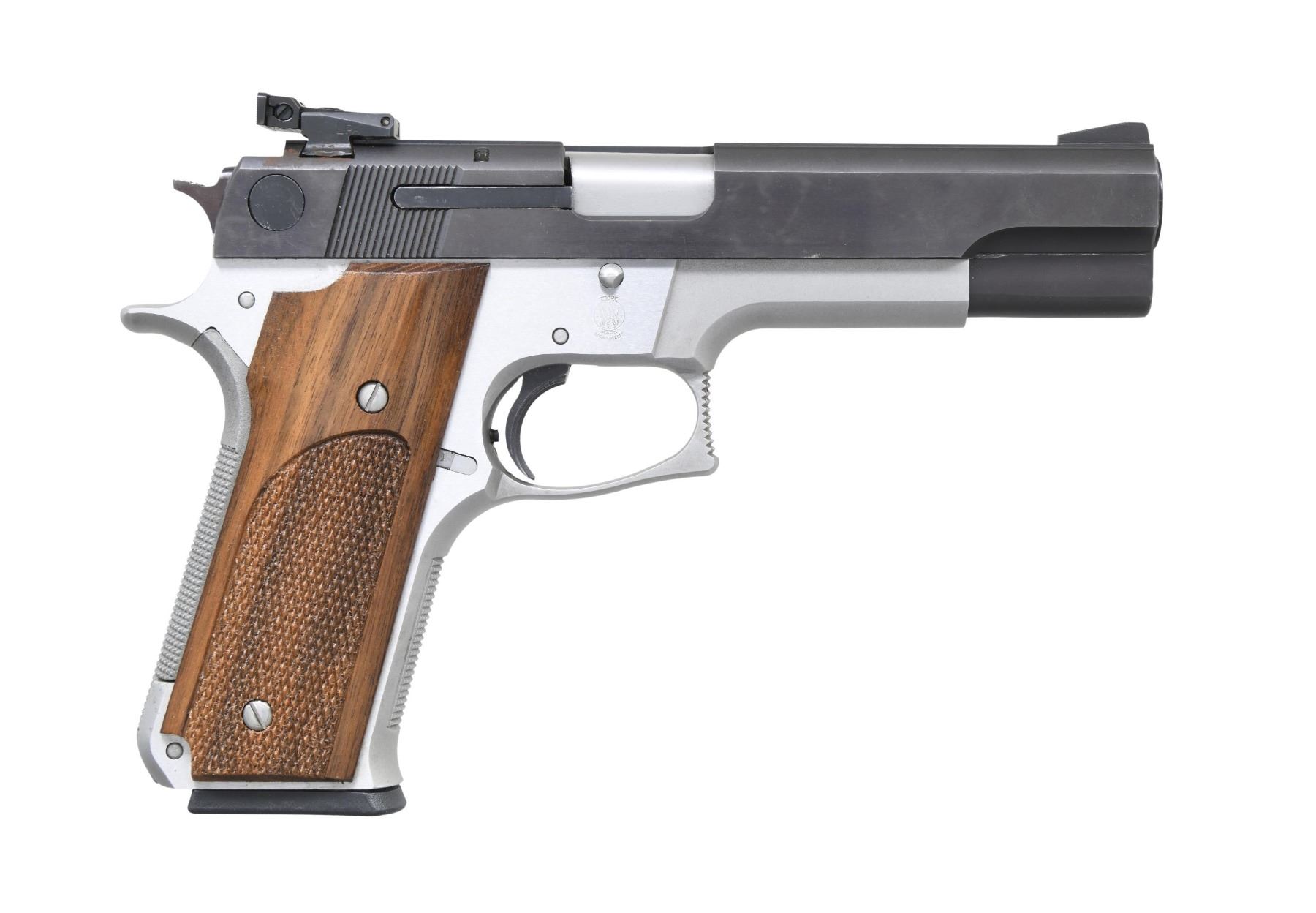 Cal. 45 ACP. S# TBN3381. Bbl. 5". Ramped serrated blade front sight. Adjustable LPA rear sight. Single action semi auto target pistol. Right handed safety. Enlarged mag release. Blued slide assembly. Stainless frame. Checkered walnut grips. MAGS: 1-8 rd. UNATTACHED ACCESSORIES: matching numbered factory box. CONDITION: grips show minor handling wear. Metal shows some oxidation specks on grip straps, scattered light handling marks & minor edge wear. Action functions properly when hand cycled. Bright near excellent bore. (25-3235/MJC). MODERN. $450-600.