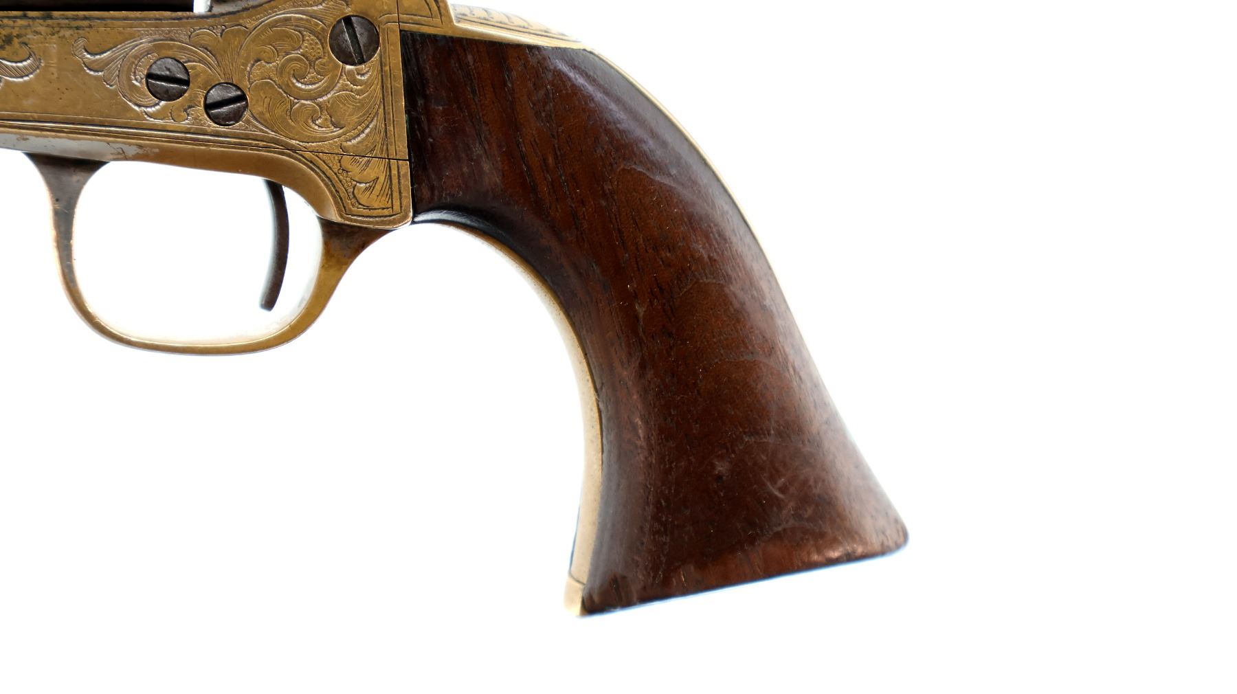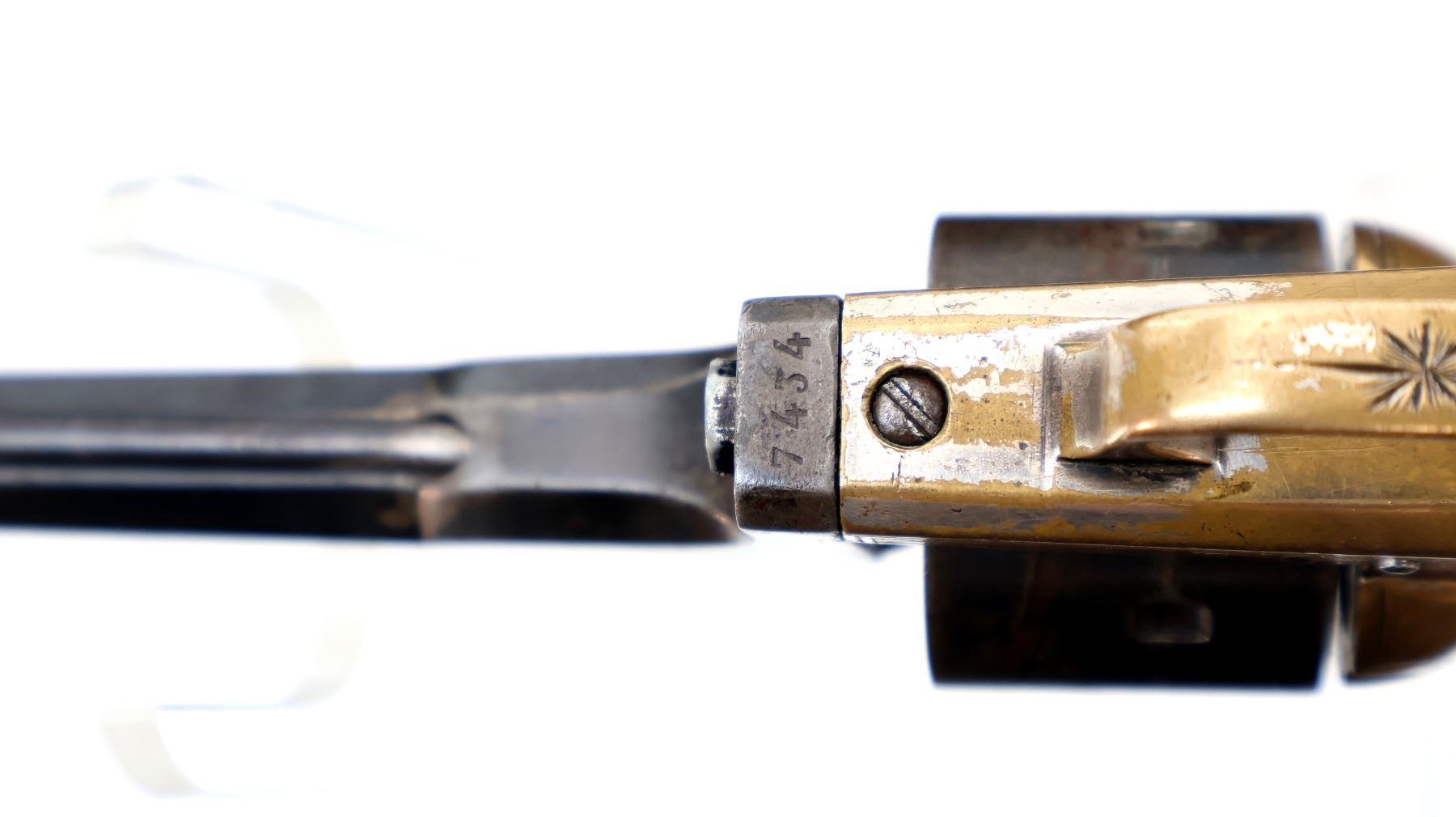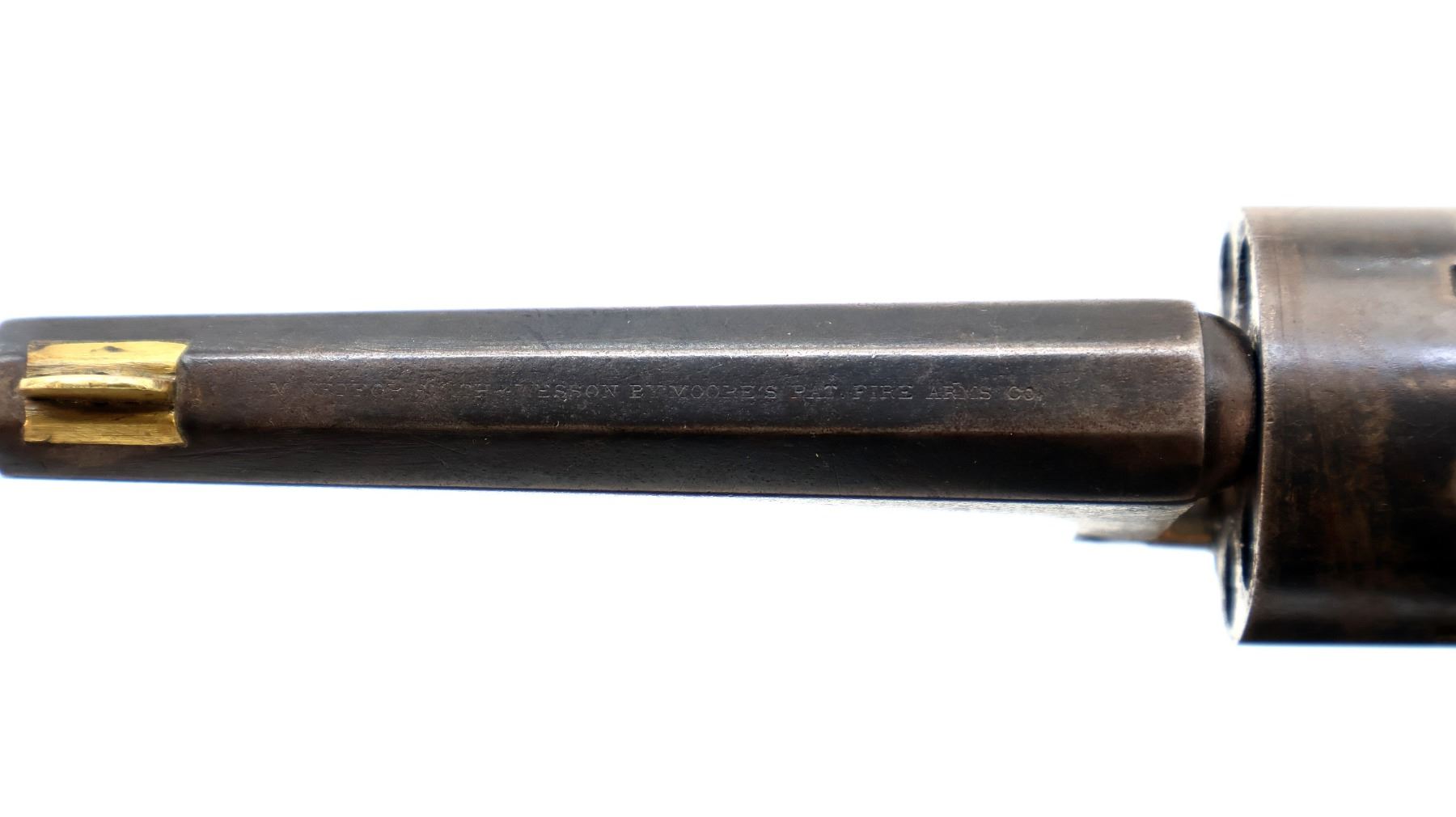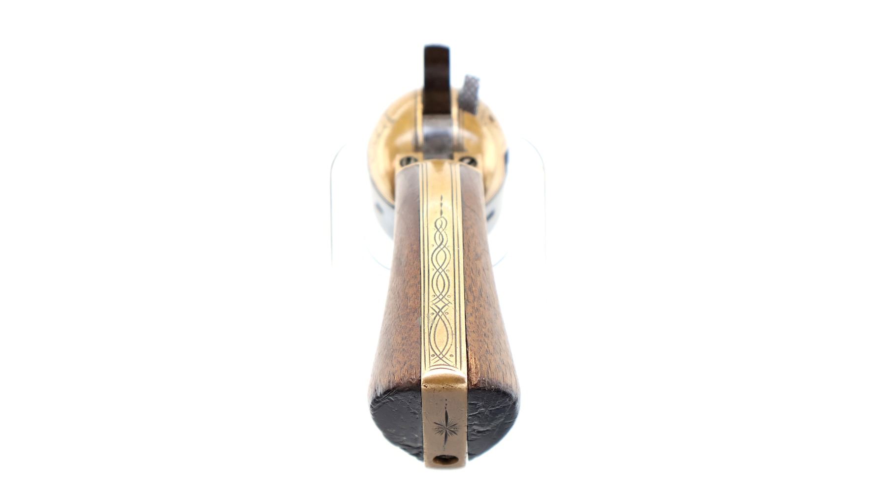 Main Description: Functions mechanically as designed. Blade front sight, reblued octagon barrel and smooth cylinder, barrel retaining screw is a replacement, checkered spur hammer and smooth trigger, engraved brass frame with traces of Nickel finish. Two piece smooth wood grips.