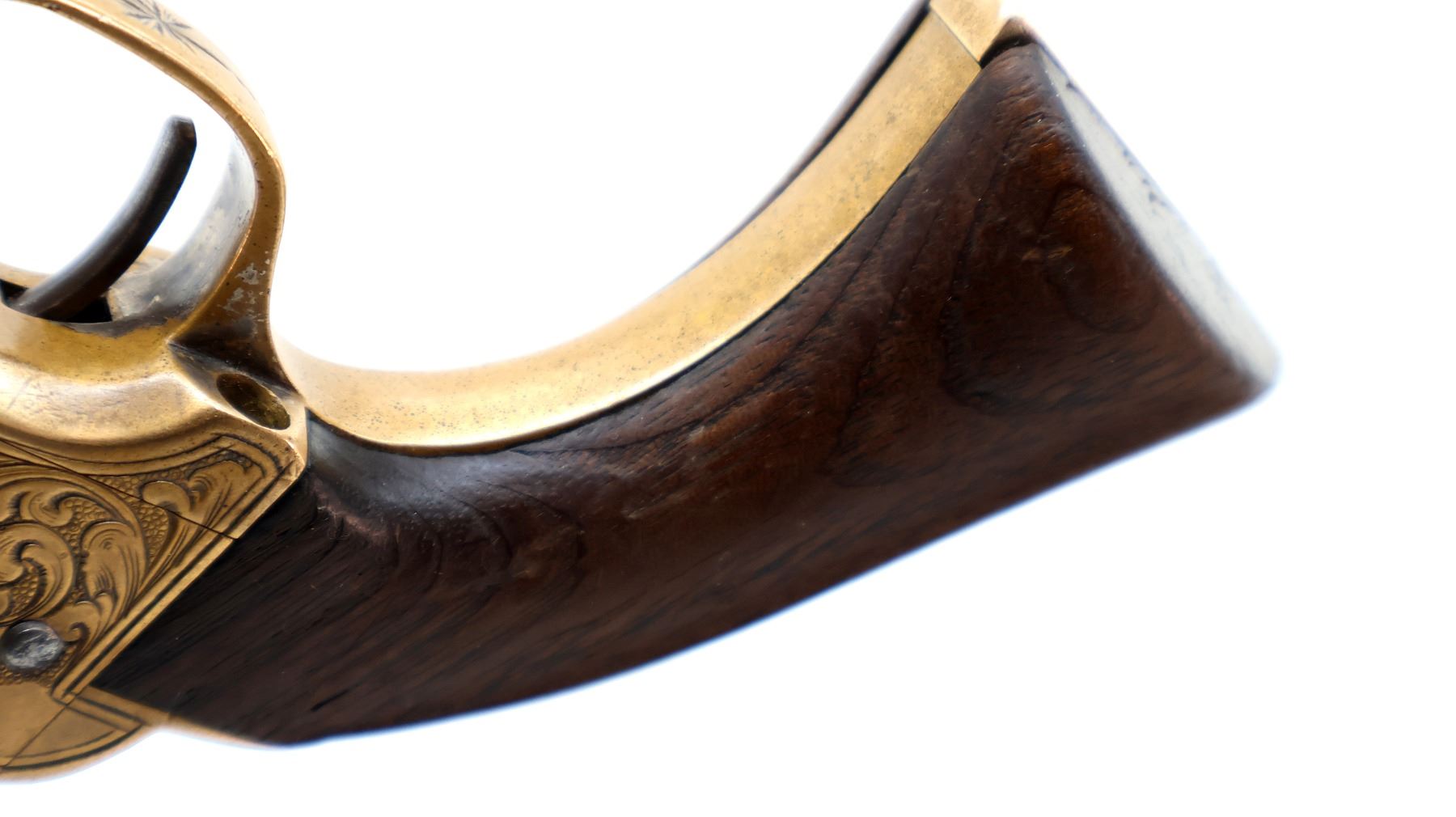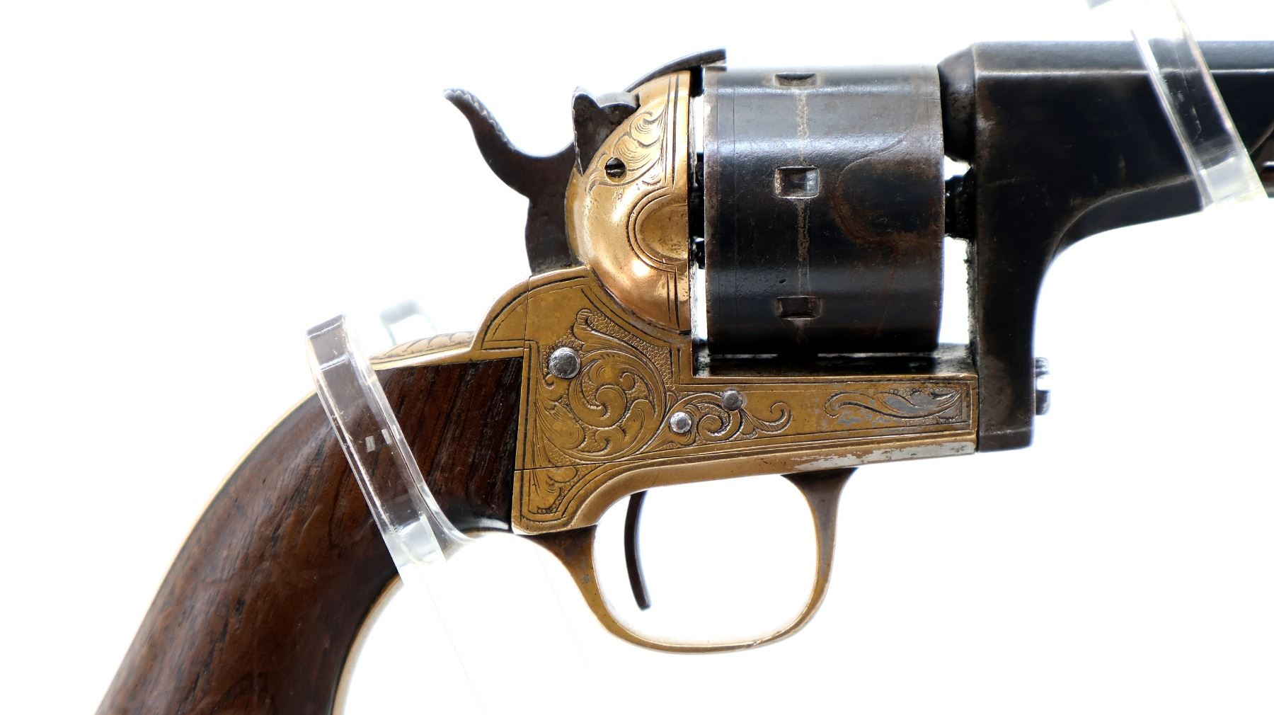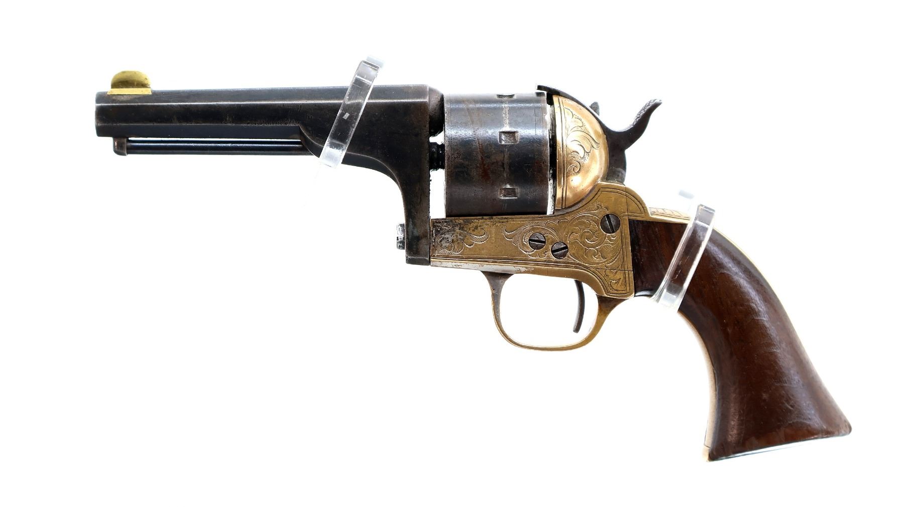Main Description: Functions mechanically as designed. Blade front sight, reblued octagon barrel and smooth cylinder, barrel retaining screw is a replacement, checkered spur hammer and smooth trigger, engraved brass frame with traces of Nickel finish. Two piece smooth wood grips.