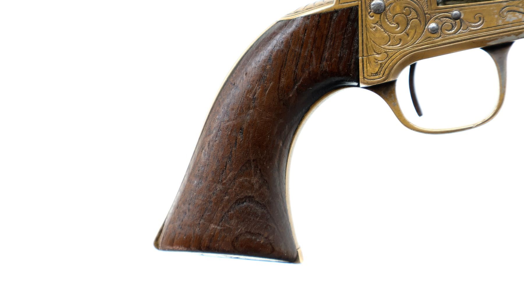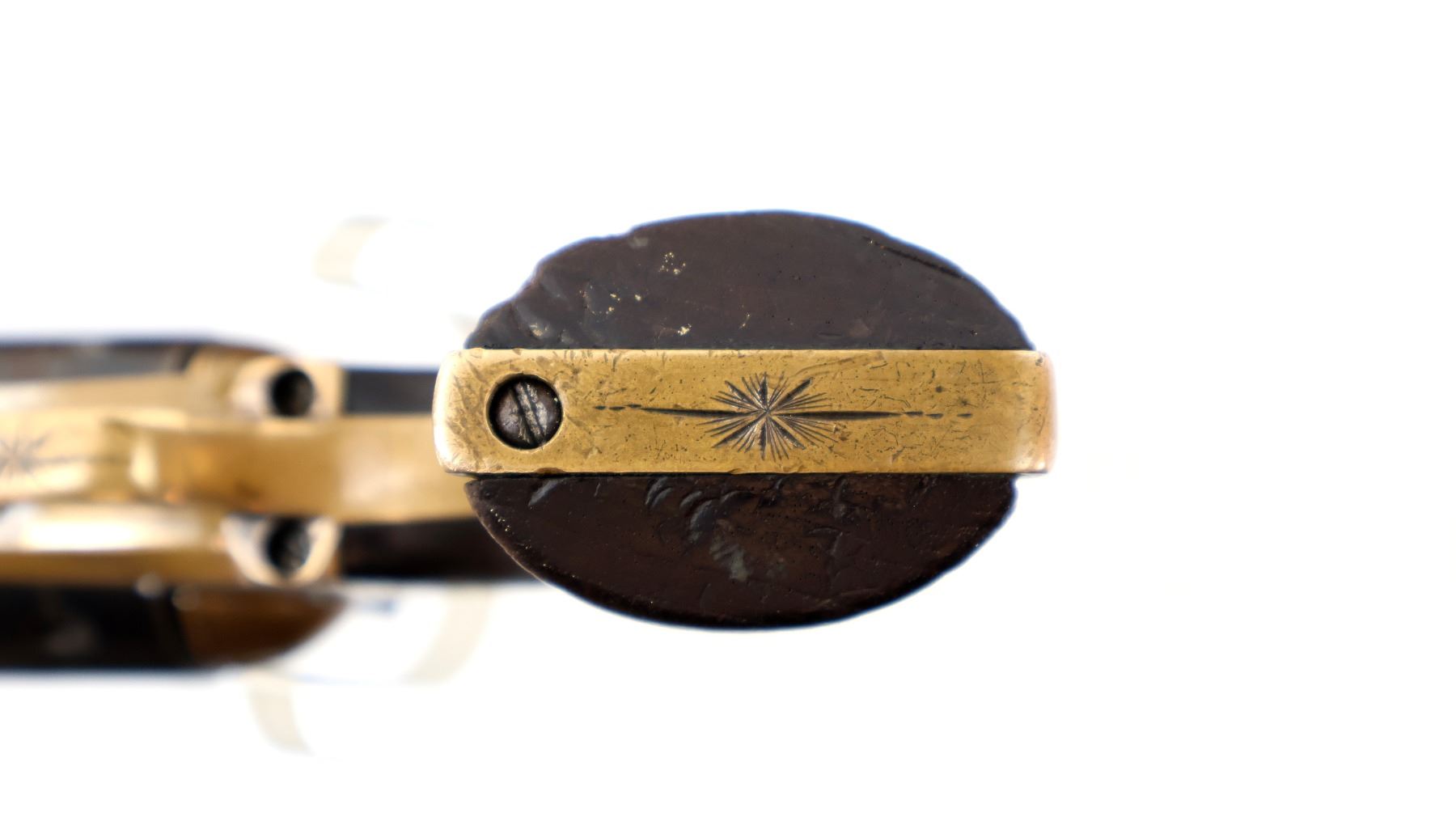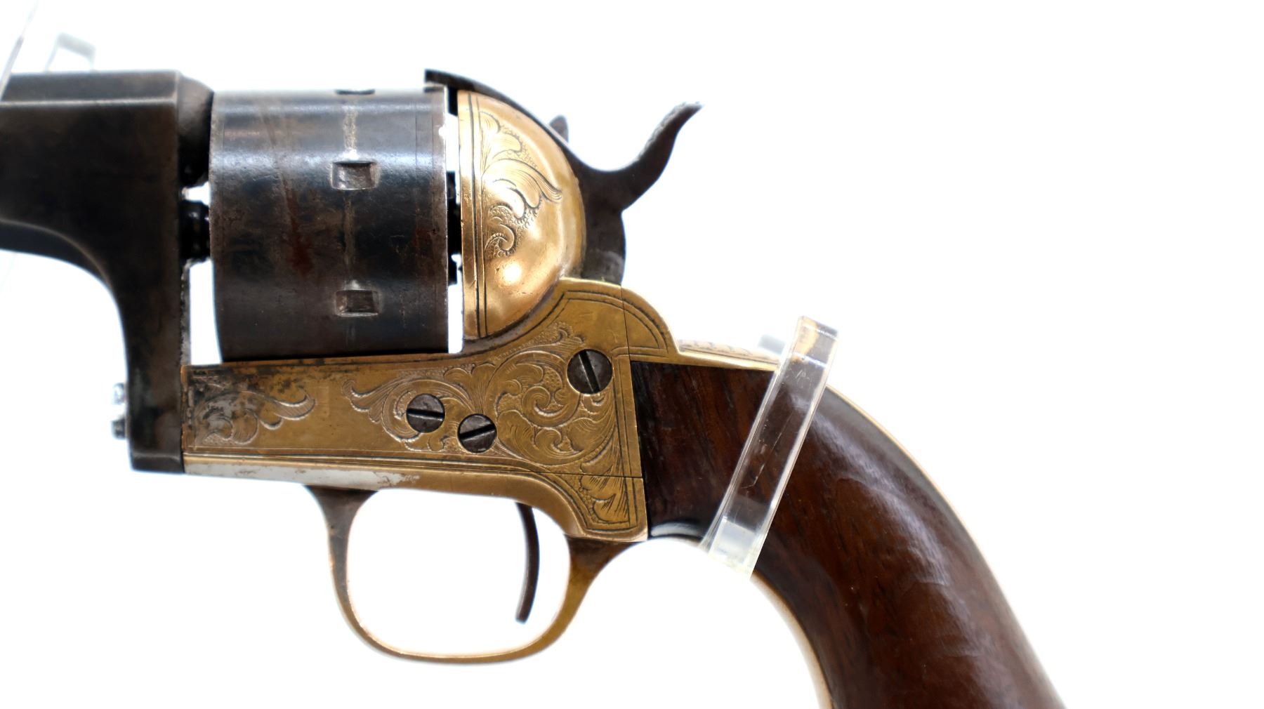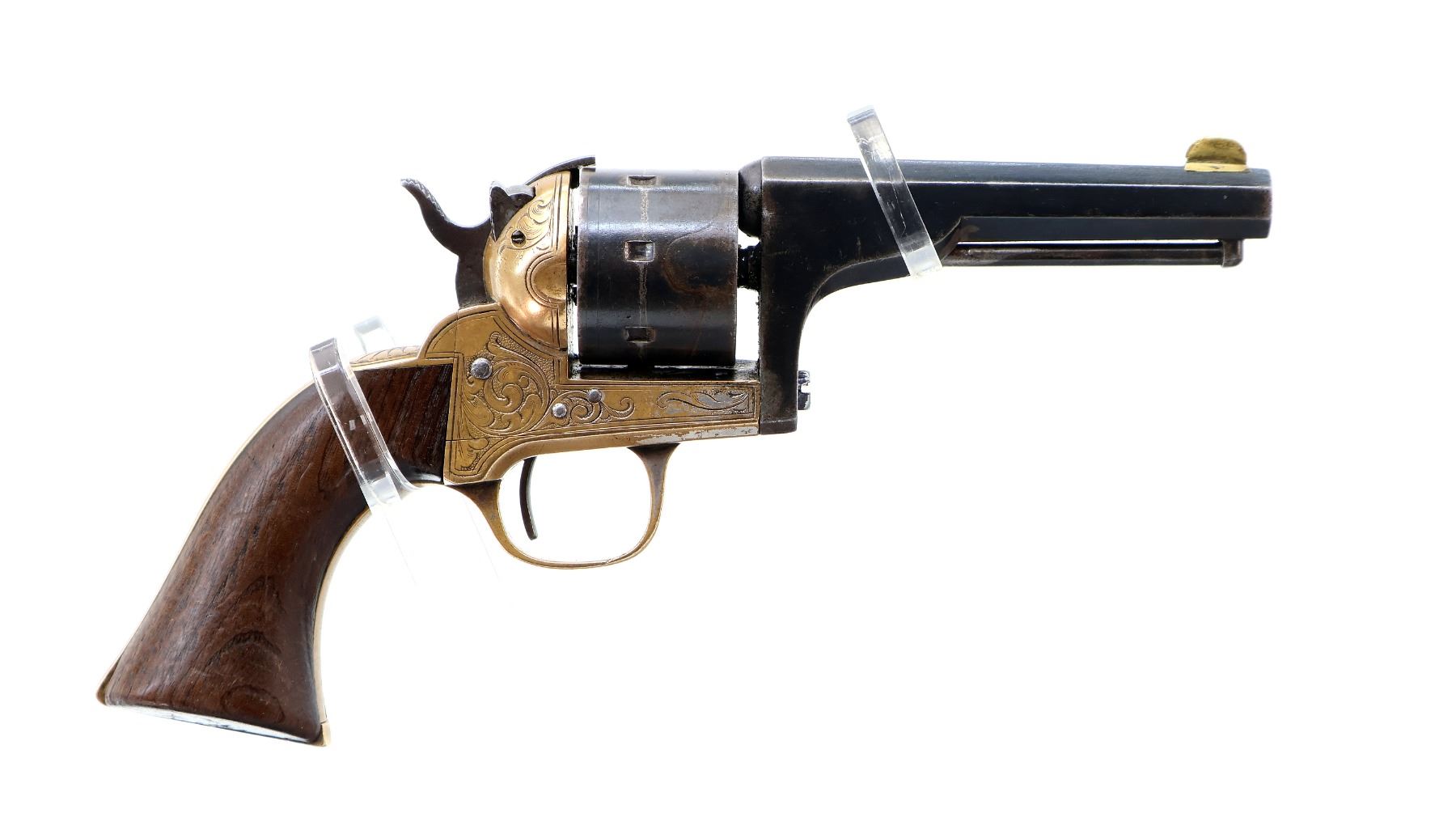Main Description: Functions mechanically as designed. Blade front sight, reblued octagon barrel and smooth cylinder, barrel retaining screw is a replacement, checkered spur hammer and smooth trigger, engraved brass frame with traces of Nickel finish. Two piece smooth wood grips.