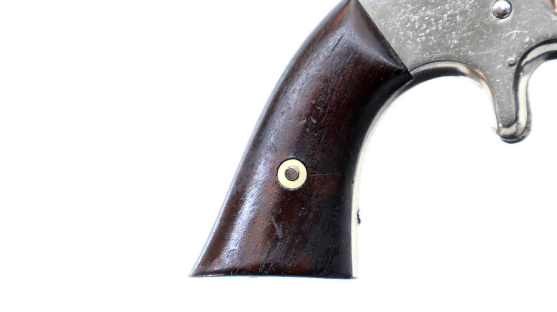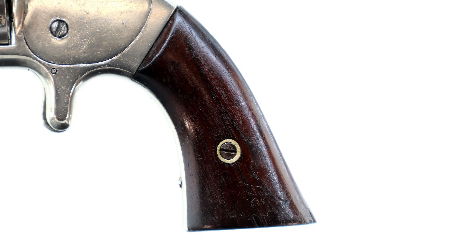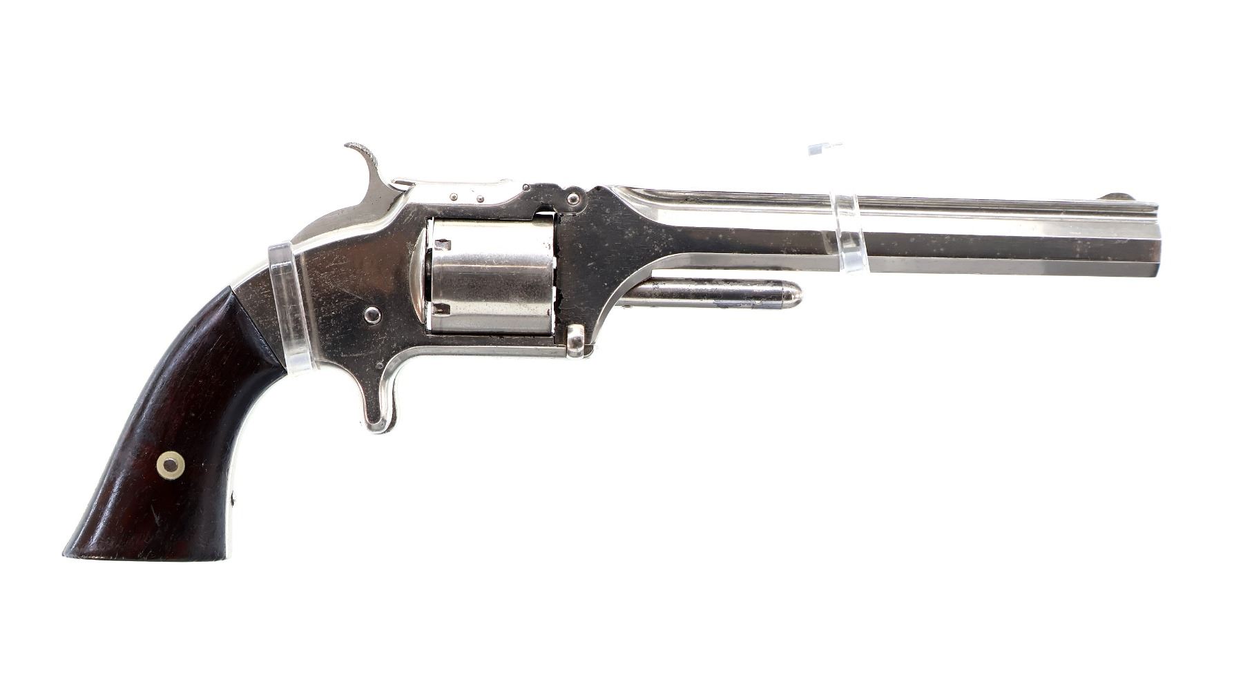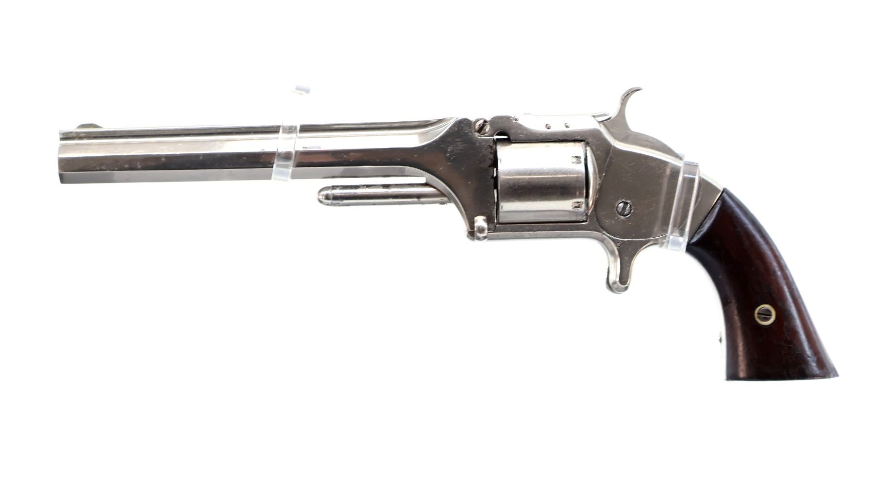 Main Description: Functions mechanically as designed. Blade front sight, fixed u notched rear sight, Nickel finish, octagon barrel with raised rib, smooth cylinder, checkered spur hammer and smooth trigger. Two piece smooth wood grips, ejector rod under barrel.