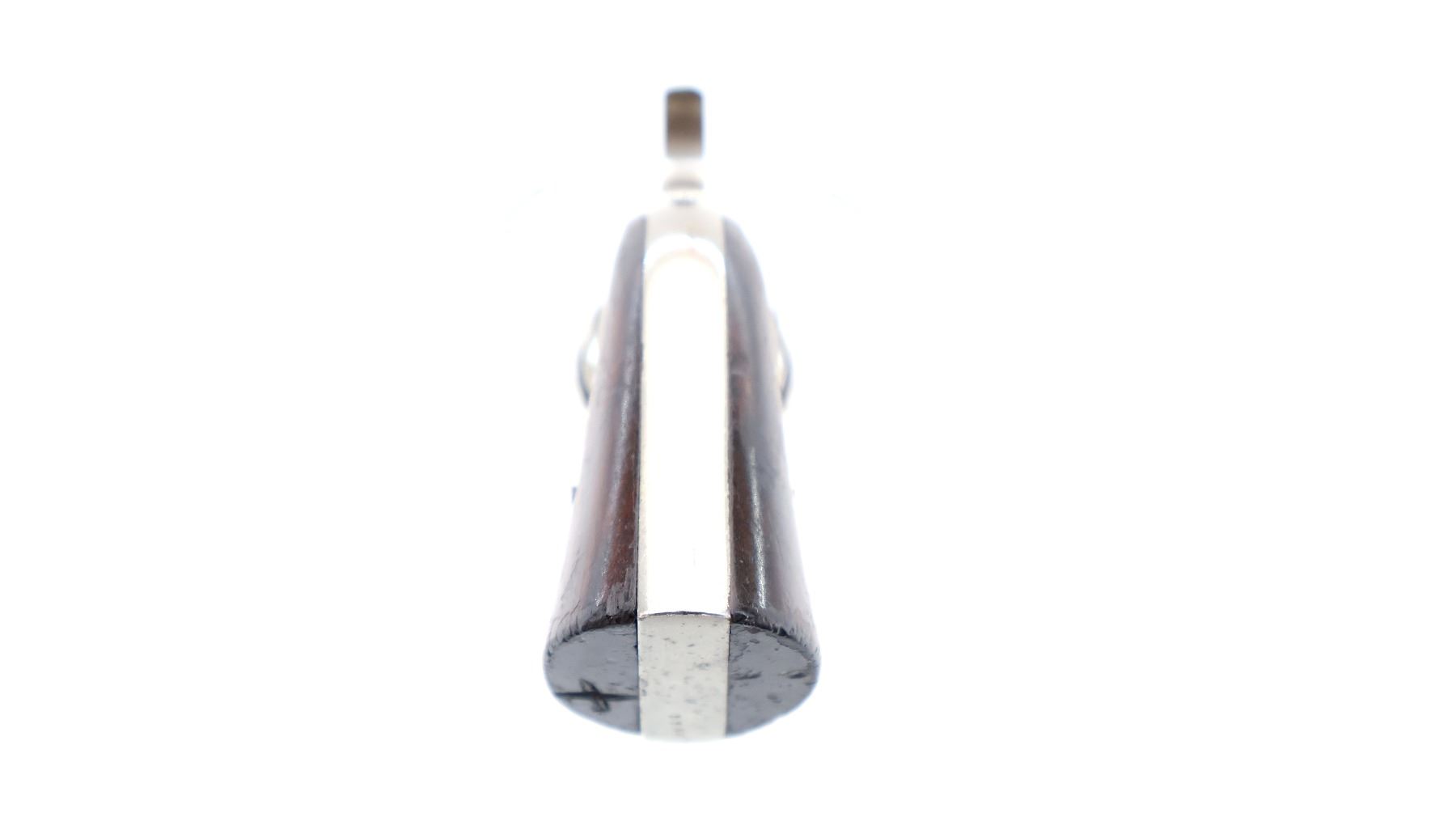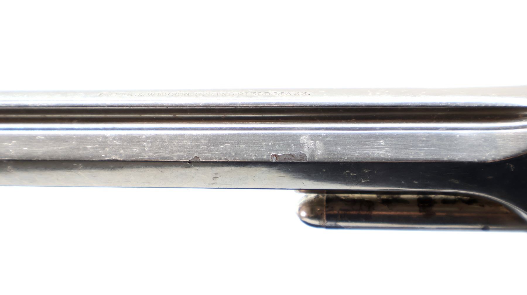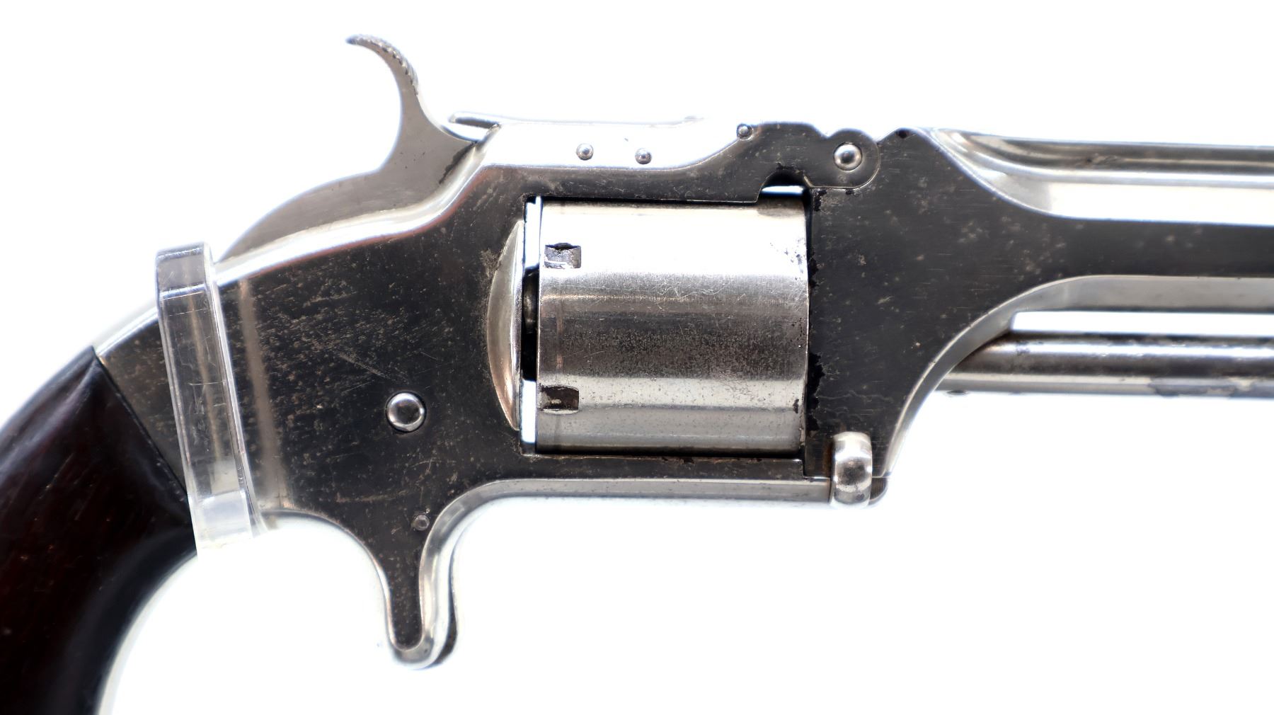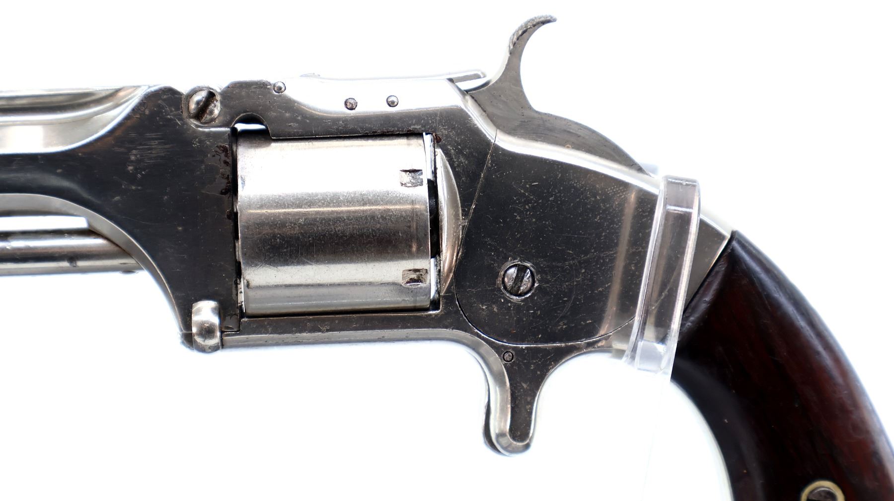Main Description: Functions mechanically as designed. Blade front sight, fixed u notched rear sight, Nickel finish, octagon barrel with raised rib, smooth cylinder, checkered spur hammer and smooth trigger. Two piece smooth wood grips, ejector rod under barrel.
