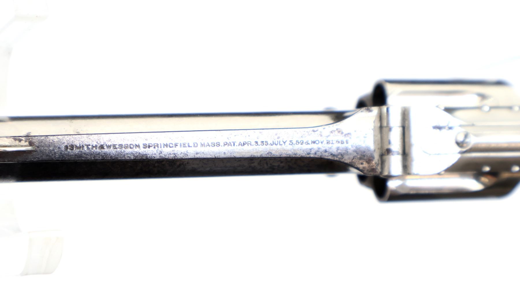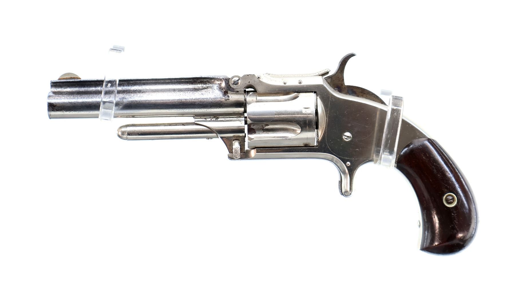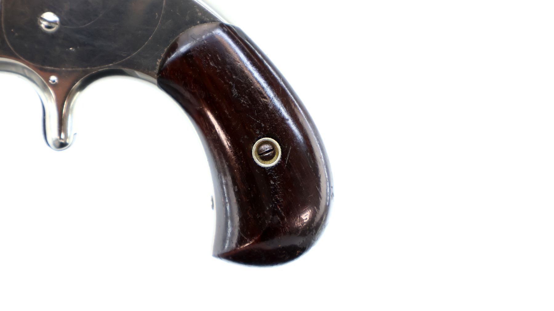 Main Description: Functions mechanically as designed. Blade front sight, fixed u notched rear sight, Nickel finish, round barrel with raised rib, fluted cylinder, checkered spur hammer and trigger. Two piece smooth wood grips, ejector rod under barrel