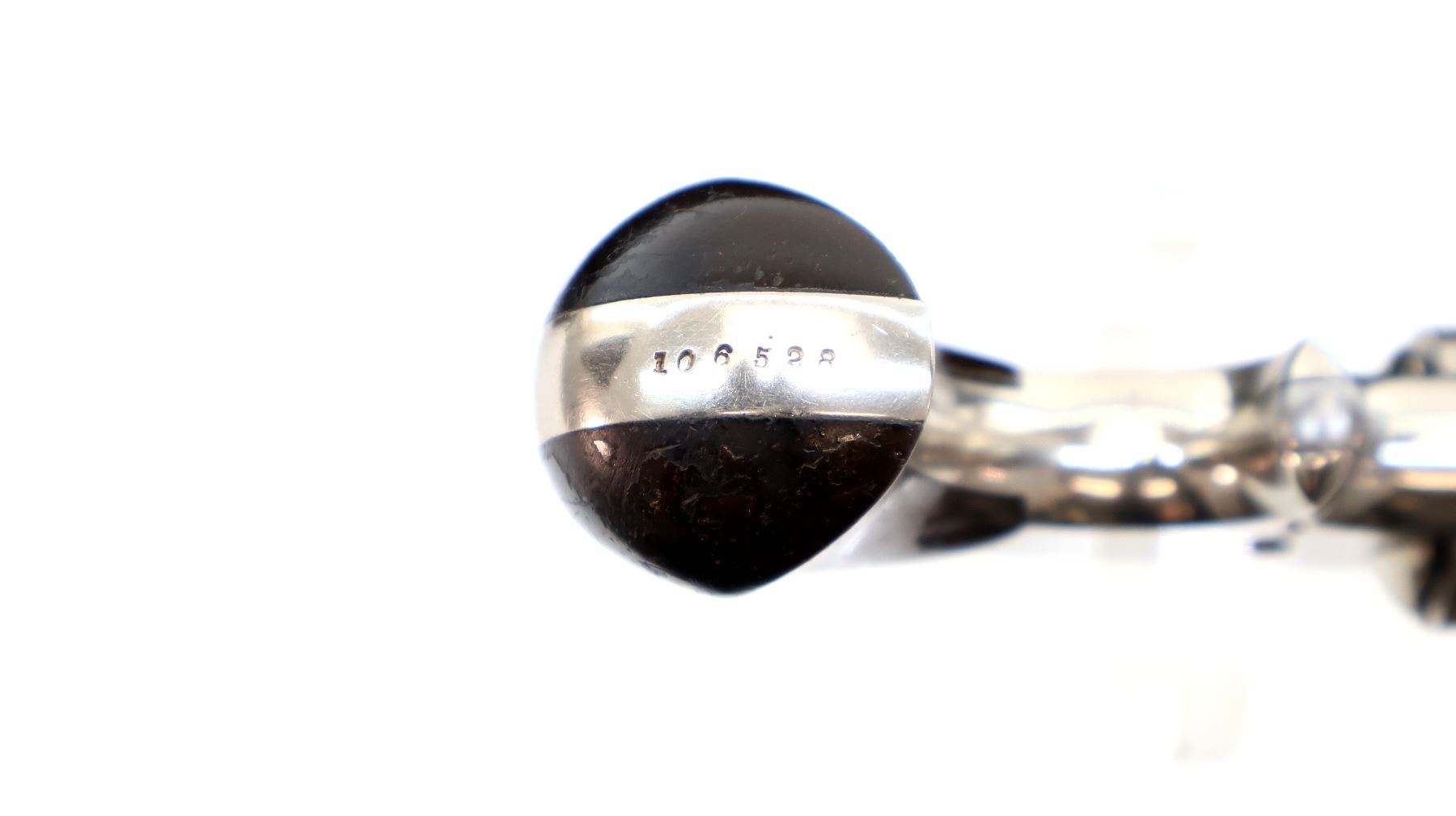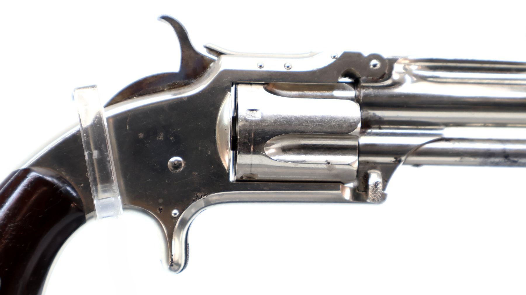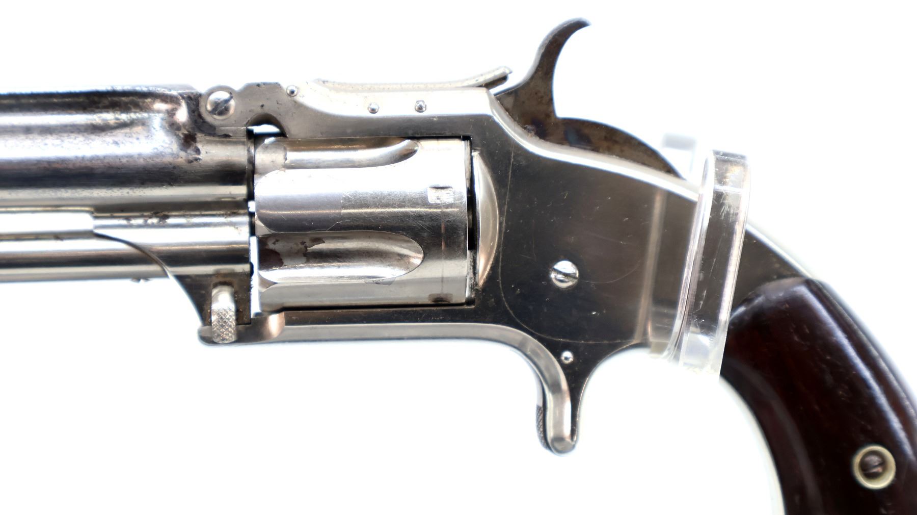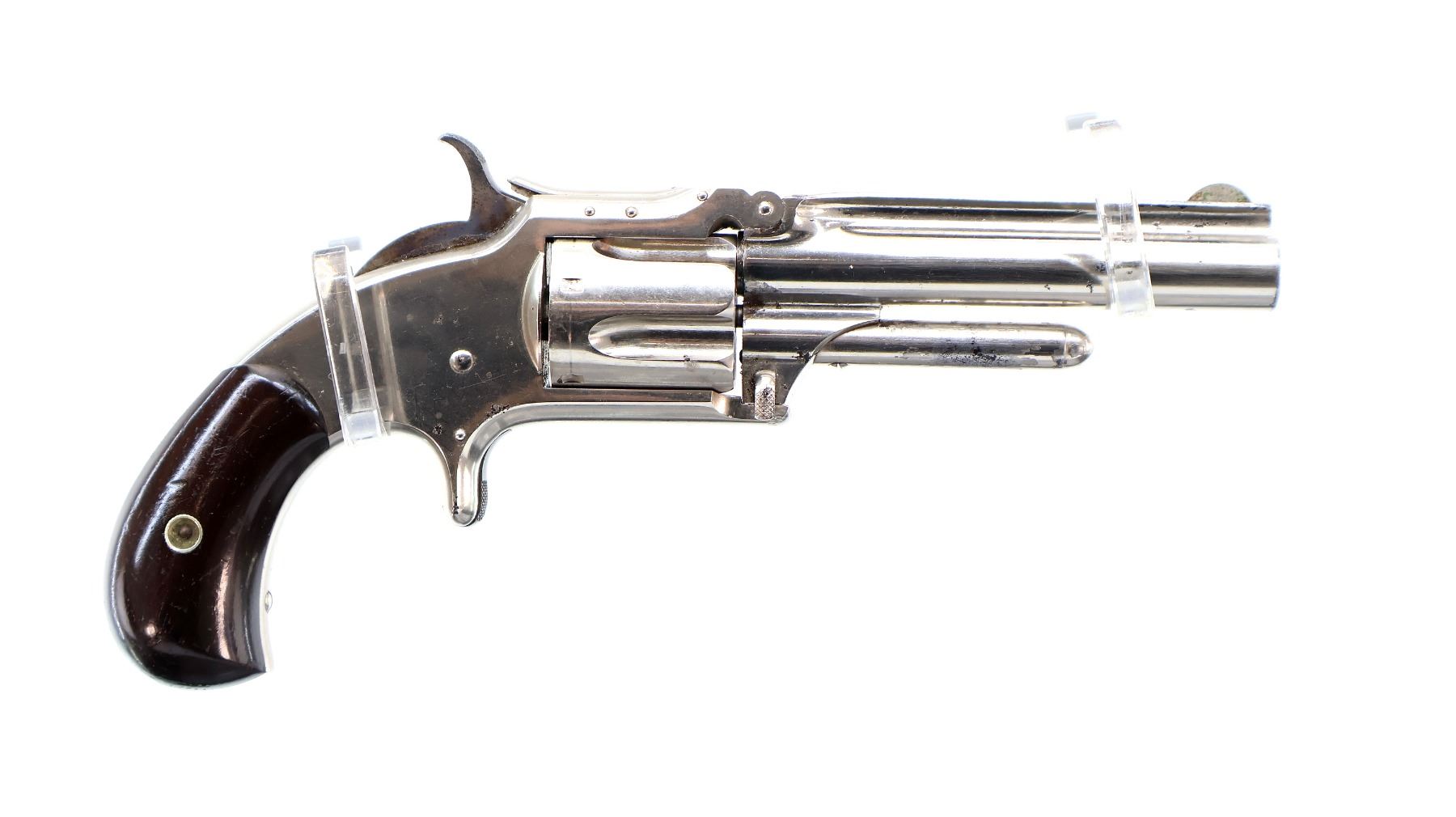 Main Description: Functions mechanically as designed. Blade front sight, fixed u notched rear sight, Nickel finish, round barrel with raised rib, fluted cylinder, checkered spur hammer and trigger. Two piece smooth wood grips, ejector rod under barrel