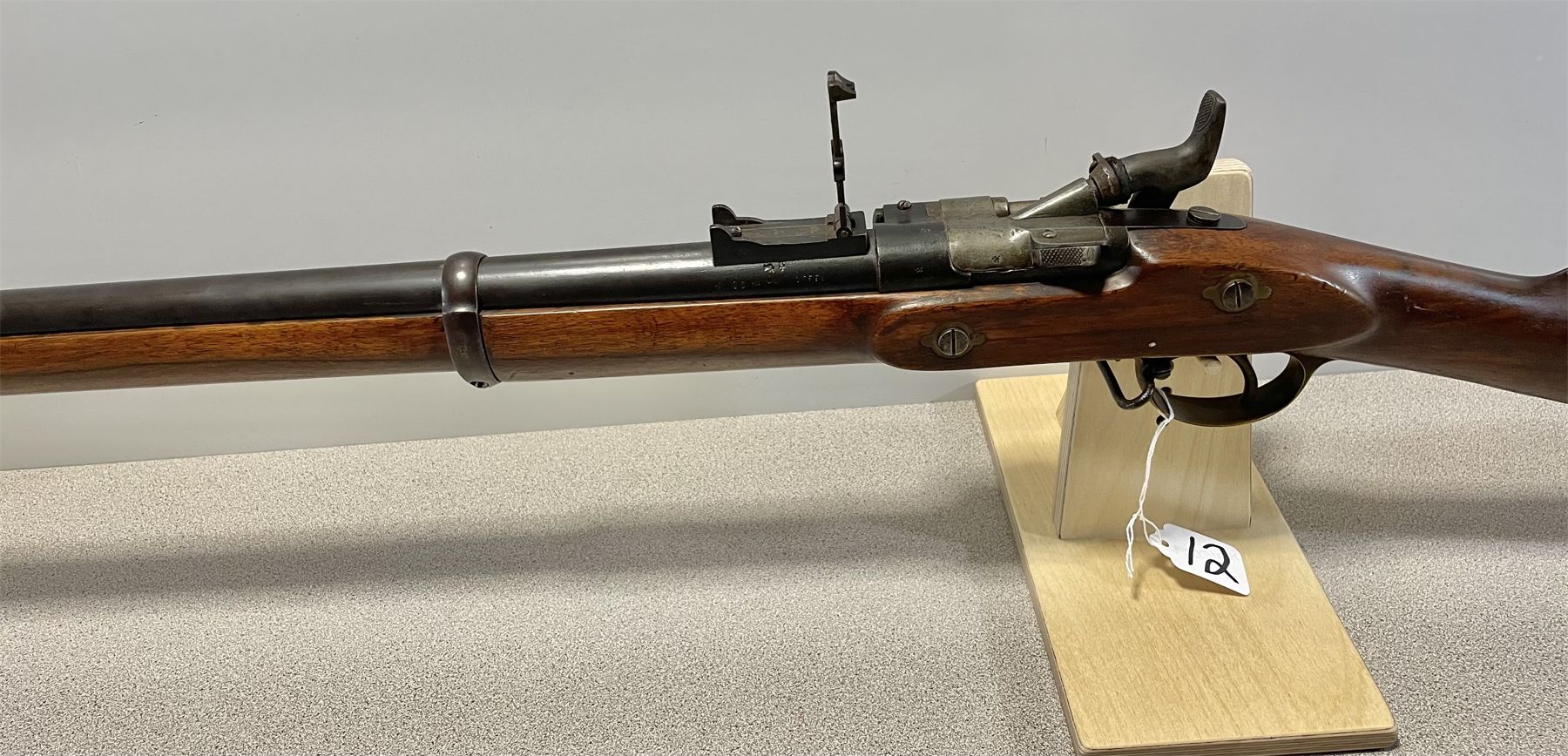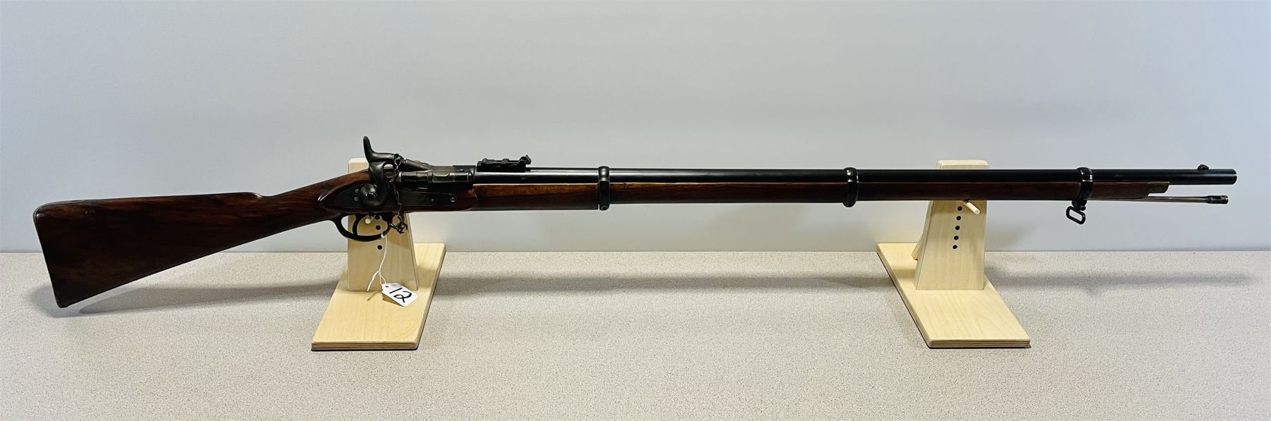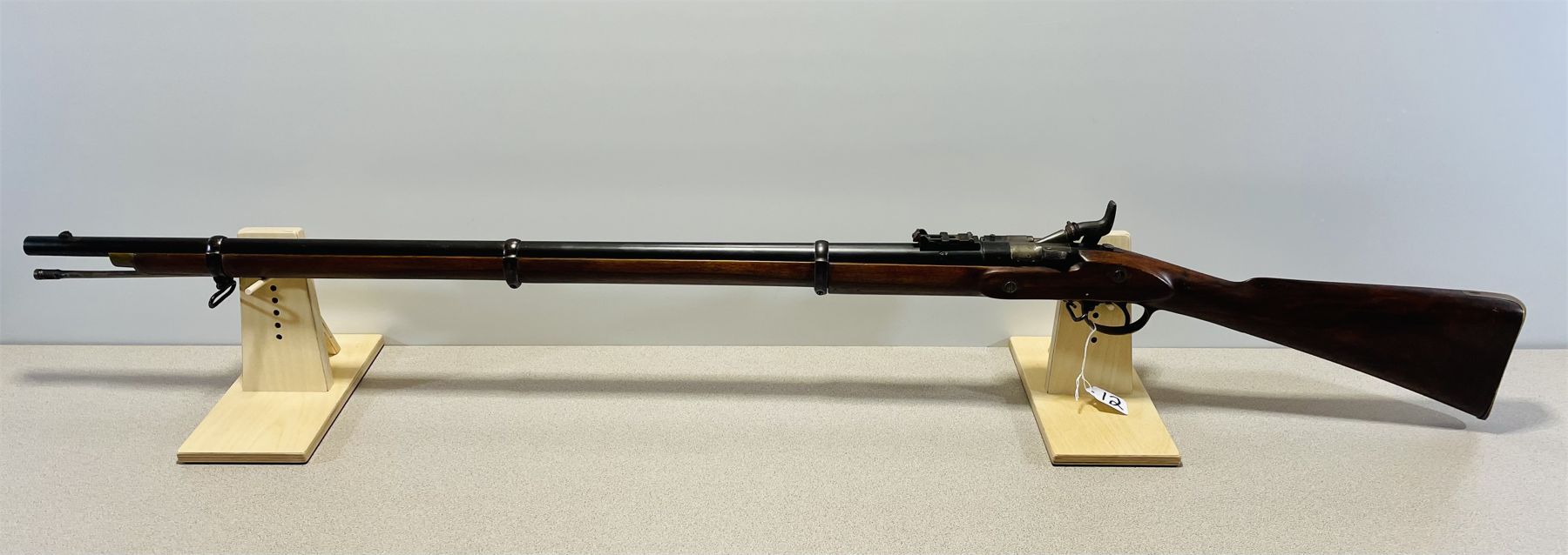 THIS COMMERCIAL SNIDER ENFIELD IS A THREE BAND RIFLE RETAILED BY WP MARSTON A WELL KNOWN 1800's TORONTO GUNSMITH. IN RARE CASES SUCH AS THIS ONE THE MARSTON NAME IS FOUND ON OTHER MANUFACTURERS RIFLES. PROOF MARKS ON BARREL, RECEIVER, UNDERSIDE OF STOCK, ETC. THE OVERALL CONDITION IS VERY GOOD FOR AGE. BORE IS VERY GOOD WITH WELL DEFINED RIFLING. FUNCTIONS WELL. WOOD GOOD. ANTIQUE CLASS.