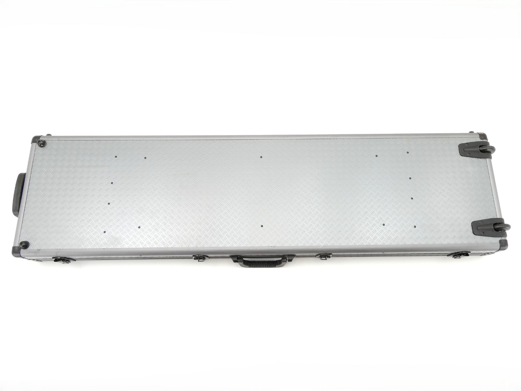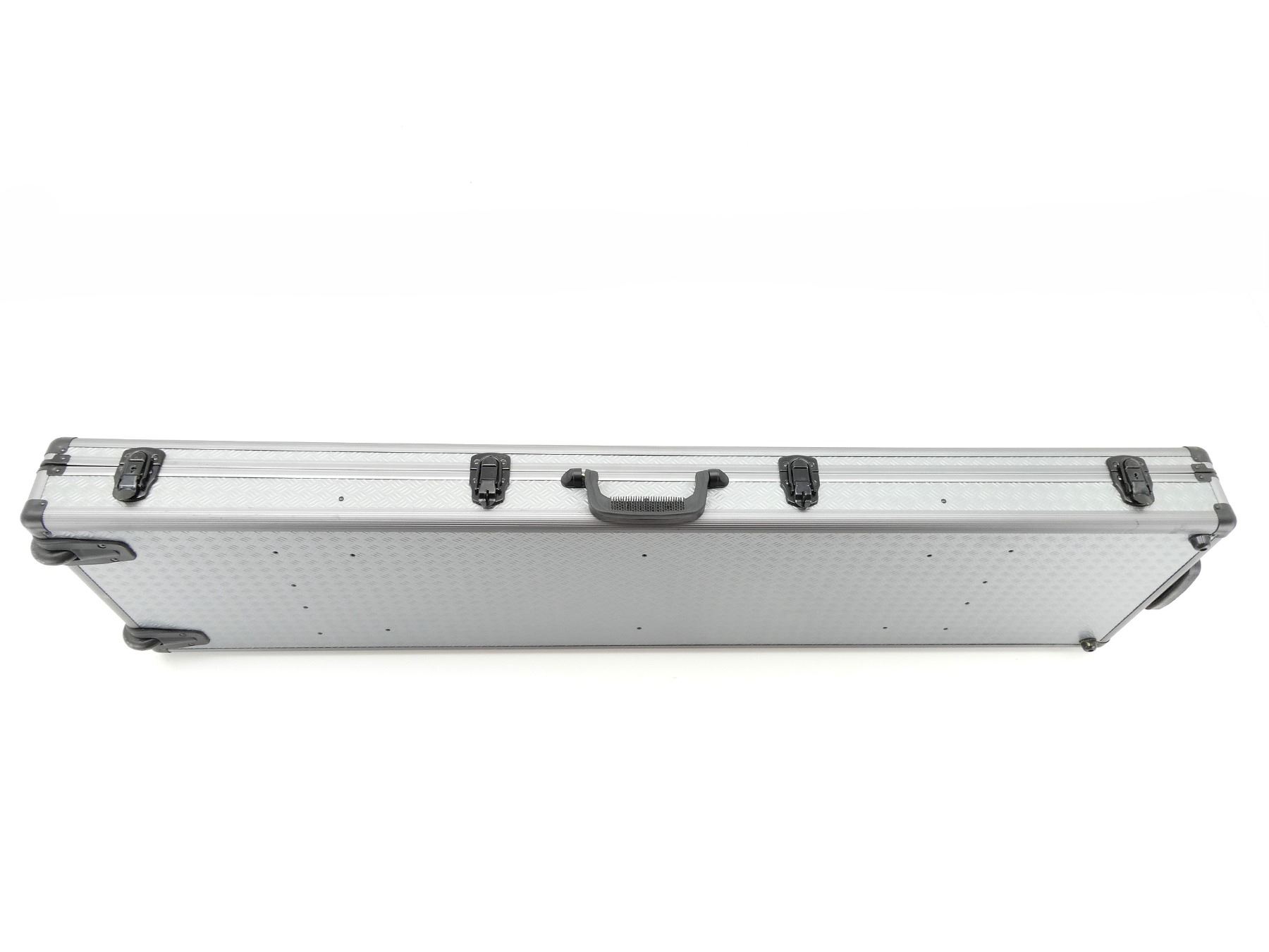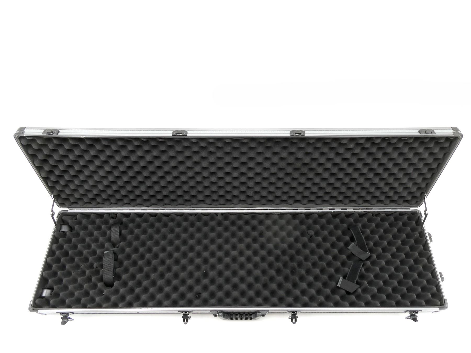 LOT INCLUDES; (1) GREY HARD PADDED DOUBLE GUN CASE, CARRY HANDLE, DRAG HANDLE, (2) WHEELS, (4) INSIDE VELCRO STRAPS, (4) LATCHES, (2) ARE LOCKING (1) KEY, APPROX. OVERALL LENGTH 52", SHOWS WEAR AND TEAR FROM USAGE, SEE PHOTOS.