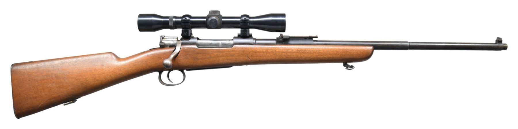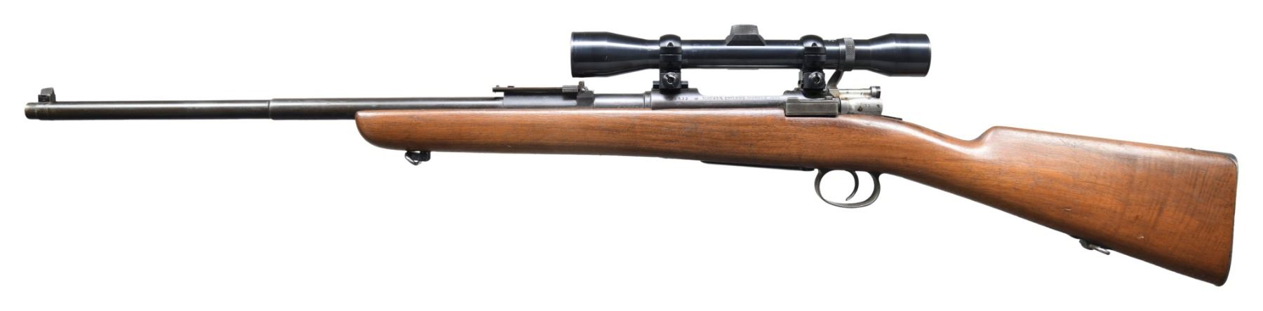 Cal. 7mm Mauser. S# F4633. Bbl. 22". Loewe made Chilean Mauser. Matching number on barrel cocking piece, floorplate & trigger guard. Ladder rear sight graduated 2,000 meters. Blade front sight. Rifle has been sporterized by shortening the stock, replacing the bolt handle w/ a low scope type & the addition of a Dayton-Traster MKII low scope safety. Receiver is equipped w/ Weaver bases, streamlined rings & carries a Weaver K4-1 scope w/ steel tube & duplex crosshair. Work appears to be professionally done. Walnut stock has been refinished & a properly shaped recess added for the bolt handle. Original rear sling swivel is present. Quick detachable front swivel. CONDITION: stock has light wear & scattered handling marks throughout. Follower has been modified to allow bolt to close when empty. Metal retains traces of original blue turning gray & patina w/ light wear & spots of light oxidation. Bright bolt is turning gray. Bore has strong lands w/ light frosting in the grooves. (01-27144/RW). ANTIQUE. $300-500.