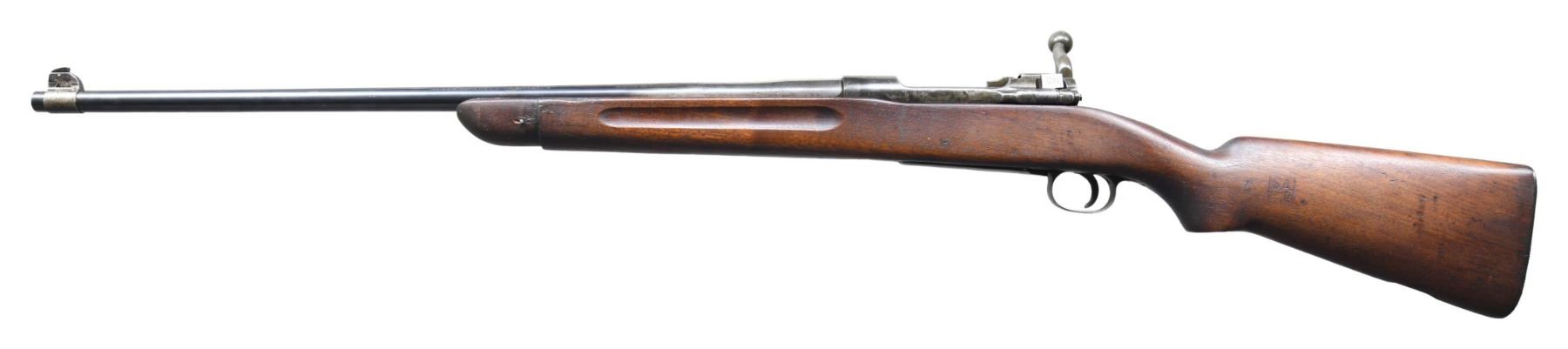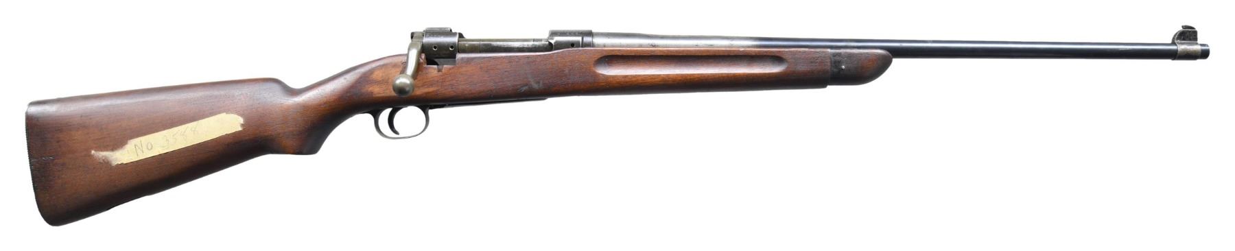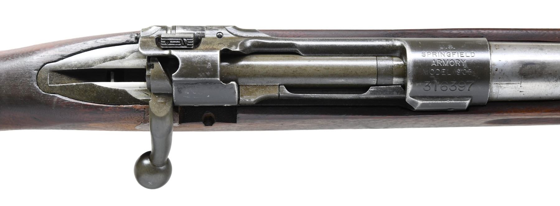1903 BOLT ACTION RIFLE. Cal. 30-06. S# 316397. Bbl. 23 3/4". The blued steel bbl. is a Winchester manufactured replacement. Markings on the top left side include "MANUFACTURED BY WINCHESTER REPEATING ARMS. CO. / NICKEL STEEL BARREL ESPECIALLY FOR SMOKELESS POWDER". Bbl. shows trace of sight alignment pin recess on top right. Rear sight is not present. Front sight is standard Springfield type w/ wide replacement blade. Receiver has been drilled on the right side for aperture sight. Replacement bolt marked underneath safety lug "J 8". Firing pin assembly is not present in bolt. Follower & spring are not present. Walnut Springfield M1 22 buttstock w/ grasping grooves & pistol grip. Marked on left side in cheek area w/ boxed "S.A. / R". Deeply checkered buttplate w/o trap. CONDITION: stock has moderate wear & handling marks throughout. Stock has been modified on the right side for a receiver sight base & the cutout for the bolt handle has been filled w/ bedding compound. Bbl. band & butt swivel are not present. Receiver has turned overall gray w/ wear. Bbl. has had blue removed for approx. 1/3" its length. Balance appears to be original Winchester blue. Bbl. is shiny, but w/ worn lands. (25-2835/RW). MODERN. $200-300.