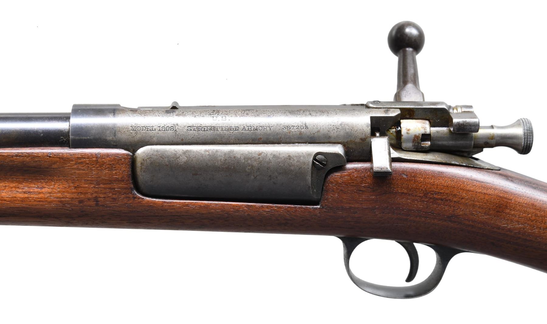 Cal. 30-40 Krag. S# 387205. Bbl. 24". Rifle has been sporterized by shortening the bbl. to 24" by removing the handguard & upper & lower bands. Front sight has been reattached by solder & marble bead sporting blade installed. No rear sight is present, leaving the screw holes in the bbl. Walnut stock has been shortened just above the lower band. Butt swivel has been removed. Buttplate is not present. CONDITION: stock has been heavily sanded w/ loss of wood in inletted areas. Metal has traces of blue, turning gray & patina w/ spots of light pitting. Bore is shiny, but w/ worn lands. (25-2866/RW). MODERN. $300-500.