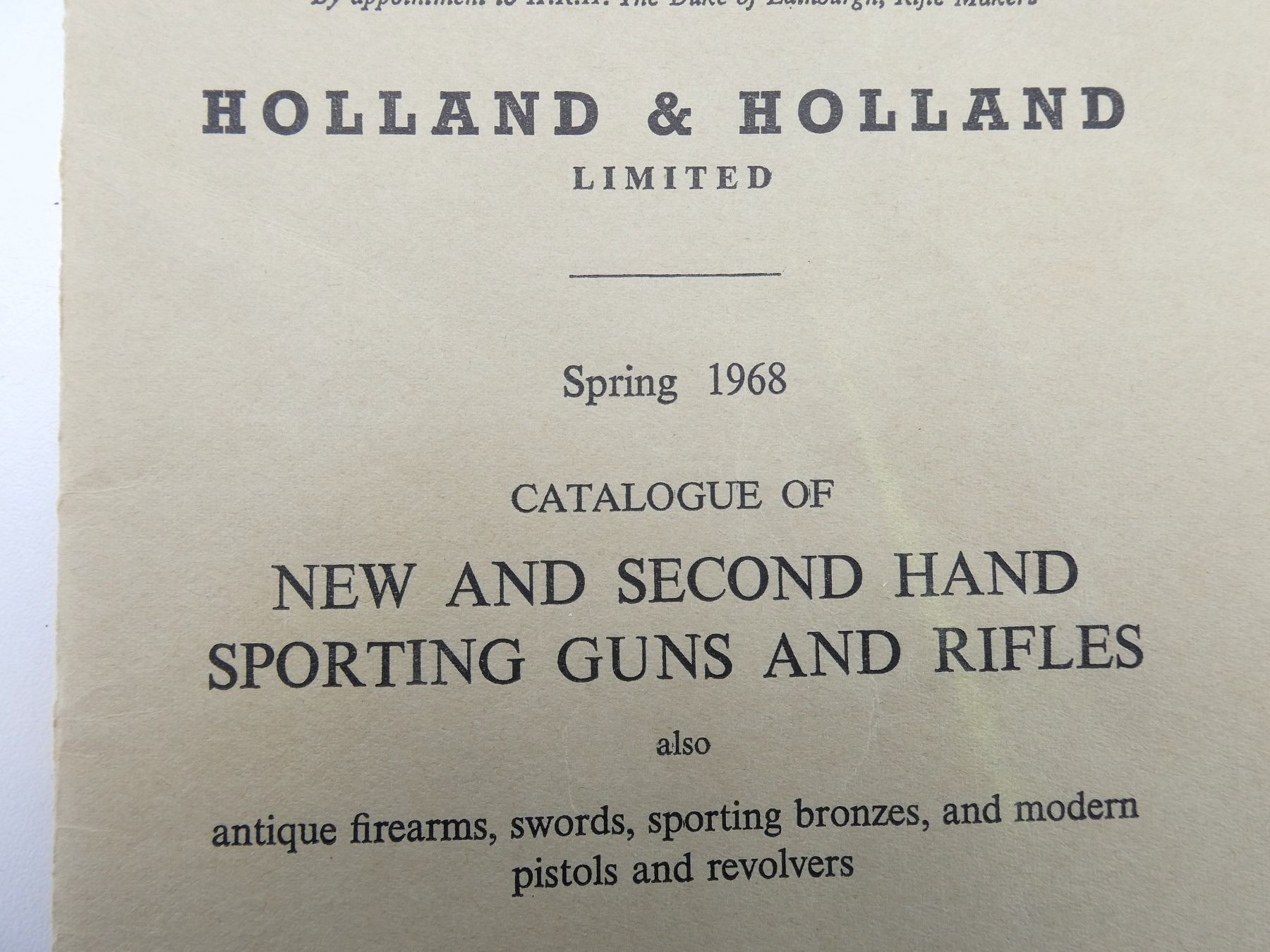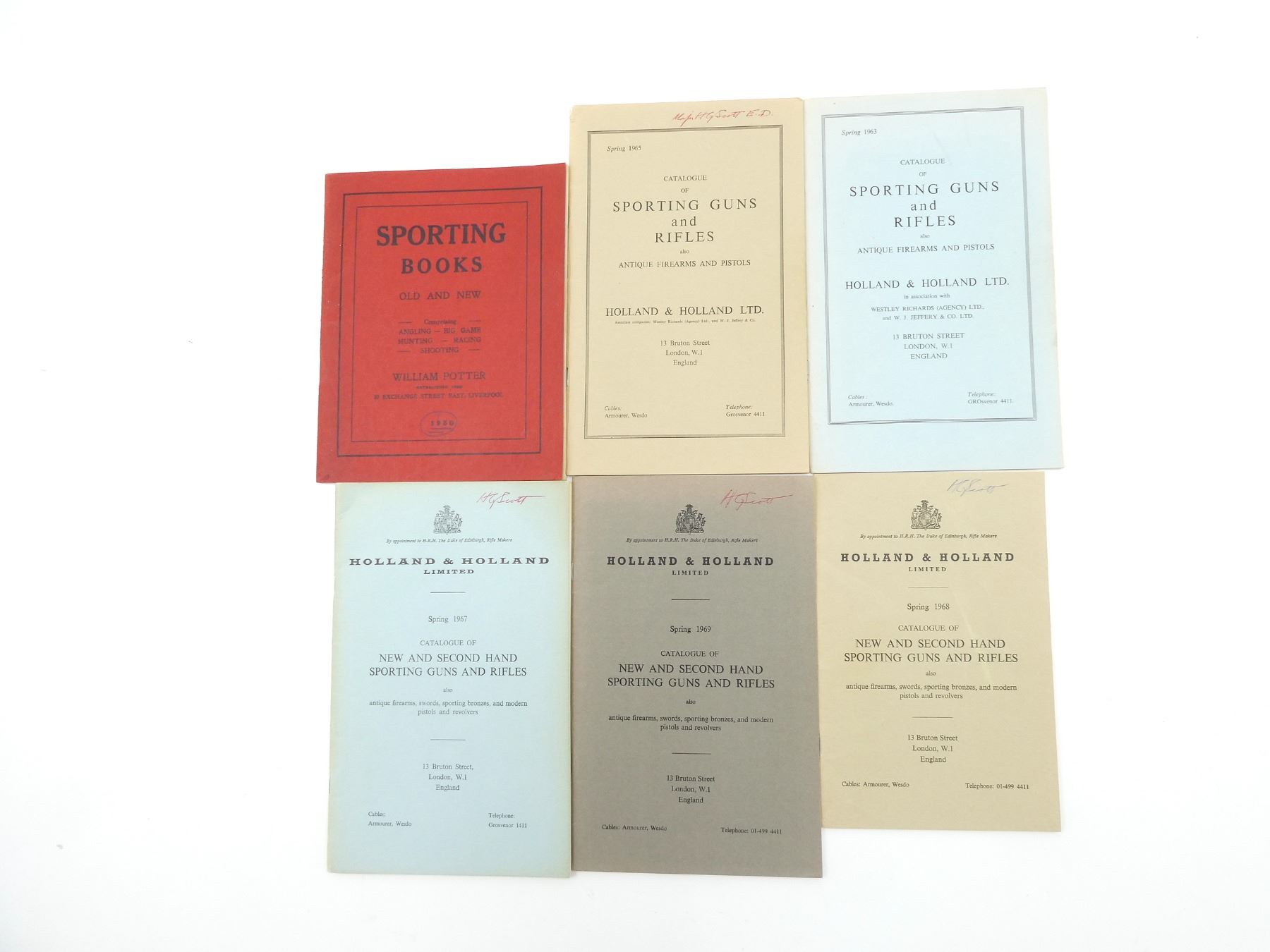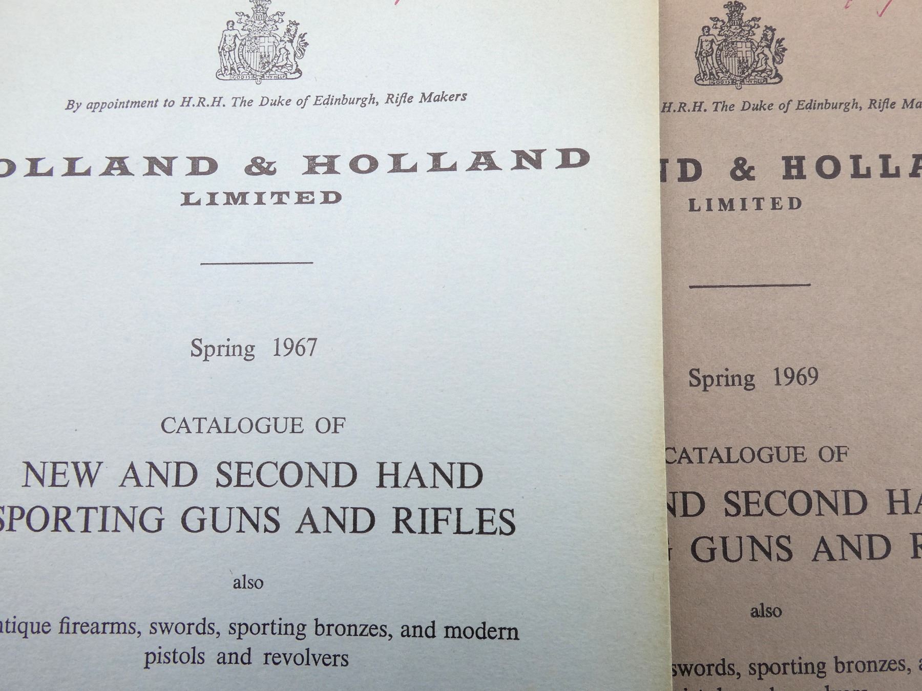 LOT INCLUDES; (1) "SPORTING BOOKS OLD AND NEW", BY WILLIAM POTTER, SOFT COVER, DATED 1930, (1) "CATALOGUE OF SPORTING GUNS AND RIFLES ALSO ANTIQUE FIREARMS AND PISTOLS", BY HOLLAND & HOLLAND LTD., SOFT COVER, DATED SPRING 1963, (1) "CATALOGUE OF SPORTING GUNS AND RIFLES ALSO ANTIQUE FIREARMS AND PISTOLS", BY HOLLAND & HOLLAND LTD., SOFT COVER, DATED SPRING 1965, (1) "CATALOGUE OF NEW AND SECOND HAND SPORTING GUNS AND RIFLES ALSO ANTIQUE FIREARMS, SWORDS, SPORTING BRONZES, AND MODERN PISTOLS AND REVOLVERS", BY HOLLAND & HOLLAND LTD., SOFT COVER, DATED SPRING 1967, (1) "CATALOGUE OF NEW AND SECOND HAND SPORTING GUNS AND RIFLES ALSO ANTIQUE FIREARMS, SWORDS, SPORTING BRONZES, AND MODERN PISTOLS AND REVOLVERS", BY HOLLAND & HOLLAND LTD., SOFT COVER, DATED SPRING 1968 & (1) "CATALOGUE OF NEW AND SECOND HAND SPORTING GUNS AND RIFLES ALSO ANTIQUE FIREARMS, SWORDS, SPORTING BRONZES, AND MODERN PISTOLS AND REVOLVERS", BY HOLLAND & HOLLAND LTD., SOFT COVER, DATED SPRING 1969. SEE PHOTOS.