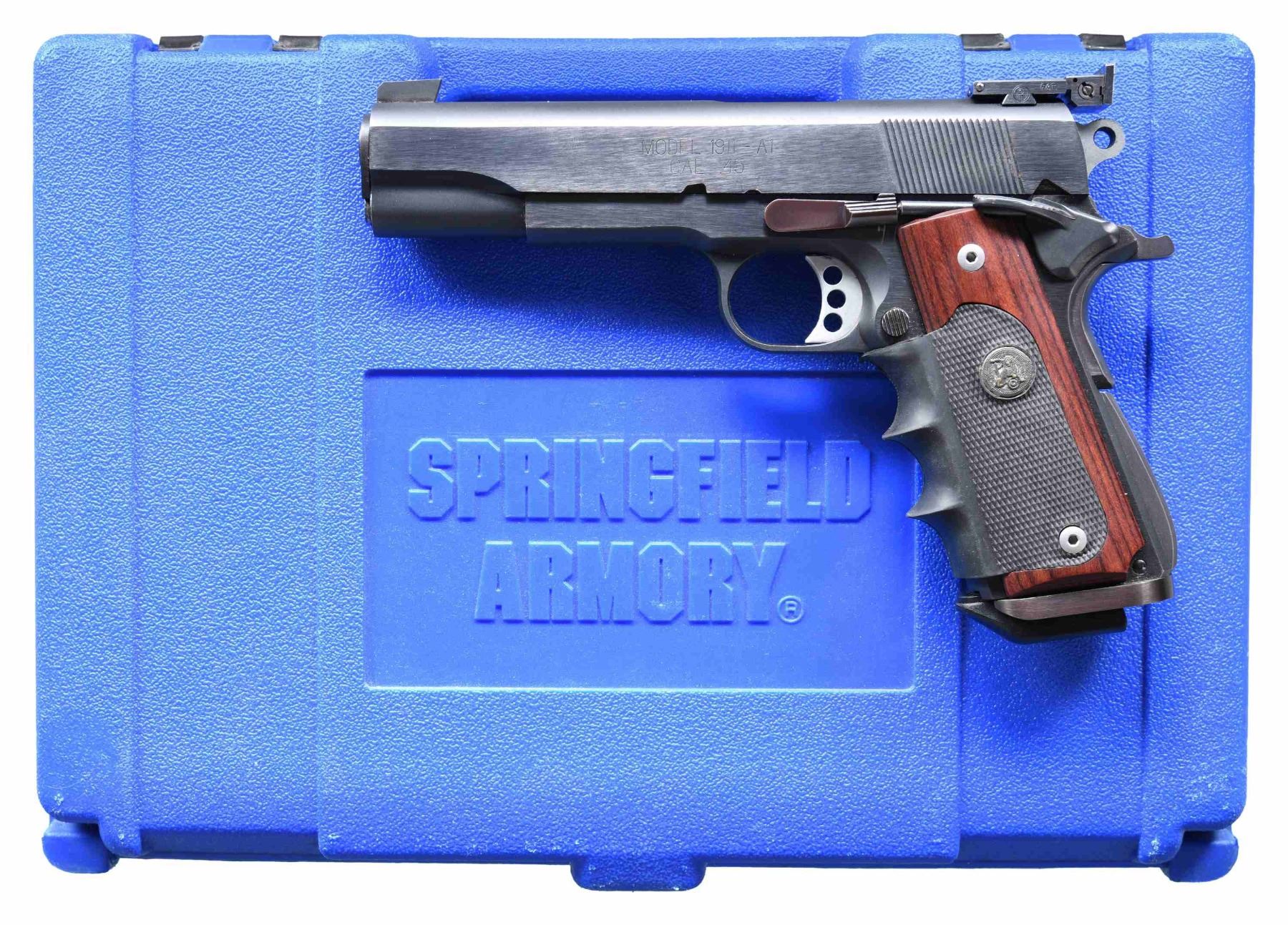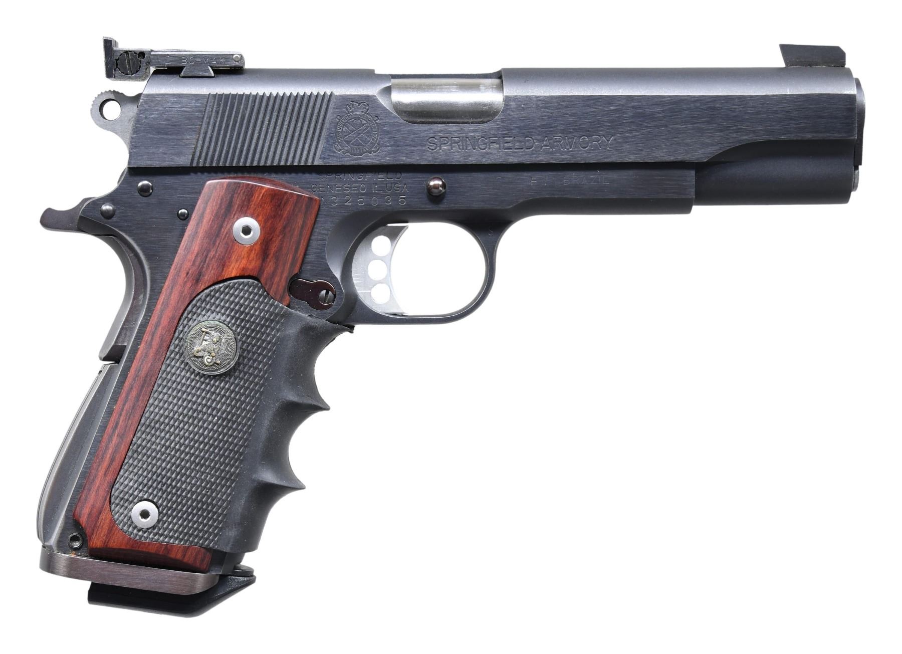 Cal. 45 ACP. S# N325035. Bbl. 5". Target blade front sight. Adjustable Bo-Mar rear sight. Ring hammer. Extended right hand safety. Enlarged mag well. "FI BRAZIL" marked frame. Blued finish. Hardwood grips with Pachmayr finger groove rubber grips. MAGS: 2-7 rd. blued. UNATTACHED ACCESSORIES: factory hardcase with bore brush, cleaning rod, 45 ACP Snap Cap & manual. CONDITION: grips show light handling wear. Metal retains 93% blue with some fading to gray on backstrap, scattered light edge wear & a slide stop reassembly scratch on left side of frame. Action functions properly when hand cycled. Bright near excellent bore. (25-2022/MJC). MODERN. $500-900.