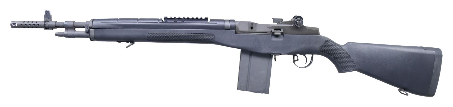 Cal. 308 WIN. S# 423312. Bbl. 21" including proprietary muzzle brake. Rifle is in a "scout" configuration and has a muzzle brake extending 3" beyond front sight. Standard aperture rear sight and blade front sight w/ protective ears. Rifle is equipped with a Picatinny rail forward of the receiver for mounting a scout type scope. This handy rifle has a black synthetic stock and a solid black butt pad. MAGS: 4-20 rd. 1-5rd. all marked "Springfield". UNATTACHED ACCESSORIES: Original factory owners manual and paperwork. "LULA" mag. loader. Black nylon "Springfield" padded case. Factory trigger lock. CONDITION: all aspects near excellent except bore which shows light wear and frosting. (25-2575/RW). MODERN. $1,000- 1,500.