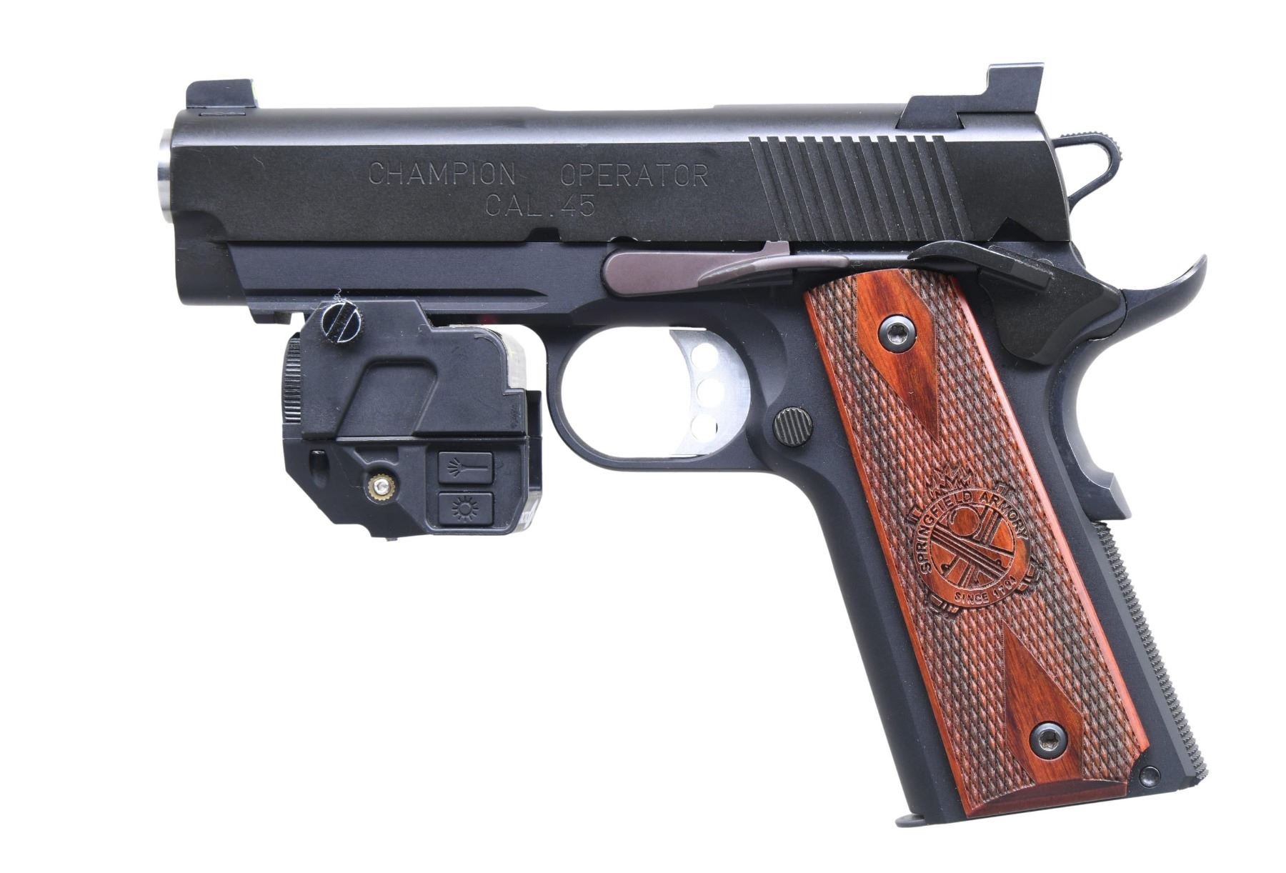 Cal. 45 ACP. S# LW169870. Bbl. 4 1/4". Three-dot Trijicon night sights. Commander 1911-style pistol. Extended slide release, ambi safety, and beavertail grip safety. Parkerized finish. Frame has a picatinny rail with a Tacticon combo laser and light. Checkered hardwood grips with the Springfield Armory logo. MAGS: one 7-rd. Checkmate. CONDITION: grips show a couple dings. Metal retains 98% of its original parkerized finish, with some light edge and handling wear. Action functions properly when hand-cycled. Near-excellent bore. (24-6363/MJC). MODERN. $500-800.