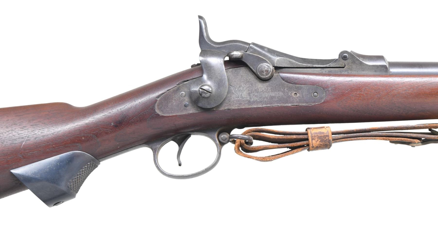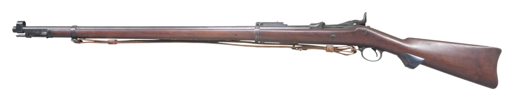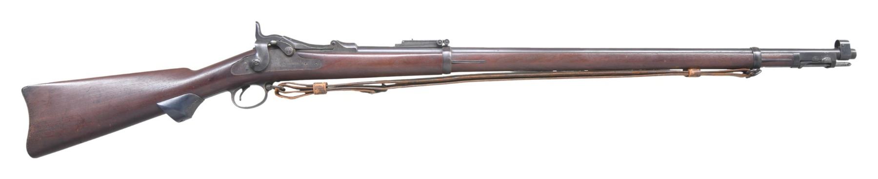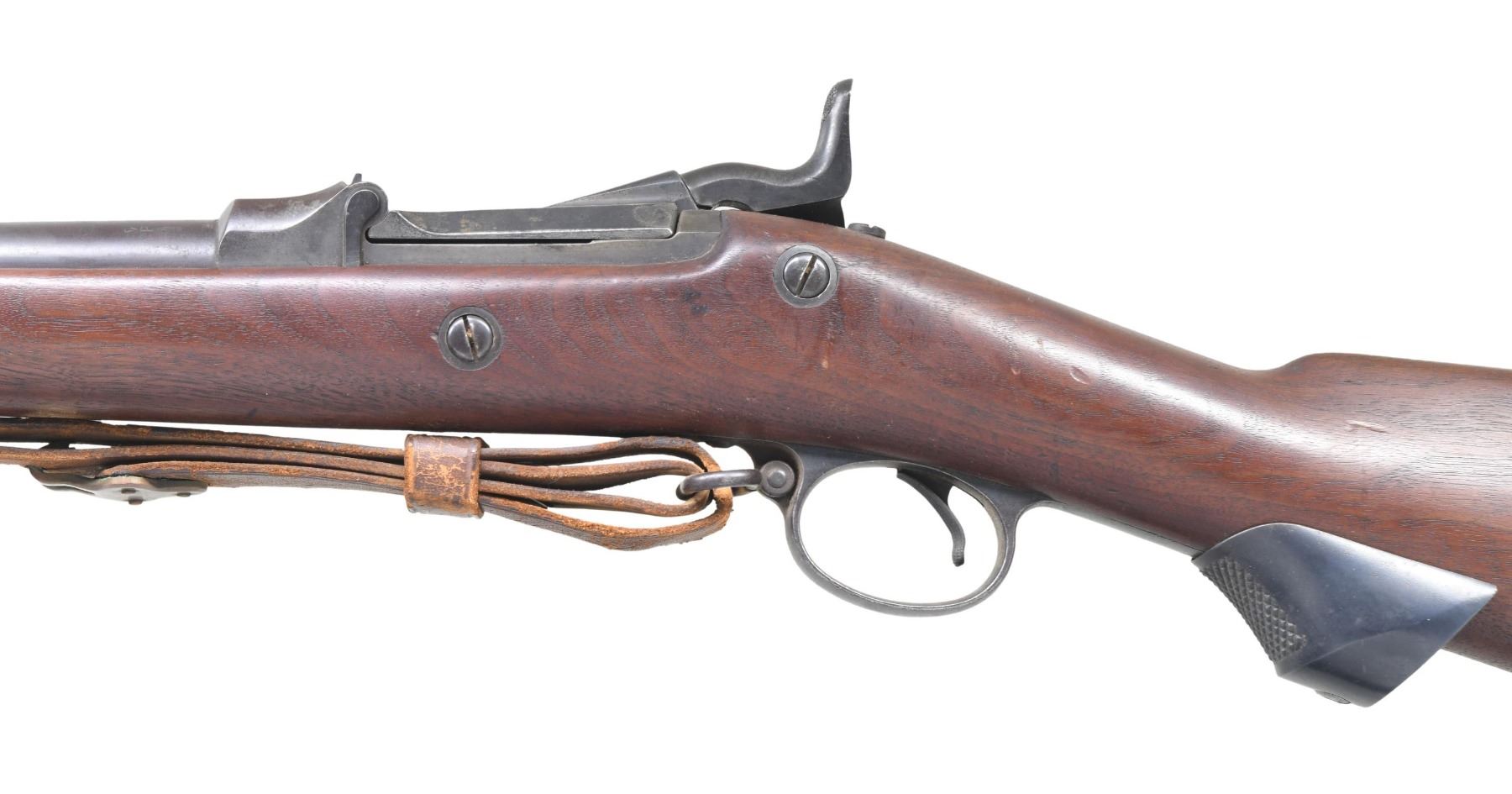 TRAPDOOR SINGLE SHOT RIFLE. Cal. 45-70. S# 128274, in the Model 1879 S# range. Bbl. 32 5/8" fitted with standard Model 1888 ramrod-bayonet. Hooded blade front sight with Model 1884 Buffington rear sight. "1884" dated breechblock with Springfield marked lock. 2-band walnut stock with iron fittings, checkered steel pistol grip extension, and leather sling. CONDITION: bbl. blue is fading to brown. Action has mottled gray/brown appearance. Stock shows light wear with scattered handling marks having small chips around lock and tang areas. Sound lock and action. Lightly pitted bore retains strong rifling. (01-27198/DS). ANTIQUE. $700-1,000.