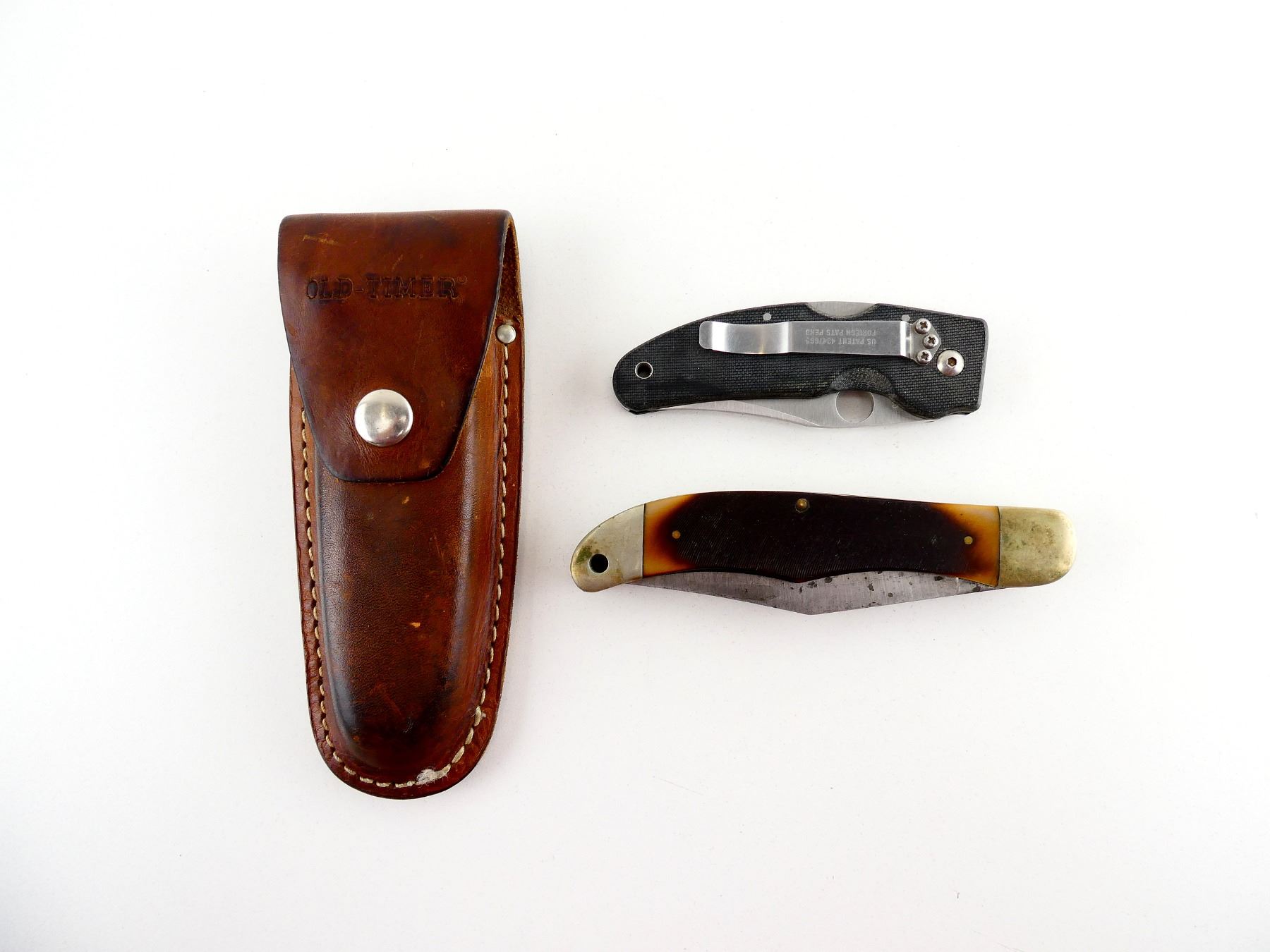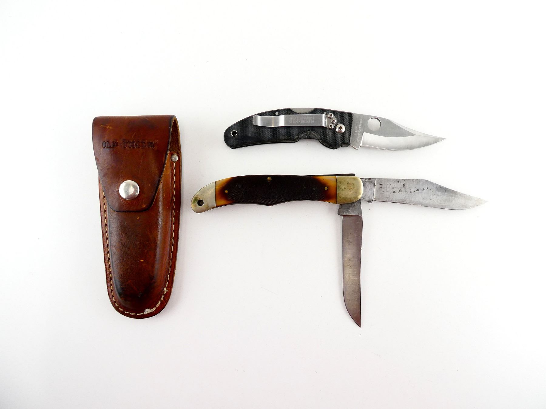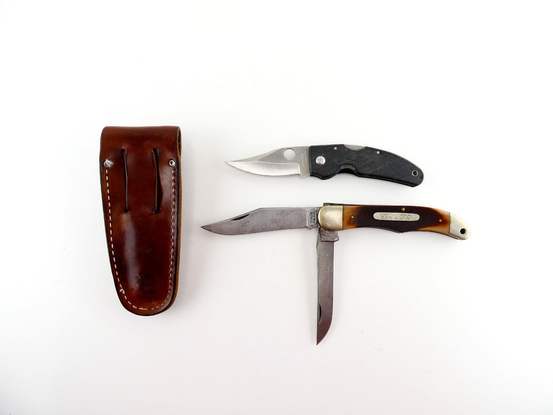 LOT INCLUDES; (1) SPYDERCO FOLDING KNIFE, STAINLESS STEEL BLADE, MARKED "SPYDERCO", CARBON FIBER HANDLE, UNMARKED, SHOWS LIGHT WEAR & TEAR / USE MARKS, BLADE OVERALL LENGTH APPROX. 3", OVERALL LENGTH APPROX. 7" & (1) OLD TIMER FOLDING KNIFE, WITH 2 BLADES, STEEL BLADES, 1 BLADE MARKED "SCHRADE U.S.A. 250T", 1 BLADE UNMARKED, POLYMER HANDLE, MARKED "OLD TIMER", SHOWS WEAR & TEAR / USE MARKS, BLADE OVERALL LENGTH APPROX. 4" & 4.25", OVERALL LENGTH APPROX. 5.25", WITH BROWN LEATHER SHEATH, MARKED "OLD TIMER". SEE PHOTOS.