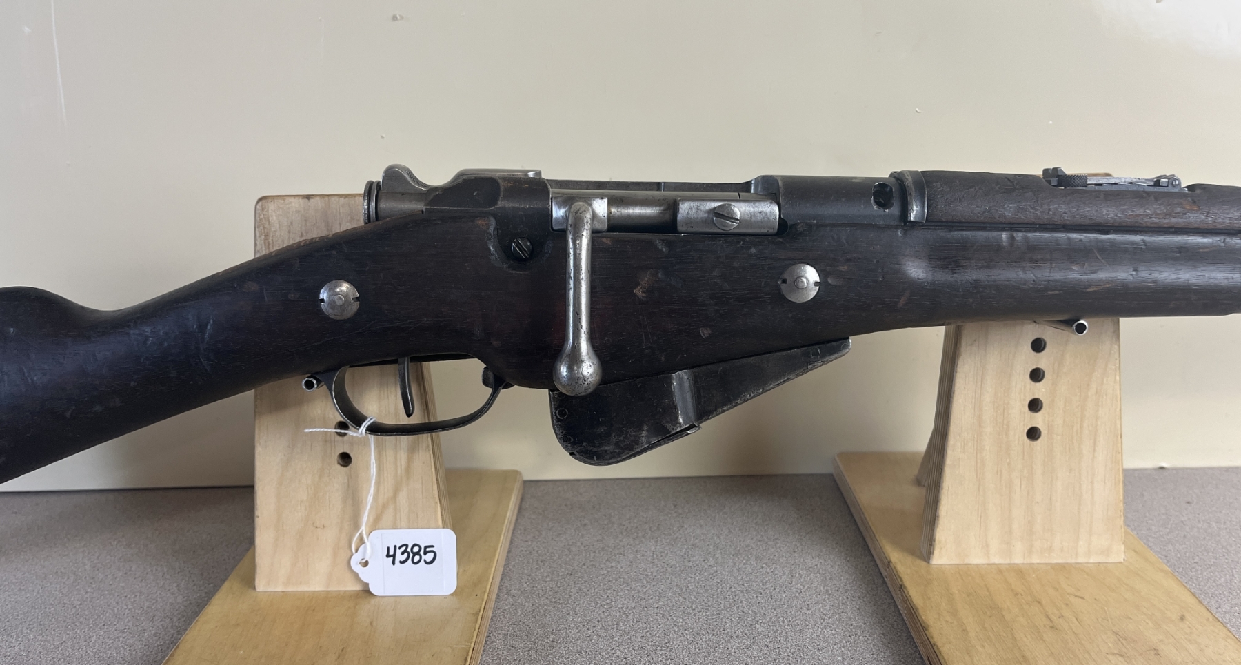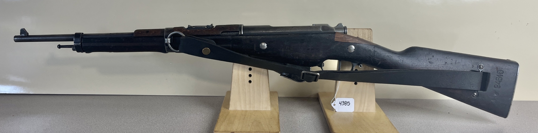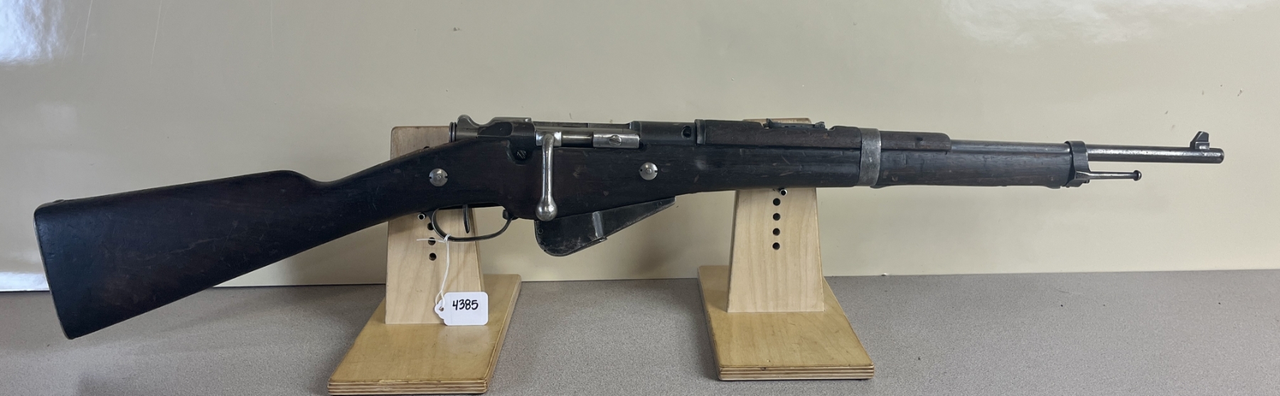 CONDITION: F OVERALL INCL BORE. DRILLED THROUGH CHAMBER (ATTEMPTED DEACTIVATION?) SPECS: 18IN BBL W/ IRON SIGHTS. EXTRAS: LEATHER STRAP. S/N: 80779.