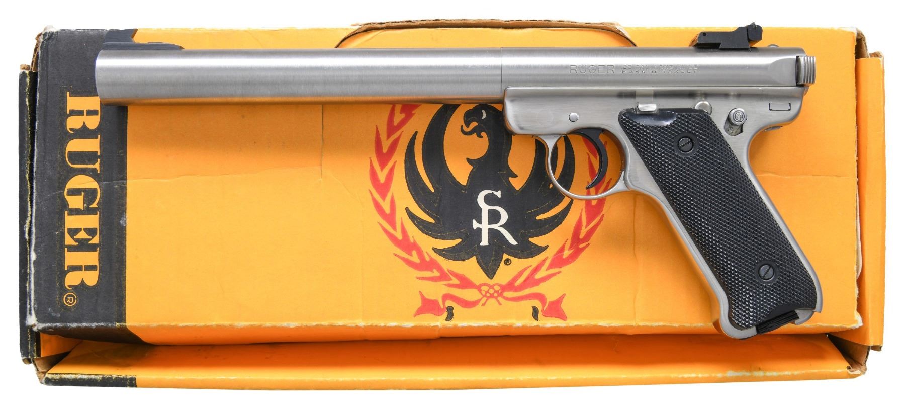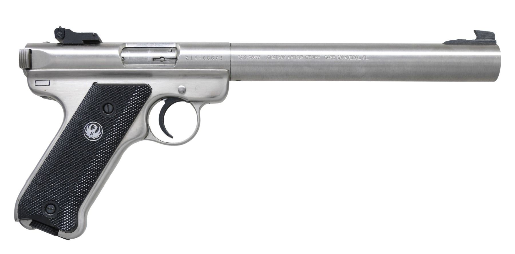 INTEGRAL SOUND SUPPRESSOR BY JONATHAN ARTHUR CIENER. Cal. 22LR. S# S219-08672 (Suppressor) 219-08672 (Pistol). Bbl. 8 3/8". Stainless Steel Ruger MKII Target Pistol w/ matching Stainless Steel Jonathan Arthur Ciener integral sound suppressor. This has the outward appearance of a bull barrel. Exposed blade front sight. Adjustable rear sight. Factory black plastic grips. MAGS: 1 factory 10 rd. UNATTACHED ACCESSORIES: Factory box & paperwork. CONDITION: All aspects indicate very little use. Exterior finish free of any noticeable blemishing. Internals indicate proper maintenance. Some light carbon at face of barrel. Bore is bright w/ visible rifling. Fire control mechanism appears to function correctly when cycled by hand. NATIONAL FIREARMS ACT SOUND SUPPRESSOR REQUIRING BATF TRANSFER BEFORE TAKING POSSESSION. FULLY TRANSFERABLE. (03-1863 / 25-2137/JZ). MODERN. CLASS III. $700-1,100.