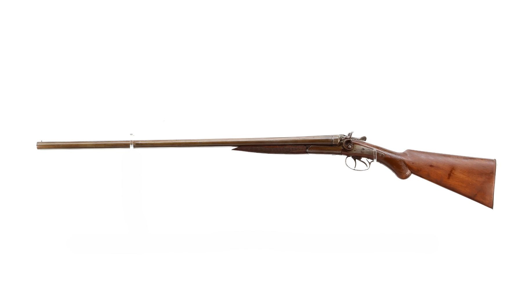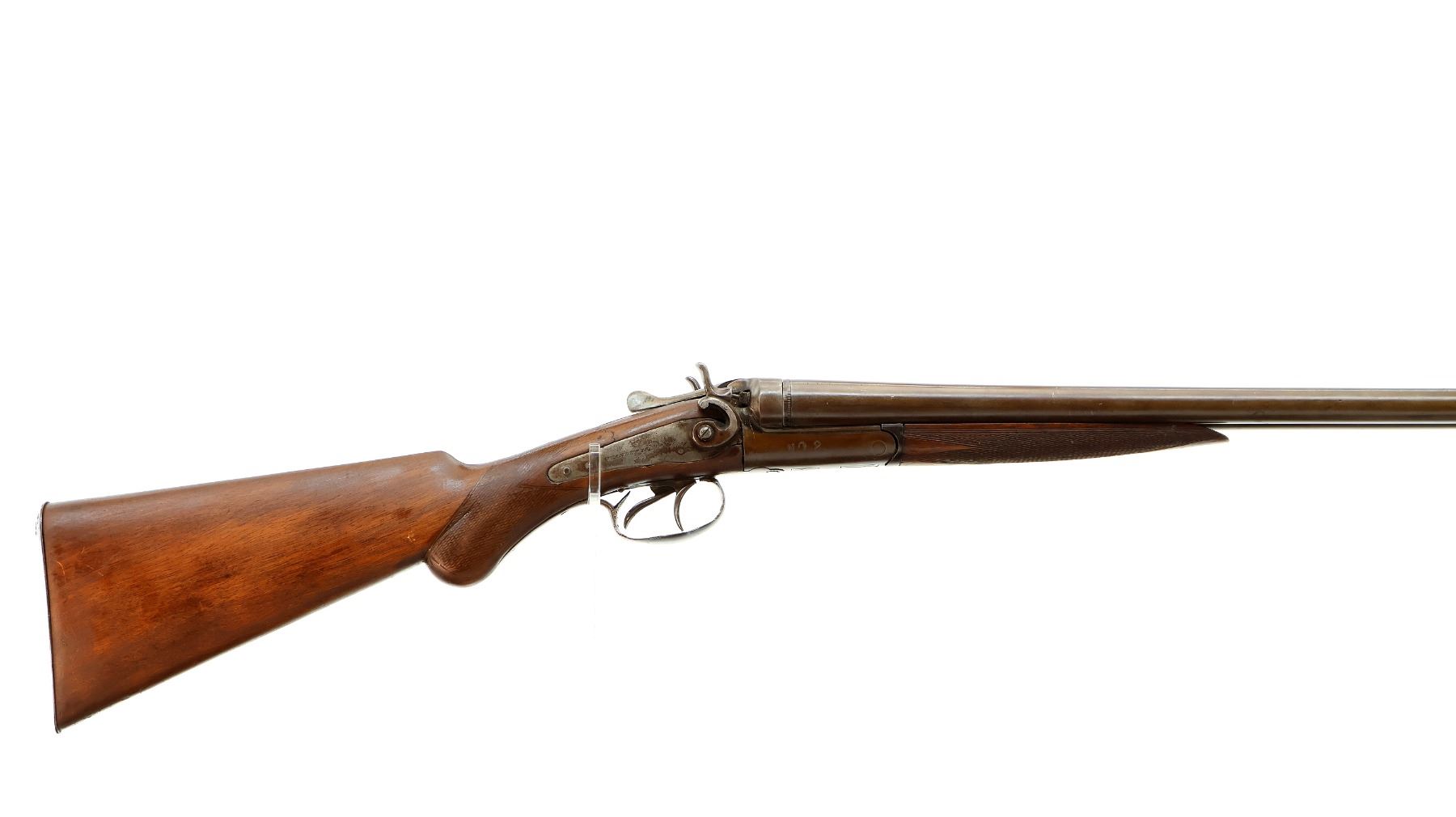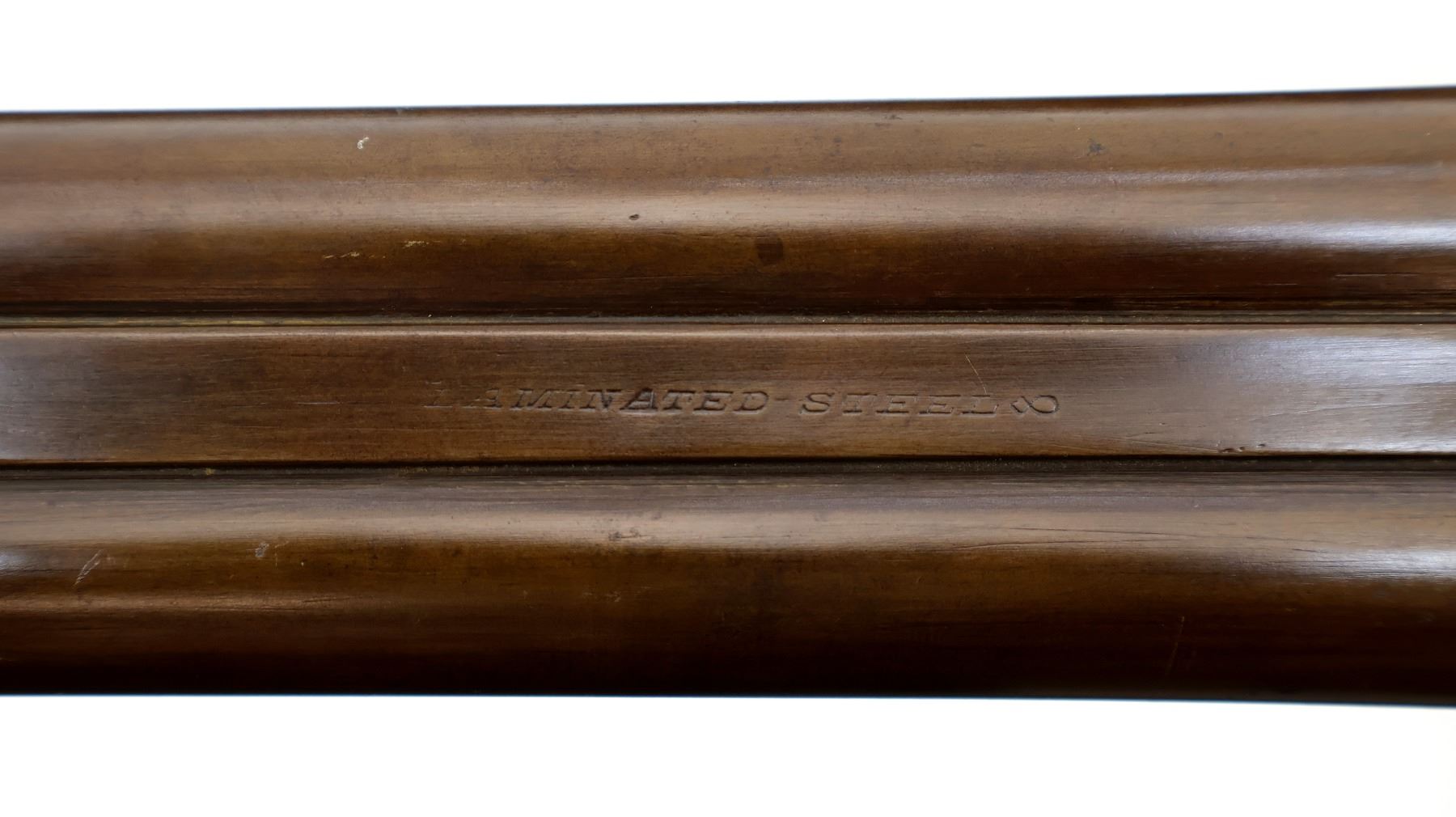 Main Description: Brass bead, laminated steel barrels with smooth rib that are loose on face, back action locks with checkered spur hammers that function, extractor, double triggers. Two piece wood stocks, checkered forearm and pistol grip, chipped and cracked behind receiver, locks and through wrist, grooved steel butt plate.