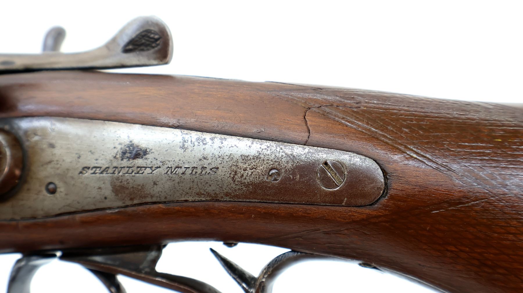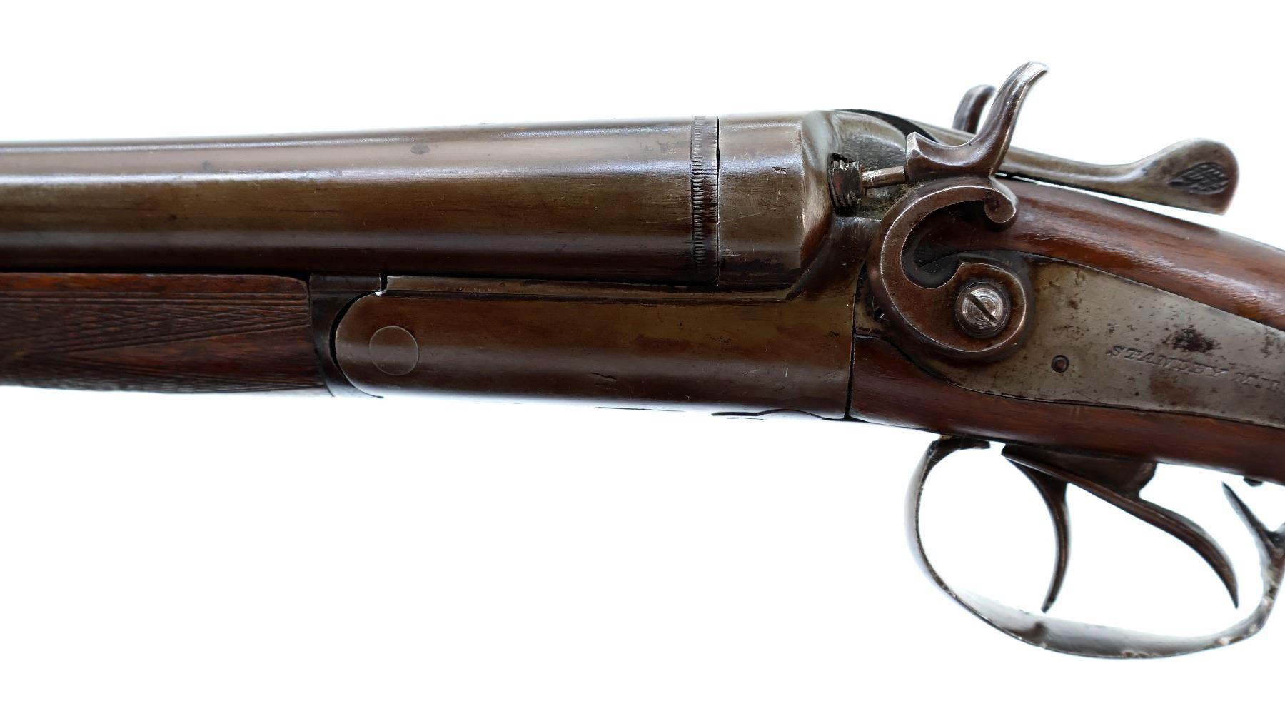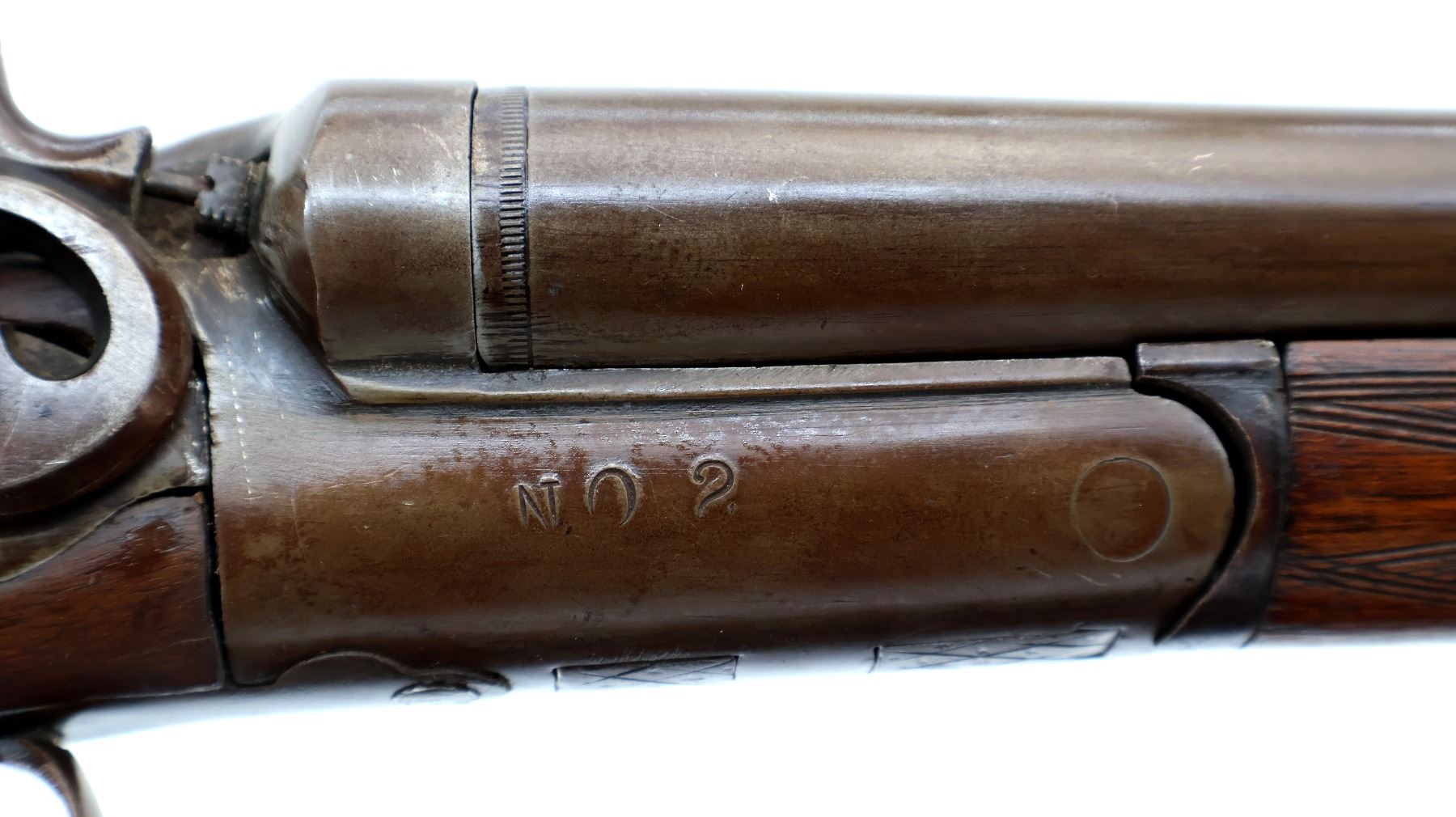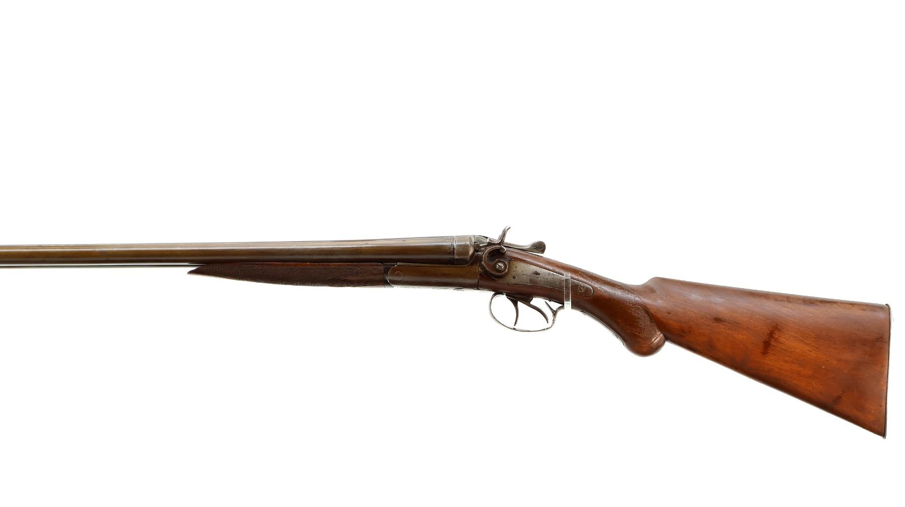 Main Description: Brass bead, laminated steel barrels with smooth rib that are loose on face, back action locks with checkered spur hammers that function, extractor, double triggers. Two piece wood stocks, checkered forearm and pistol grip, chipped and cracked behind receiver, locks and through wrist, grooved steel butt plate.