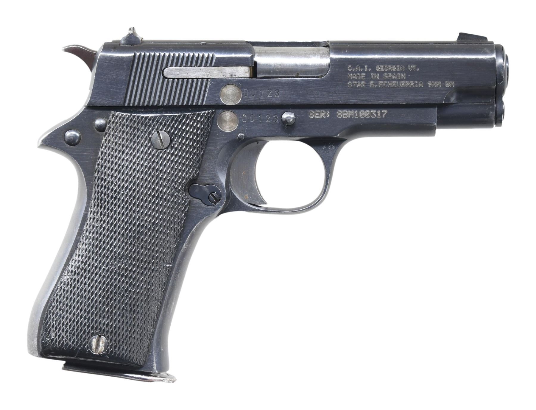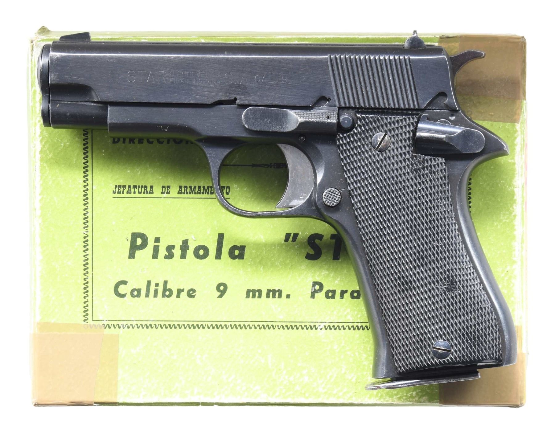 Cal. 9x19. S# SBM100317. Bbl. 3 5/8". Blade front sight. Square notch rear sight. Matching numbers on slide & frame. Right side of slide has Century import marking. Right side of frame has importer added serial number. Right side of trigger guard has "76" marking denoting mfr. in 1976. Arsenal rework blue finish. Checkered black grips. MAGS: 2-8 rd. both marked with white paint identifying model. UNATTACHED ACCESSORIES: factory box that is numbered to a different pistol with cleaning rod & manual. Box shows scattered wear along its edges & some tape repairs. CONDITION: grips have a dark appearance with some checkering wear, dings & handling marks. Metal retains 90% arsenal rework blue with some blued over dings, edge wear, fading, light oxidation & grip strap wear. Action functions properly when hand cycled. Very good bright bore with some light oxidation. (25-3393/MJC). MODERN. $250-350.