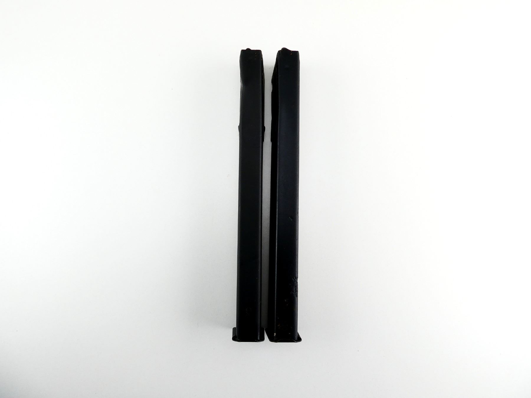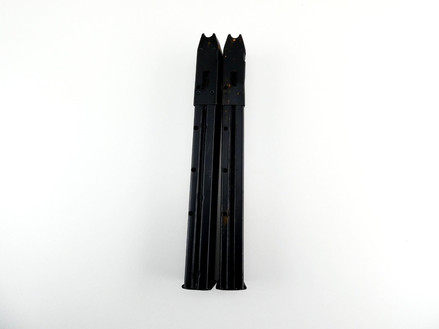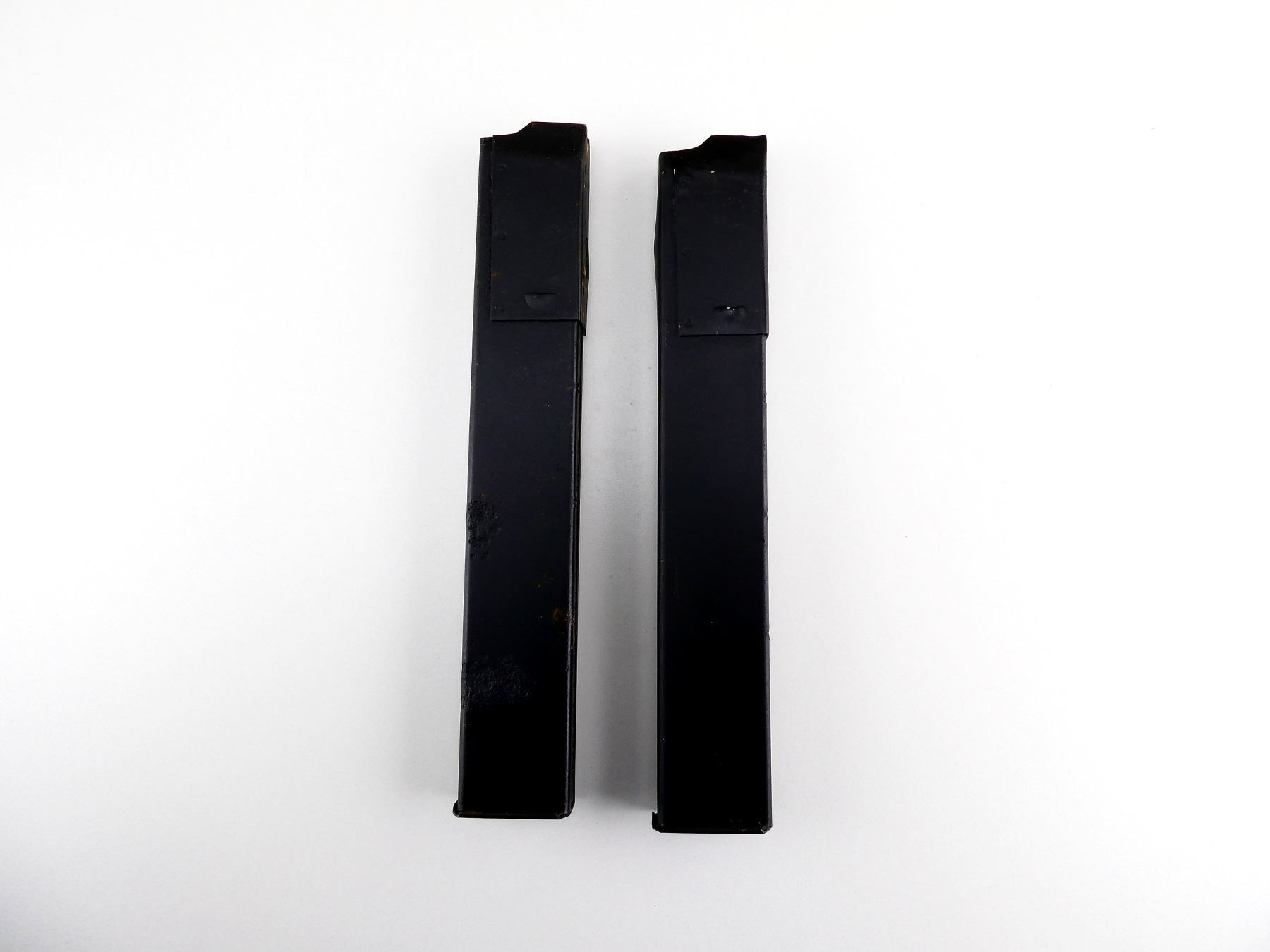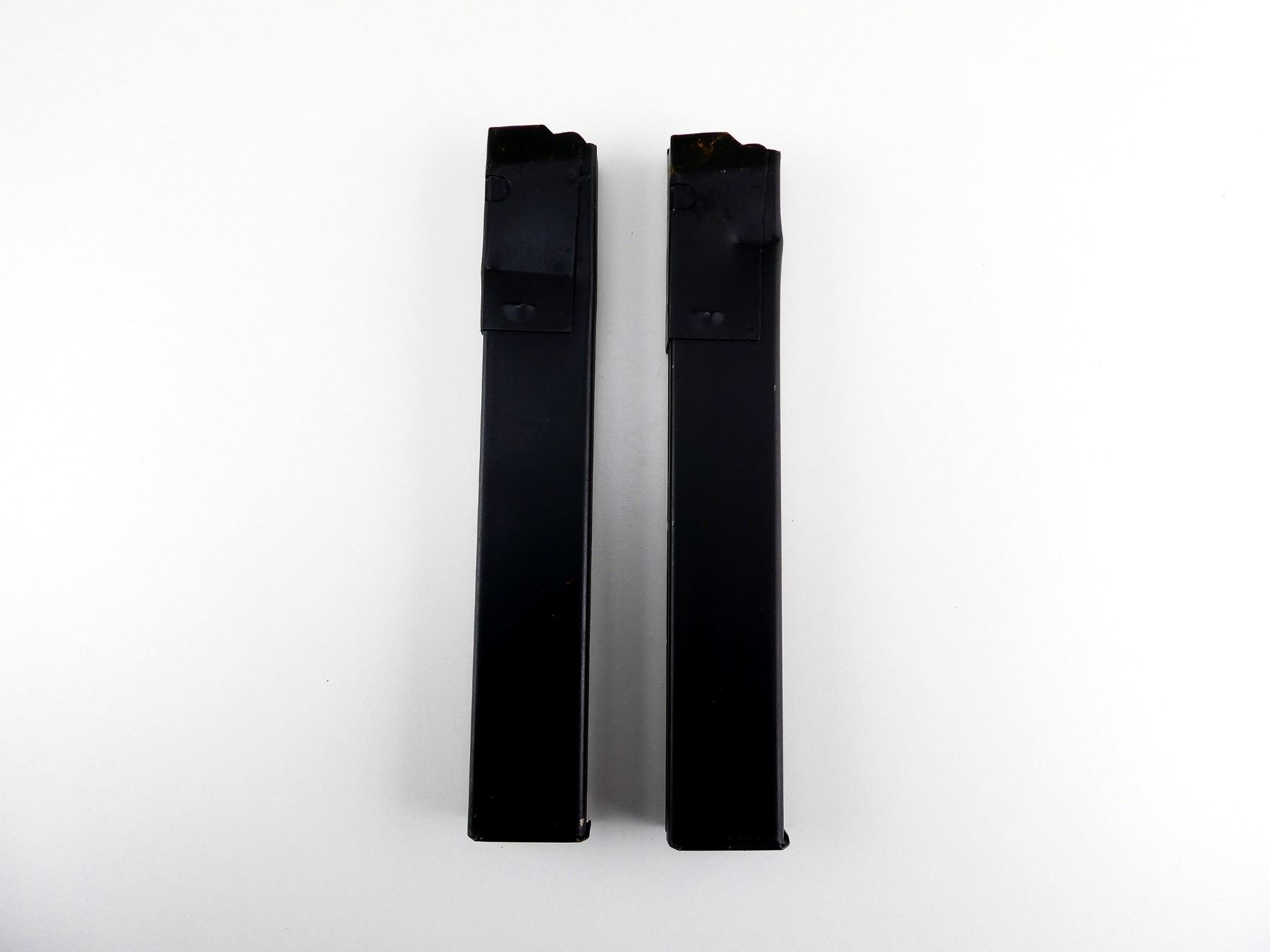 LOT INCLUDES; (2) 9MM, 0/32 ROUND PINNED MAG (DEACTIVATED), BLACK PAINTED STEEL, ONE MARKED: "KC" & C-BROAD ARROW. SEE PHOTOS. PAL REQUIRED.