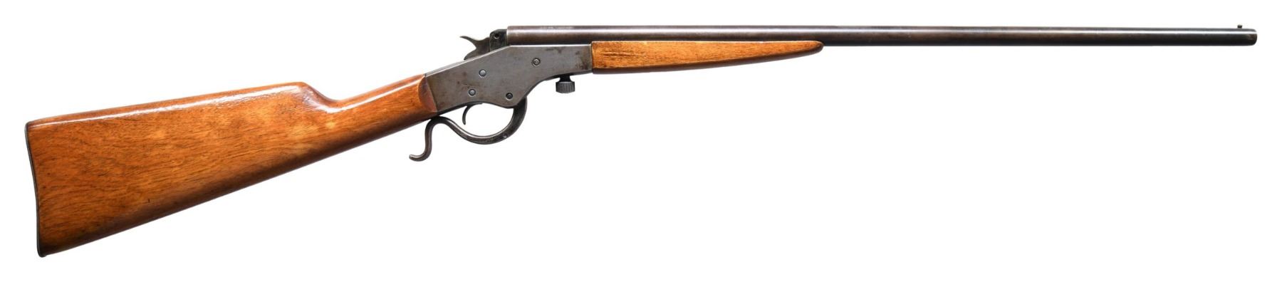 Cal. 22 Shot. NSN. Bbl. 22" rnd. smoothbore. Bead front sight. Hardwood stock set that is loose. CONDITION: refinished stock set has added varnish with a small crack behind action, scattered flaking, dings & handling marks. Metal is a mix of gray colors with scattered oxidation, light pitting & traces of finish. Hammer may require attention to function properly. Very good bright bore. (25-2047/MJC). CURIO. $300-400.