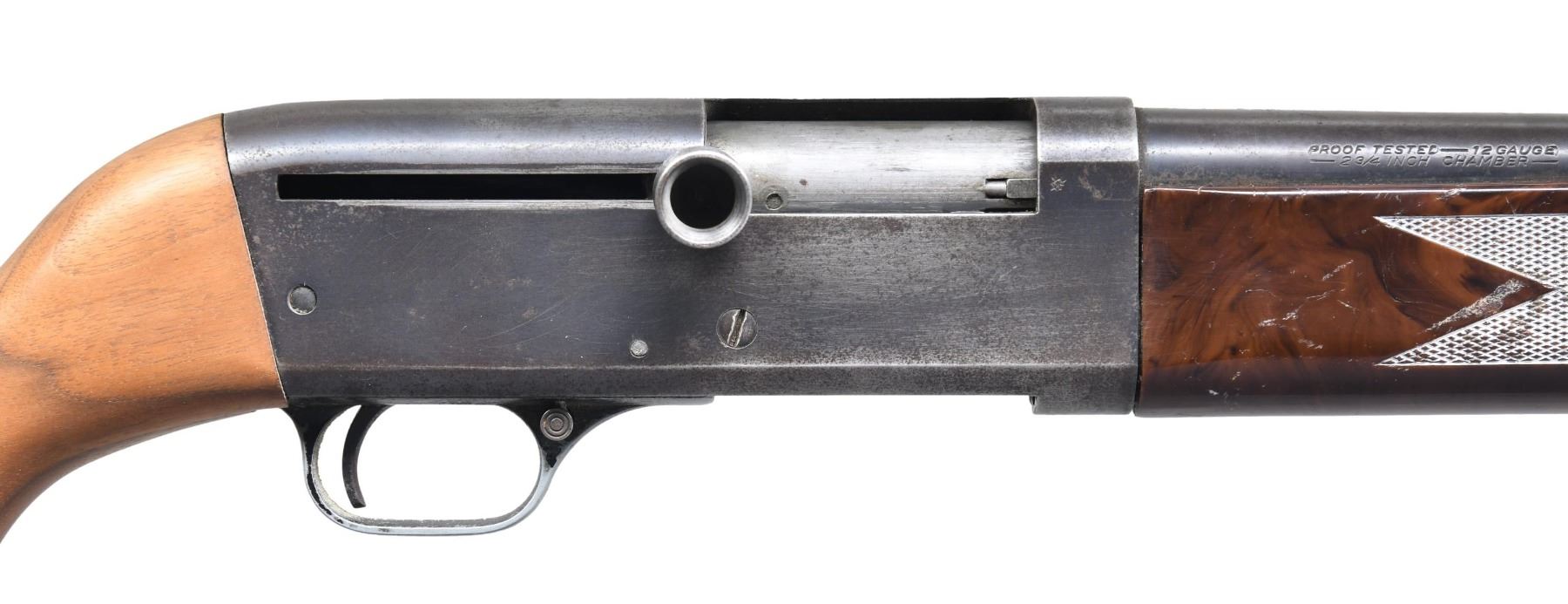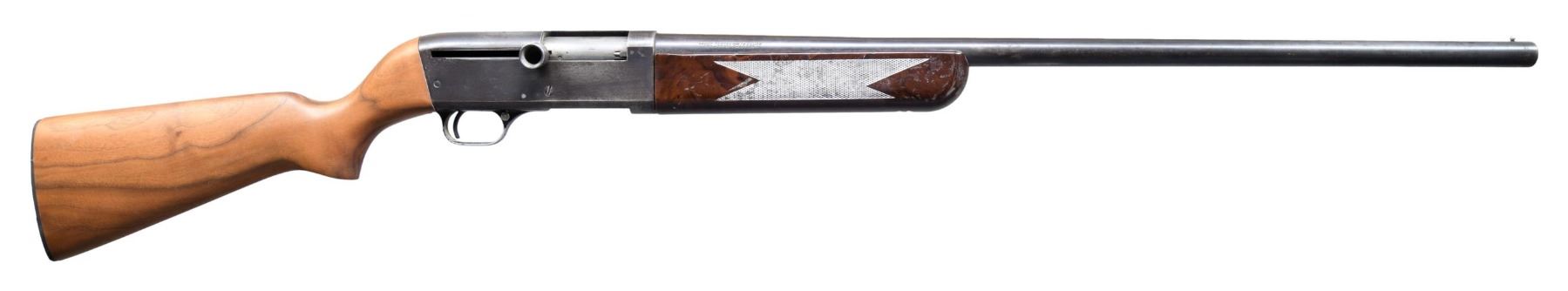 Cal. 12 Ga. 2 3/4". NSN. Bbl. 28". Silver bead front sight. Unique straight pull shotgun. Blued finish. Replacement hardwood pistol grip stock with brown synthetic forend. CONDITION: stock shows light handling wear. Forend shows scattered white staining, flaking & handling marks. Metal is turning gray with strong traces of blue, edge wear & scattered oxidation. Action does not engage when hand cycled & may require parts & attention to fix. Very good bore. (25-2110/MJC). CURIO. $100-200.