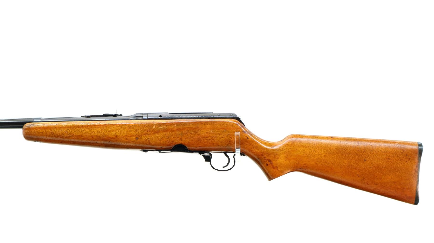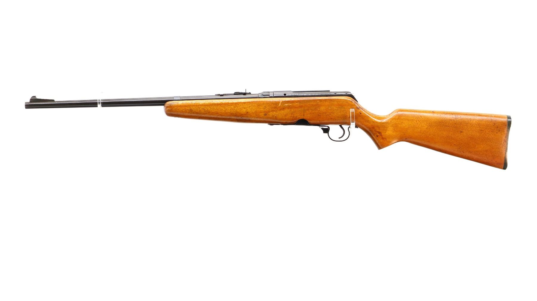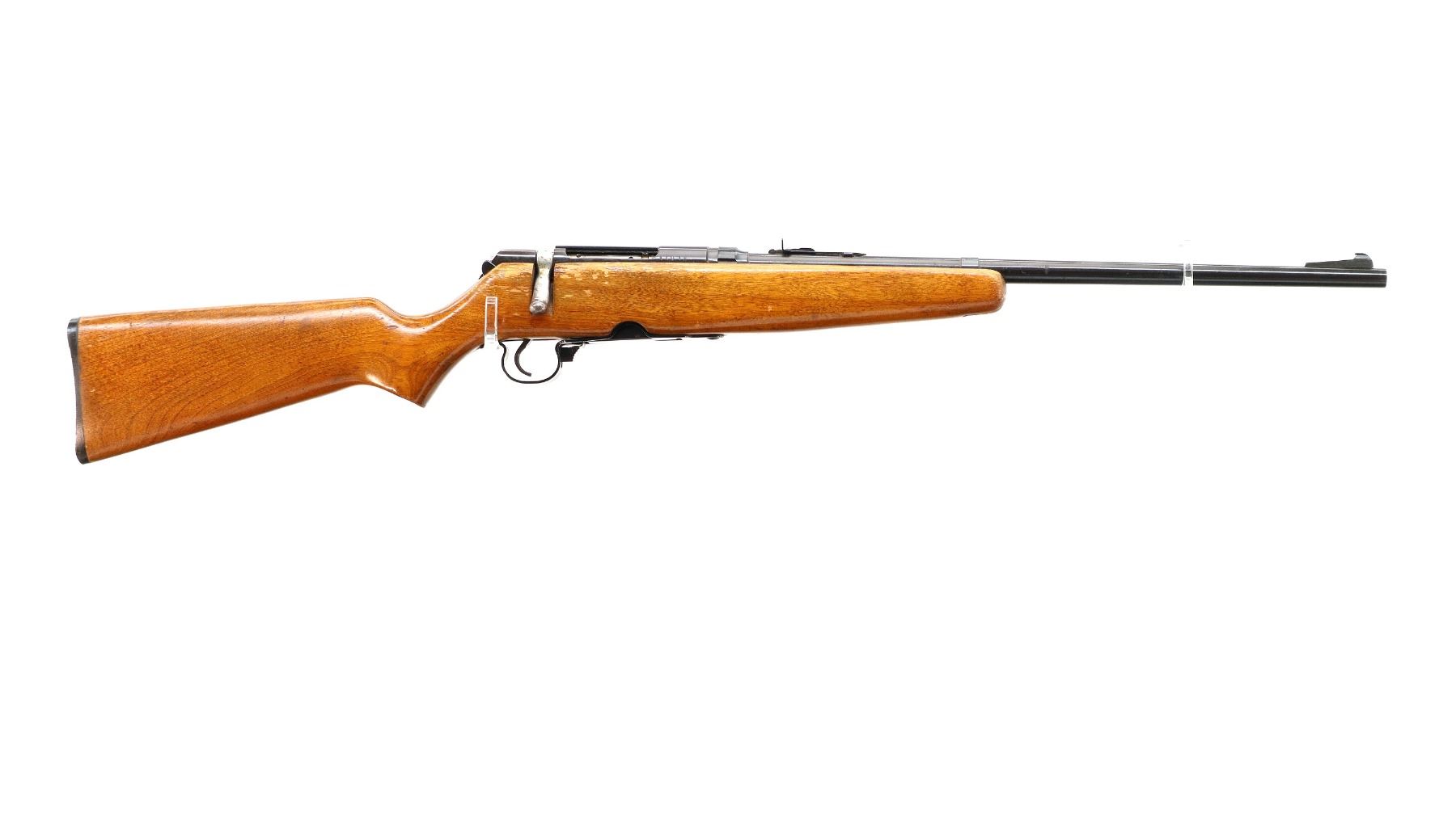 Main Description: Blade front sight with ramp, adjustable u notched rear sight, blued finish, Butter knife bolt handle. One piece wood stock, pistol grip, grooved black polymer butt plate