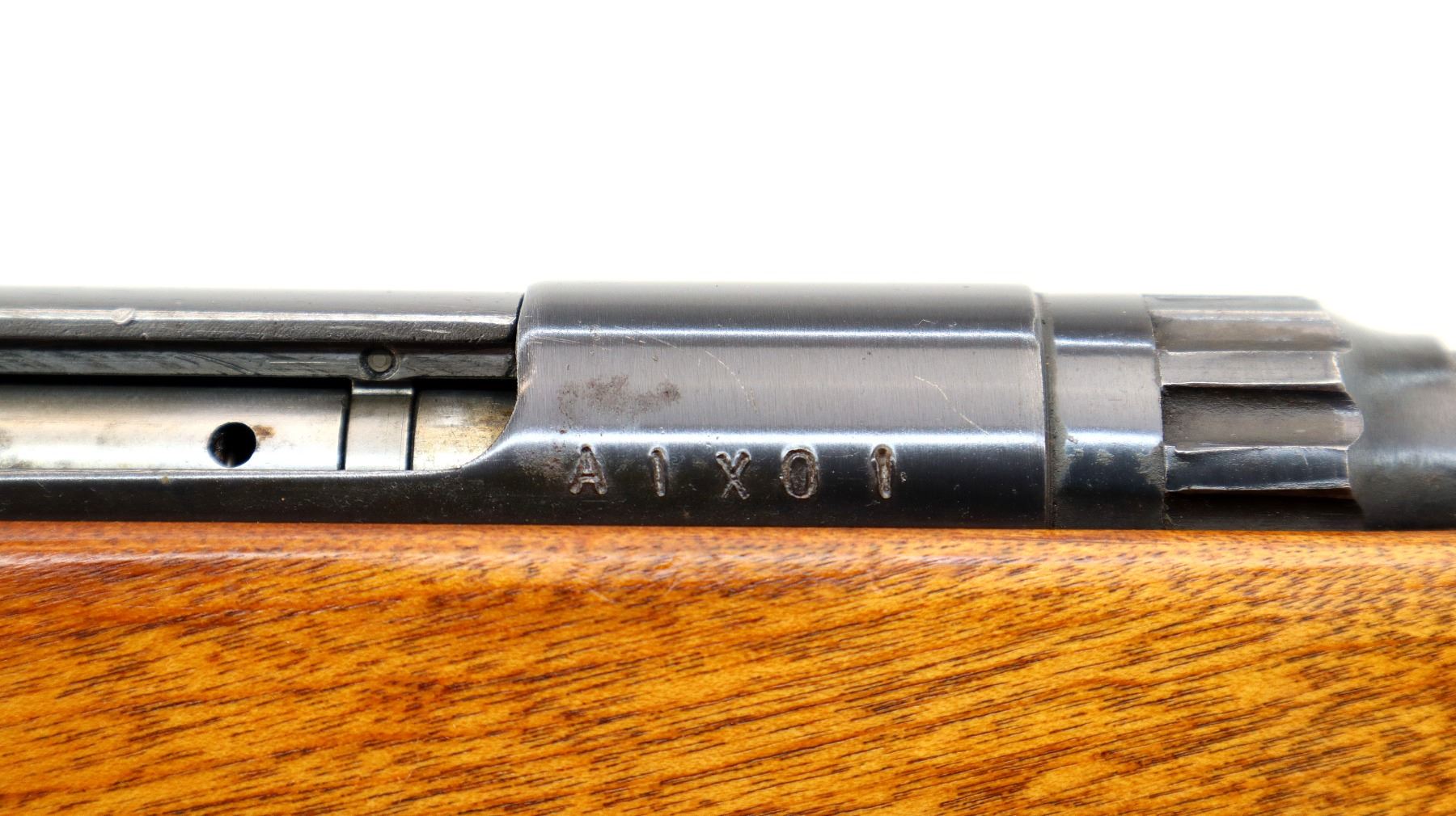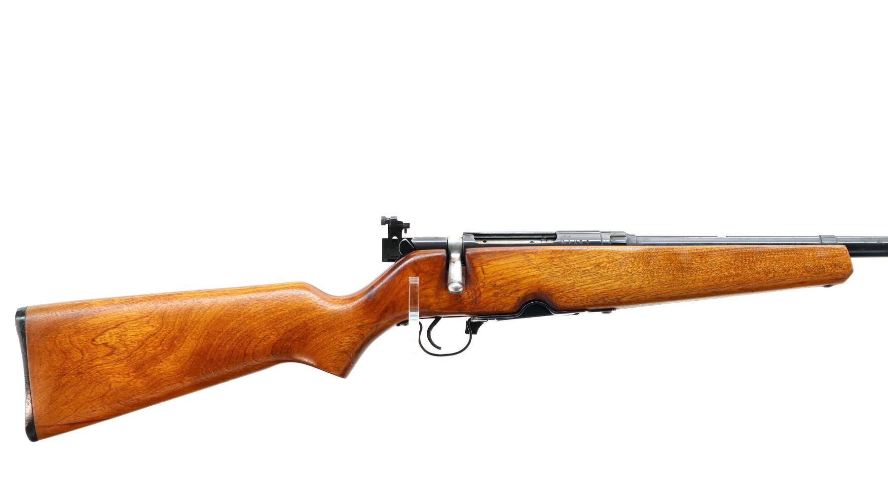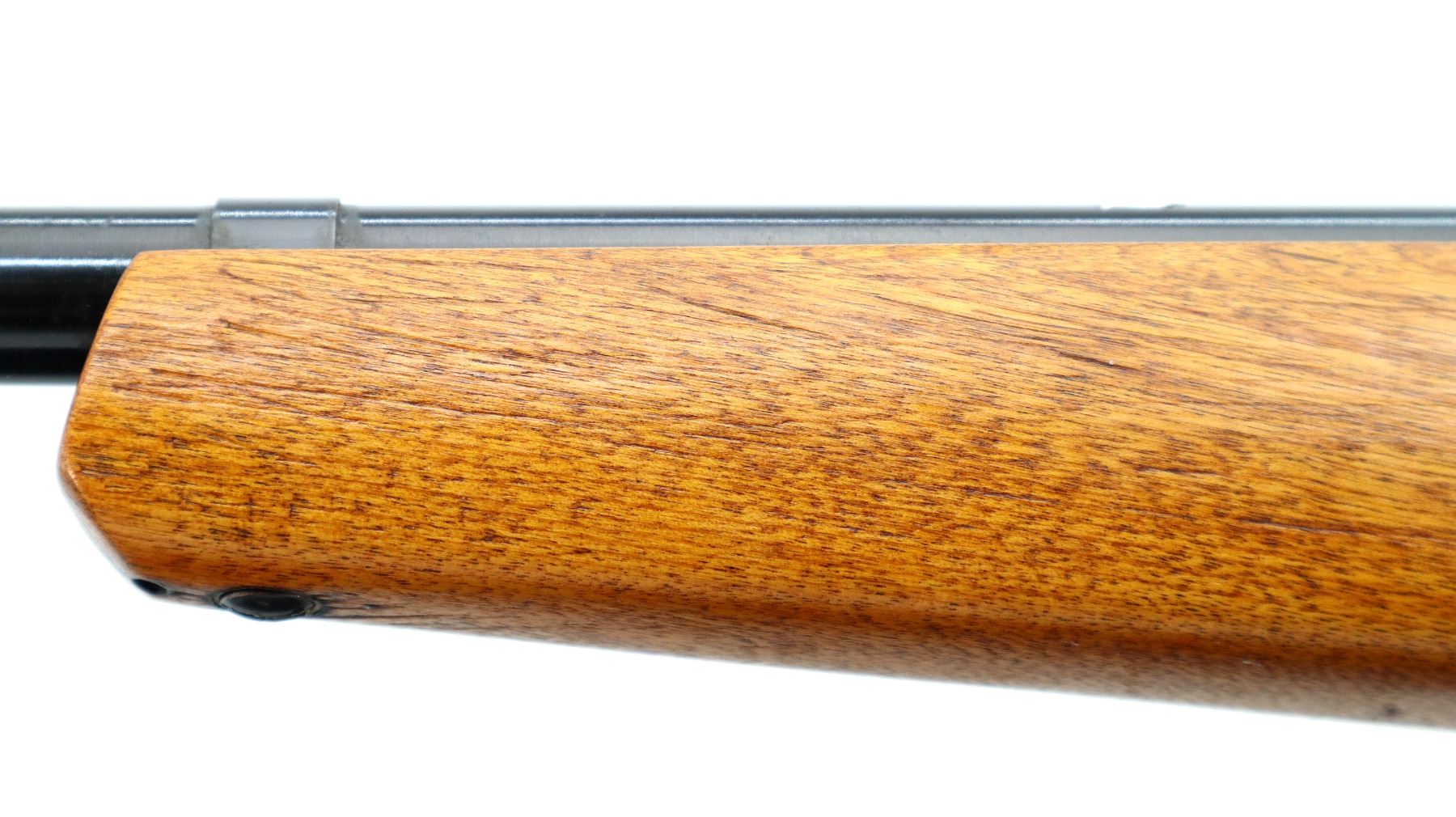 Main Description: Blade front sight with ramp, missing rear sight dovetail present, receiver drilled and tapped with adjustable peep sight installed, blued finish, butter knife bolt handle. One piece wood stock, pistol grip, grooved black polymer butt plate, missing swivels holes are present.