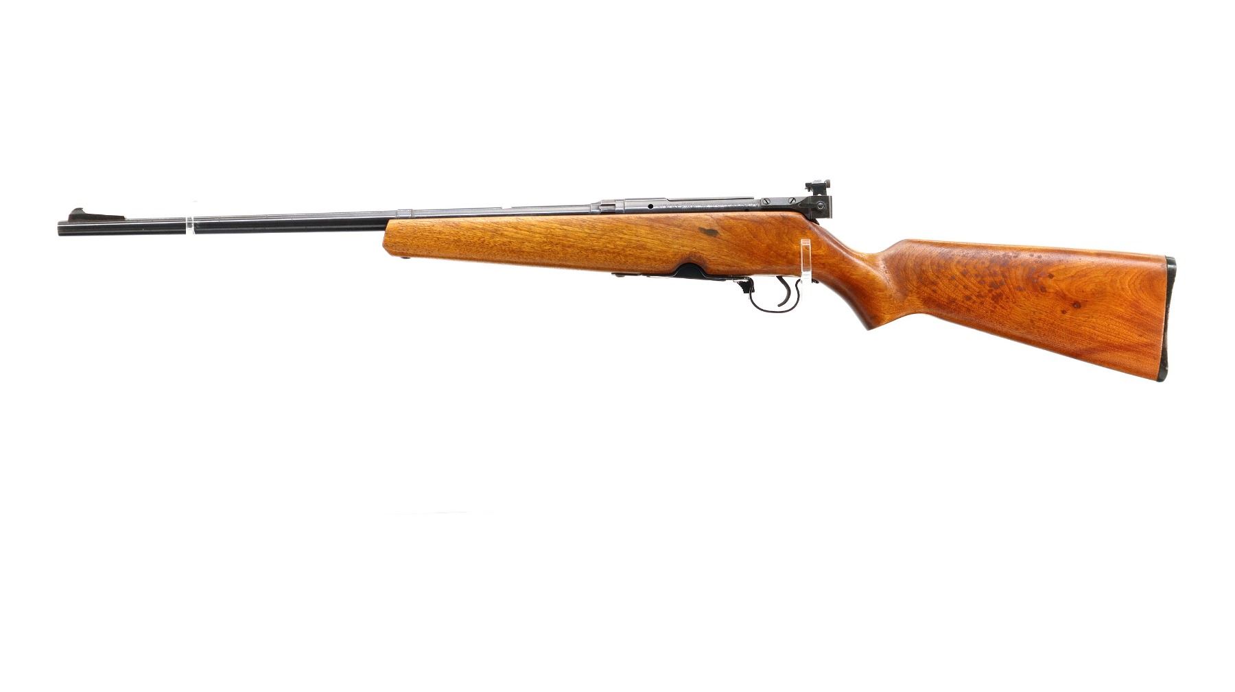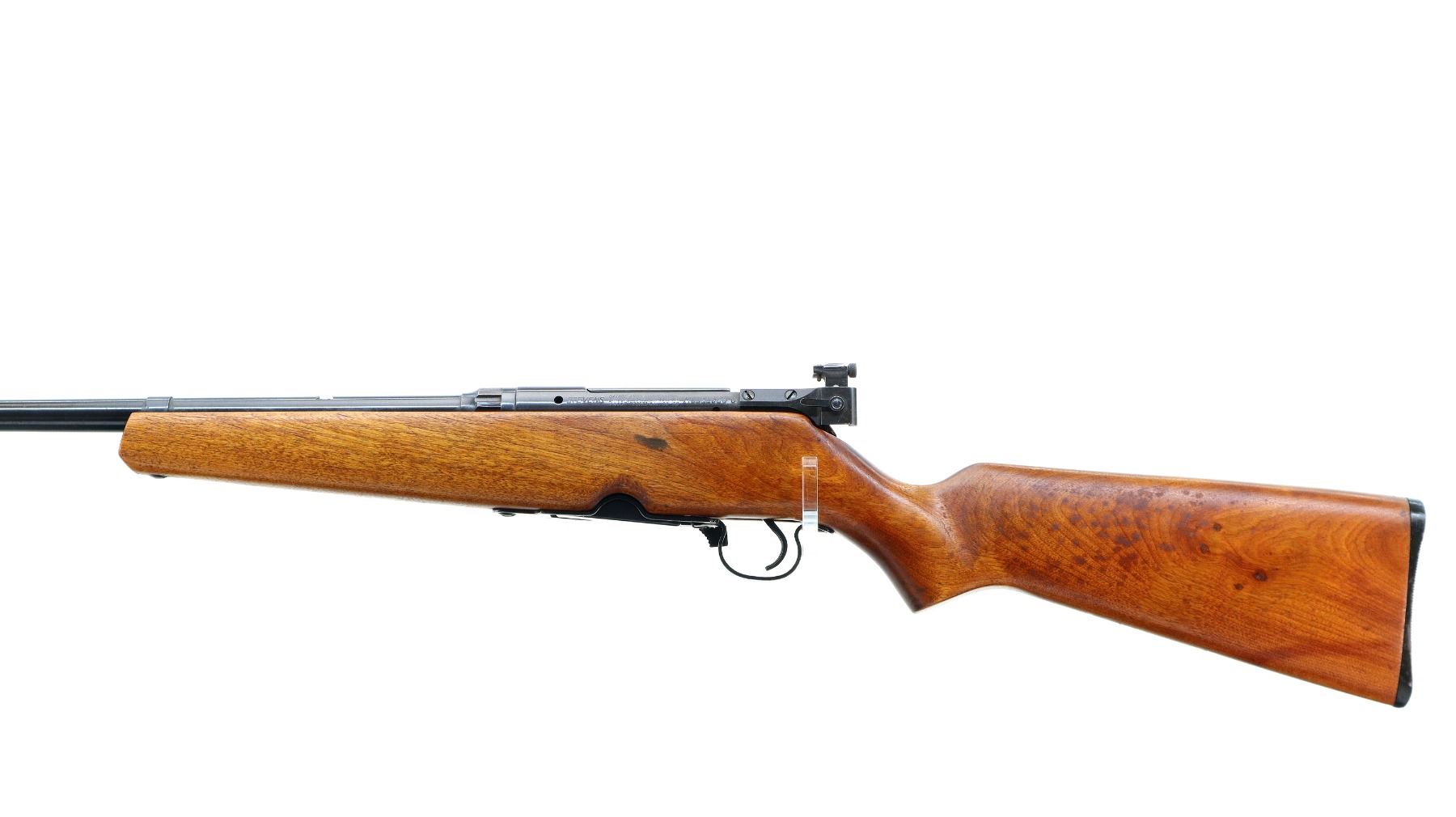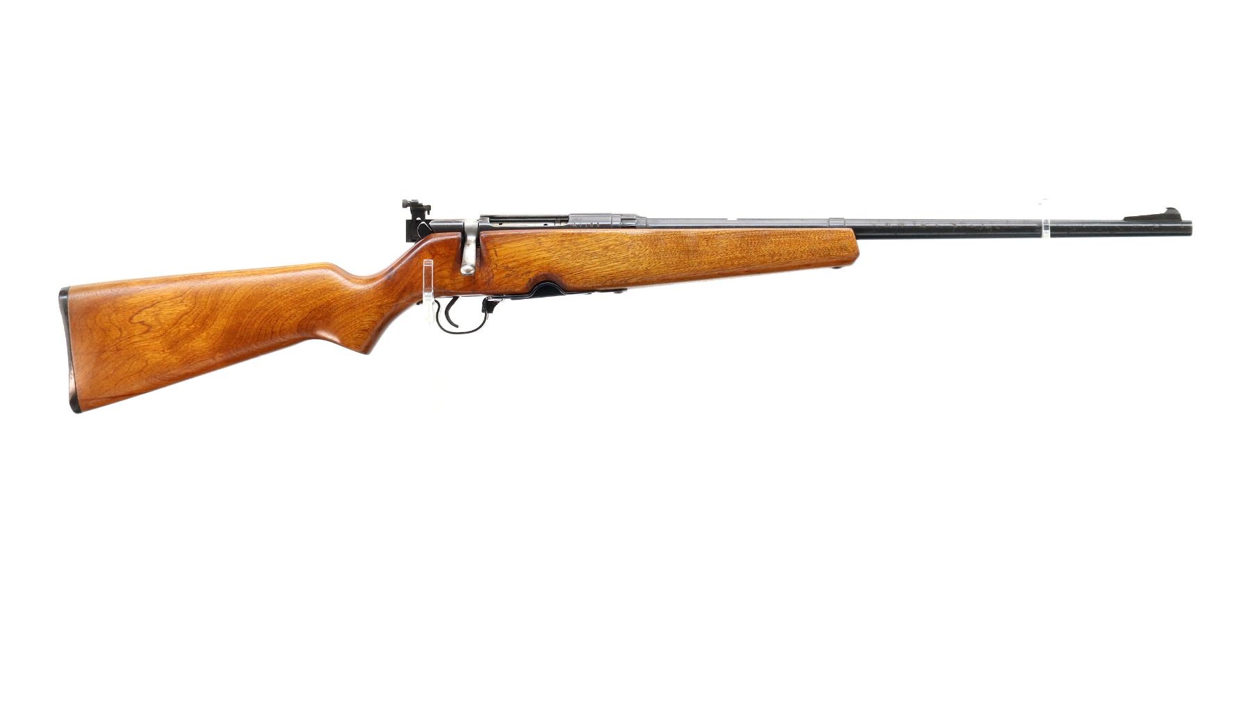 Main Description: Blade front sight with ramp, missing rear sight dovetail present, receiver drilled and tapped with adjustable peep sight installed, blued finish, butter knife bolt handle. One piece wood stock, pistol grip, grooved black polymer butt plate, missing swivels holes are present.