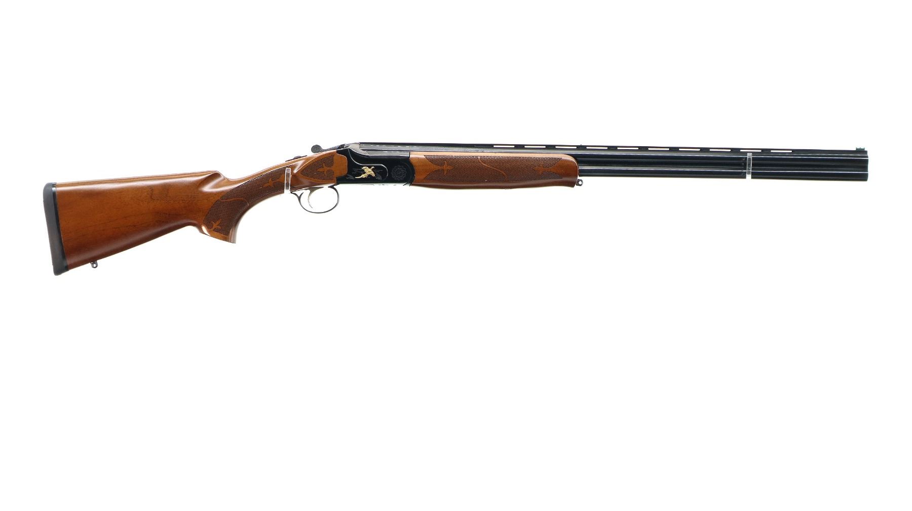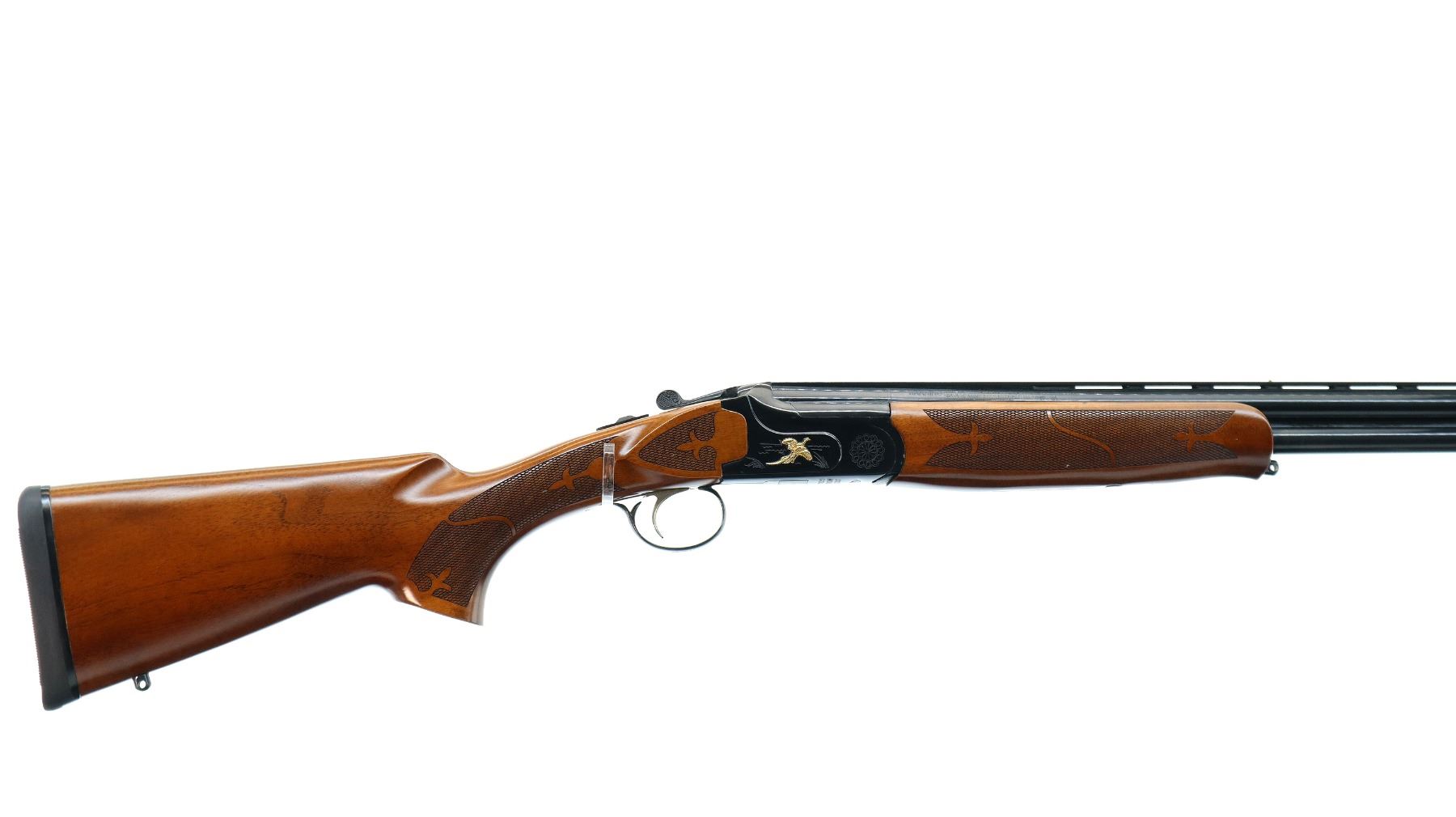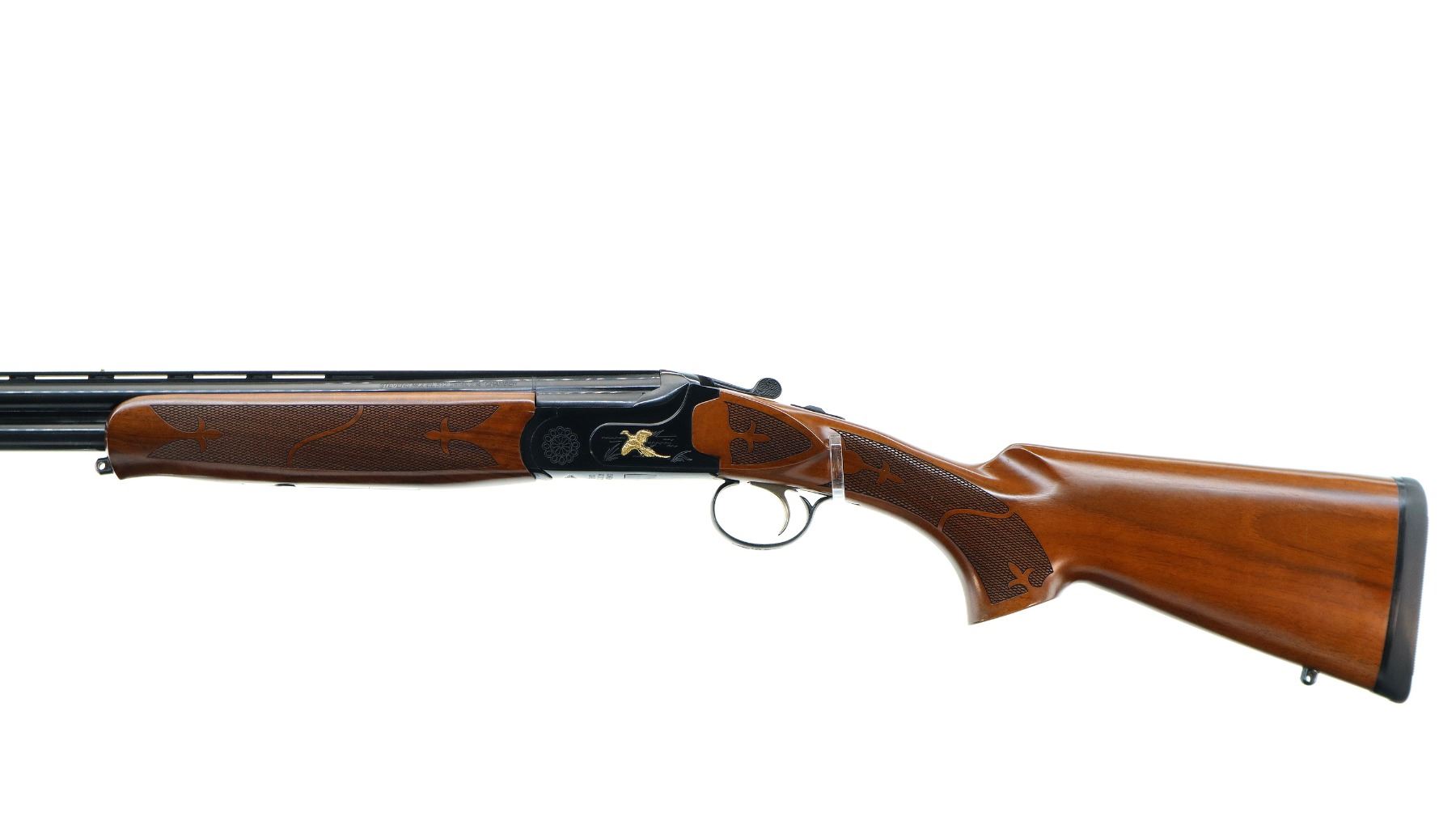 Main Description: Green fiber optic front and brass mid rib beads, blued vent rib barrels, black alloy engraved receiver with gold Birds, manual selective safety, extractor, single silver mechanical trigger. Two piece wood stocks, checkered forearm and pistol grip, black rubber recoil pad, swivel studs.