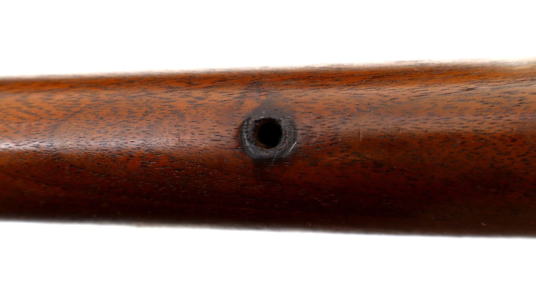 Main Description: Silver bead, blued finish, round barrel. Two piece wood stocks, grooved forearm, checkered pistol grip, missing butt plate, screws and rear swivel, hole present has the front sling swivel.