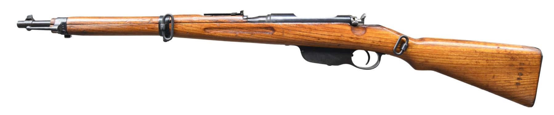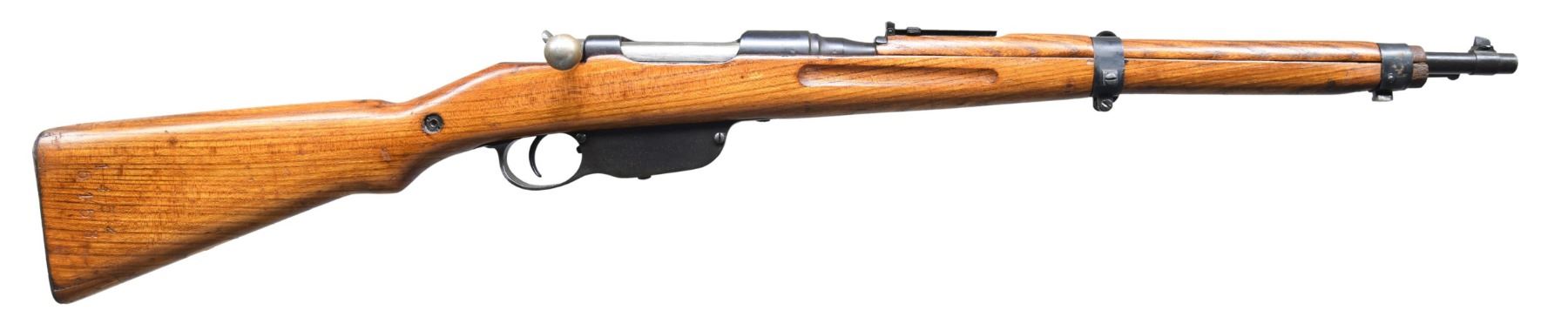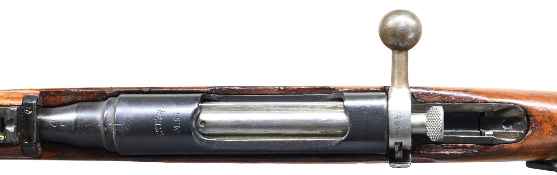 Cal. 8x56R. S# 5153S. Bbl. 20". Blade front sight. Ladder graduated to 2200m. All matching numbers as arsenal reworked. Steyr M95 straight pull bolt action converted to carbine length & updated to 8x56 likely by Bulgaria. Bbl. shank has "S" marking for 8x56 update & faint Austrian 1917 acceptance date. Arsenal rework blued finish. Hardwood stock set with left side sling swivels & plugged bottom sling holes. CONDITION: arsenal reworked stock set has a few armorer patch repairs, a few dings & scattered handling marks. Metal retains 95% arsenal rework blue with some blued over oxidation, notable wear on bottom of bayonet lug, light edge & handling wear. Action functions properly when hand cycled. Worn bore with scattered frosting & pitting. (25-3781/MJC). CURIO. $200-300.