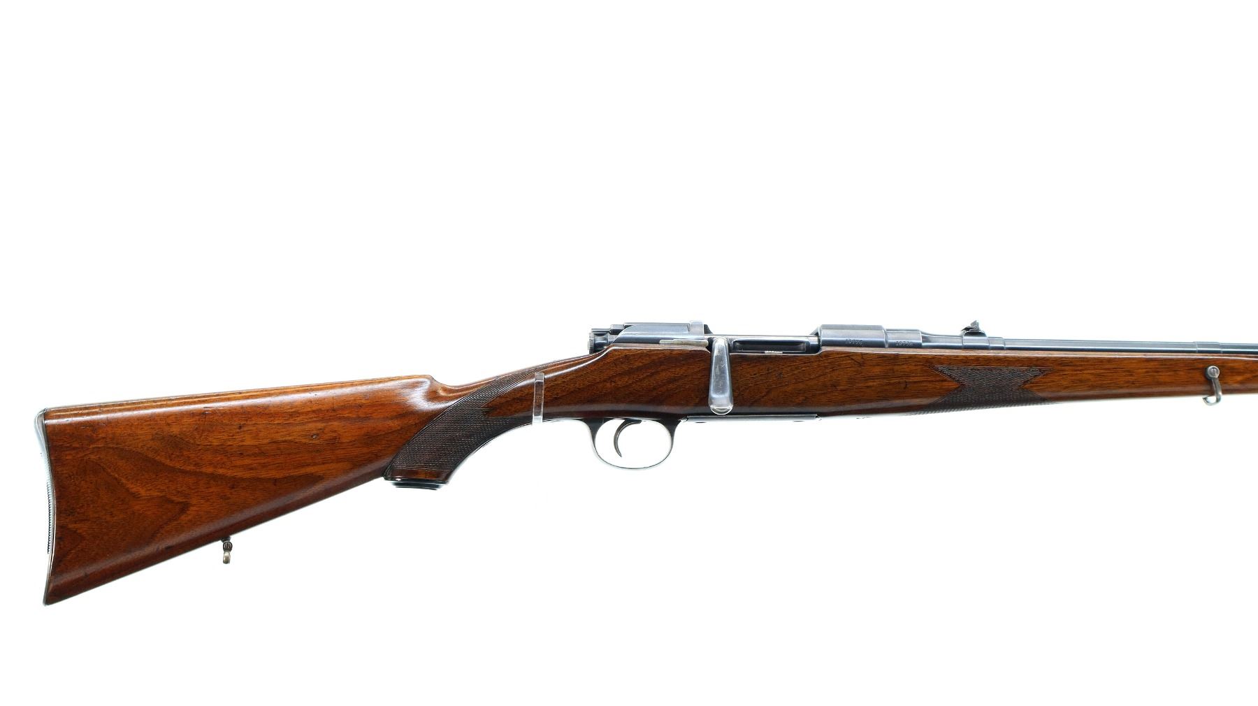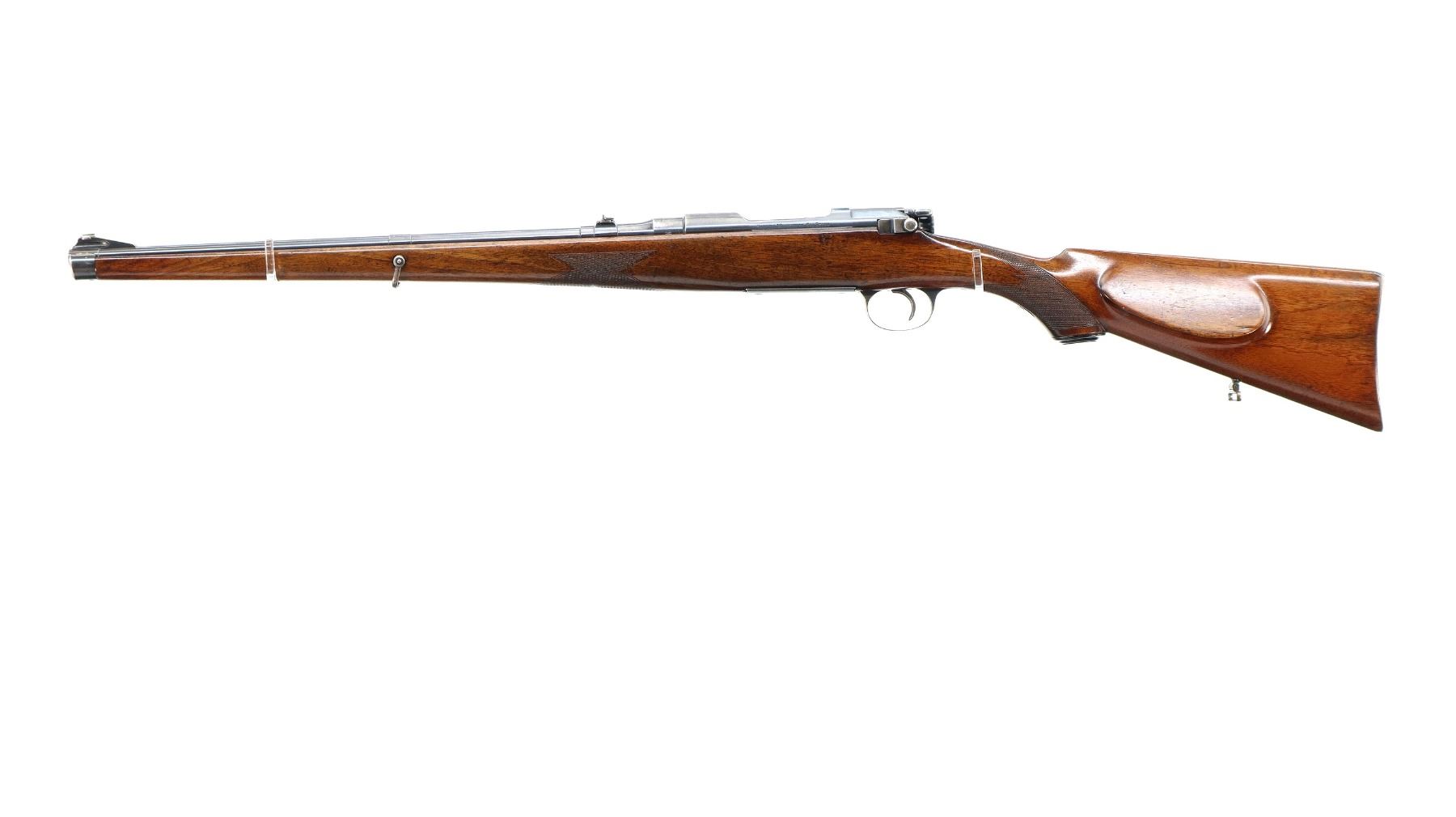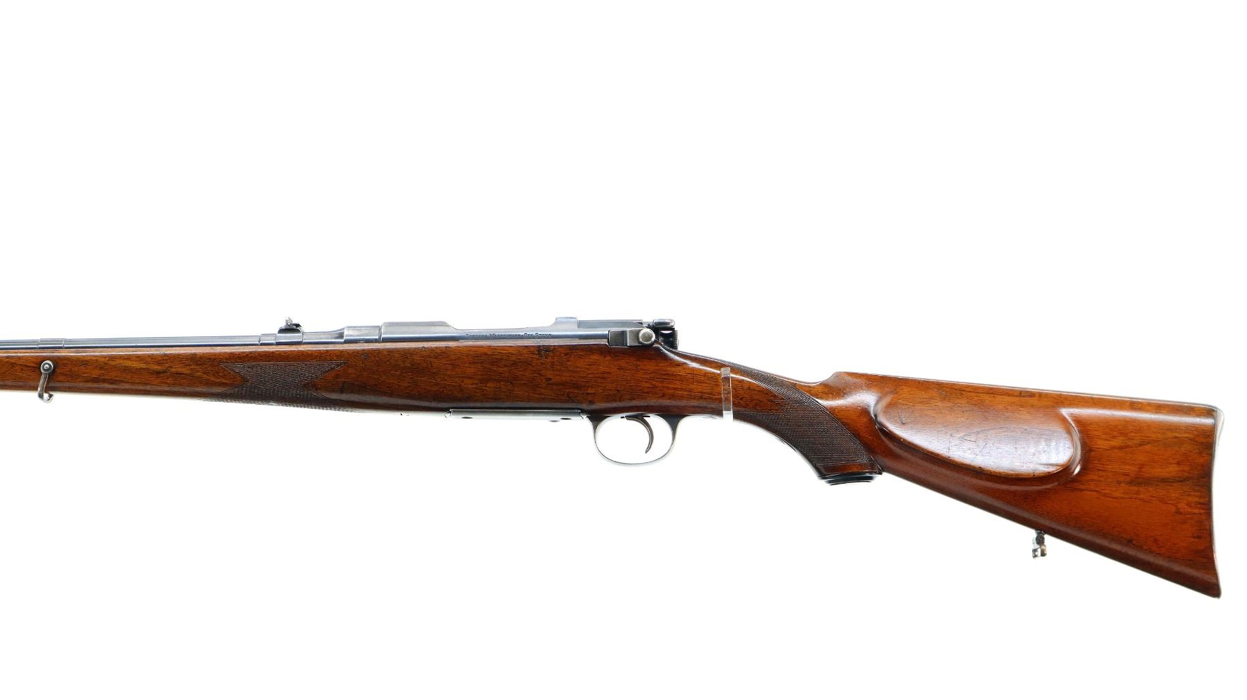 Main Description: Blade front sight with ramp, adjustable u notched rear sight with one fixed and one folding leaf, blued finish, butter knife bolt handle. One piece full length Mannlicher stock, checkered forearm and pistol grip, European cheek rest, grooved steel butt plate with trap, grip cap, sling swivels, steel nose cap.